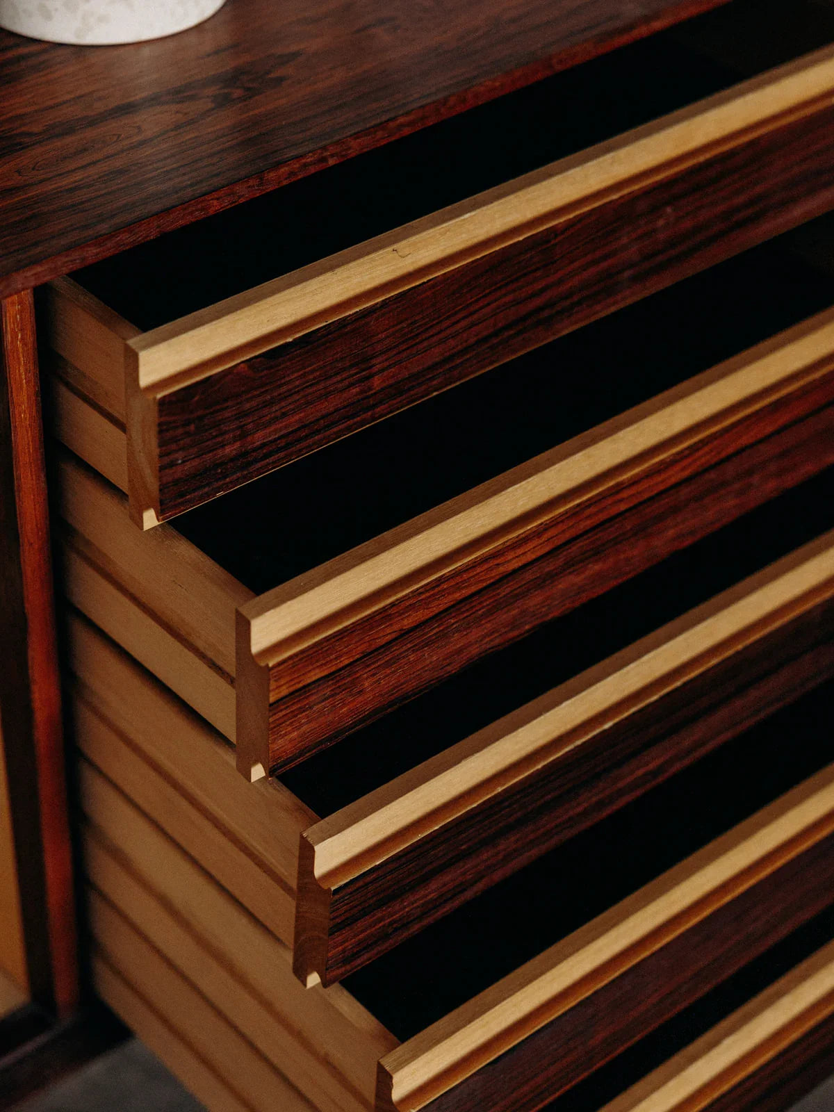 Alerte pièce rare ! Craquez pour cette enfilade scandinave en palissandre de Rio, signée Fredrik A. Kayser, datant des années 1960. Elle dispose de 5 tiroirs et 3 étagères (dont 2 en bois et une en verre modulable. Une pièce unique, parfaite pour sublimer un salon ou une salle à manger. Les petites poignées rondes, qui se verrouillent comme des clés, permettent de fermer complètement le meuble. Son sublime plateau, ses belles finitions sur les portes et son piétement haut et fin ajoutent à son élégance.