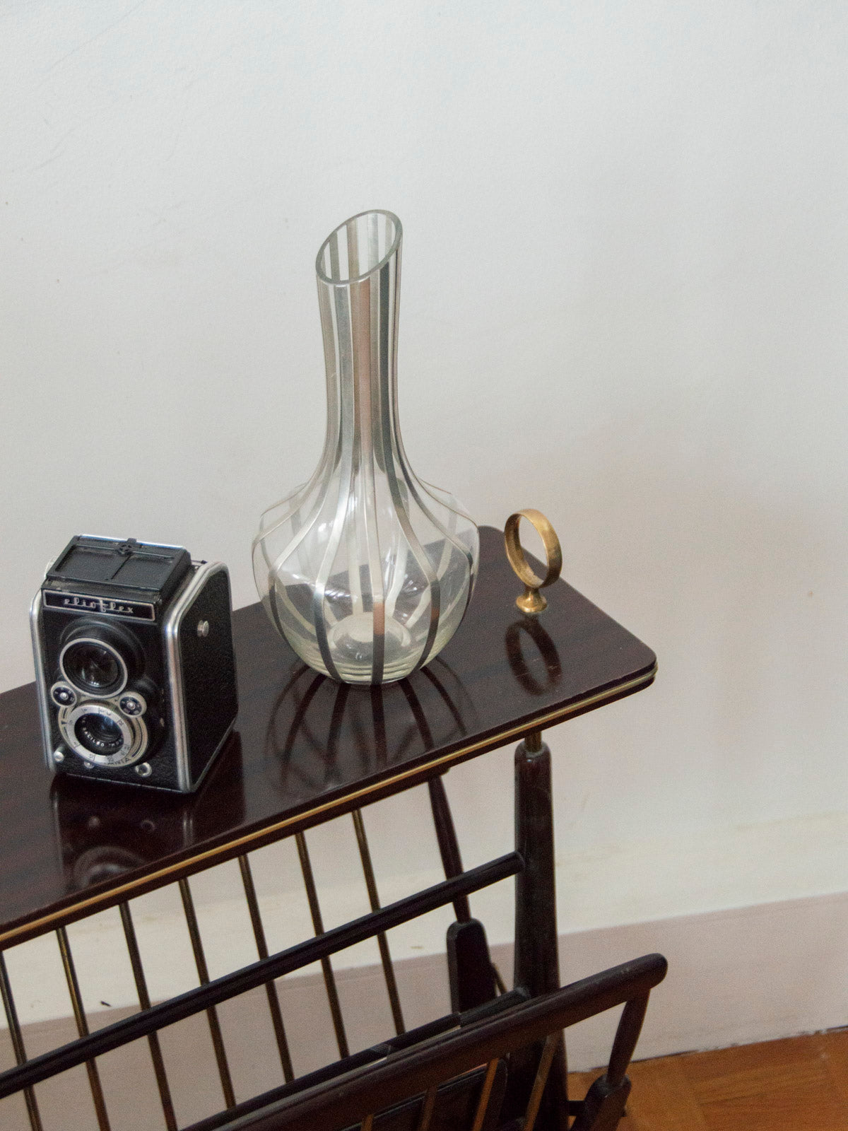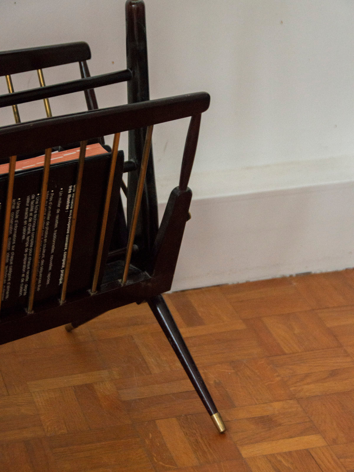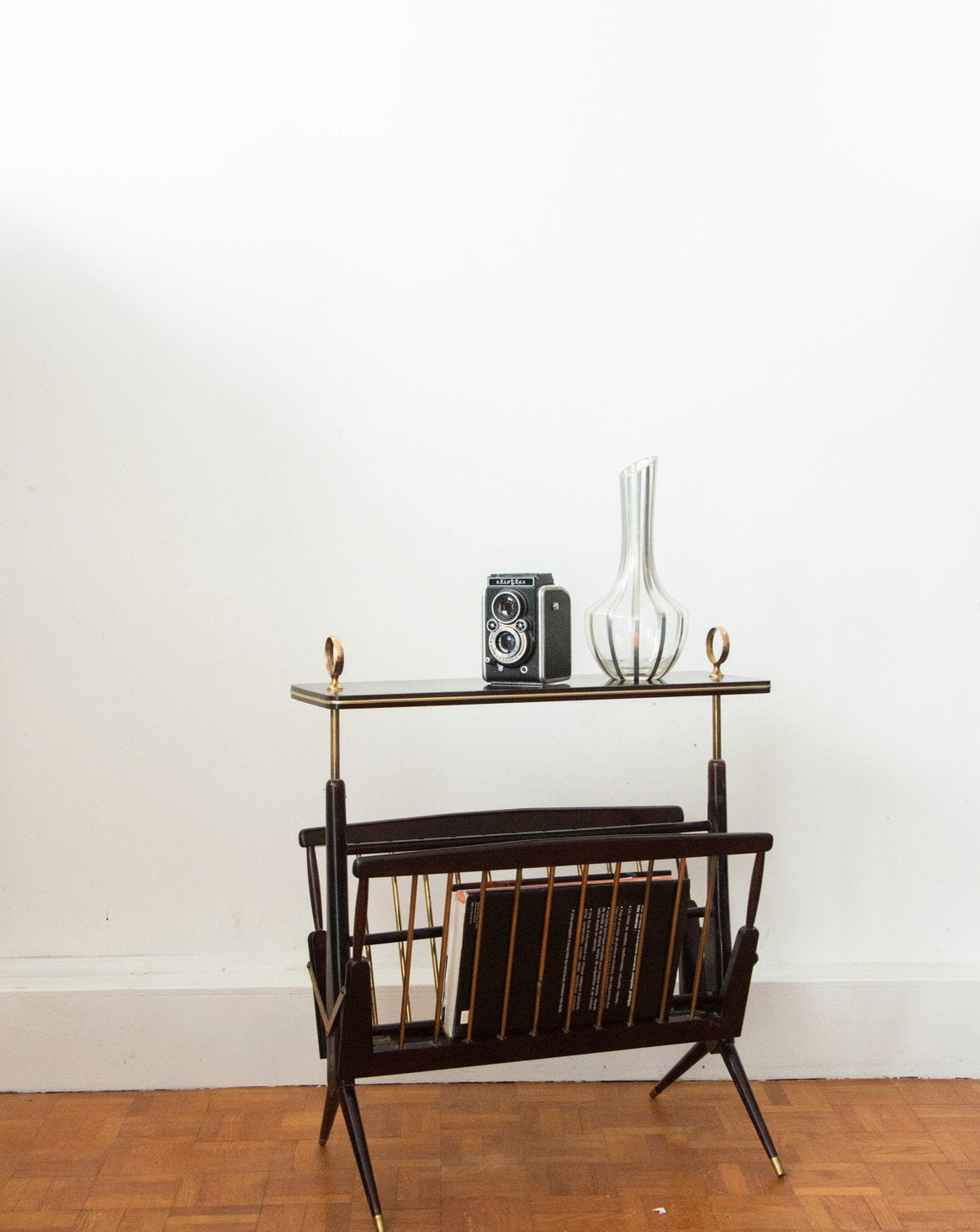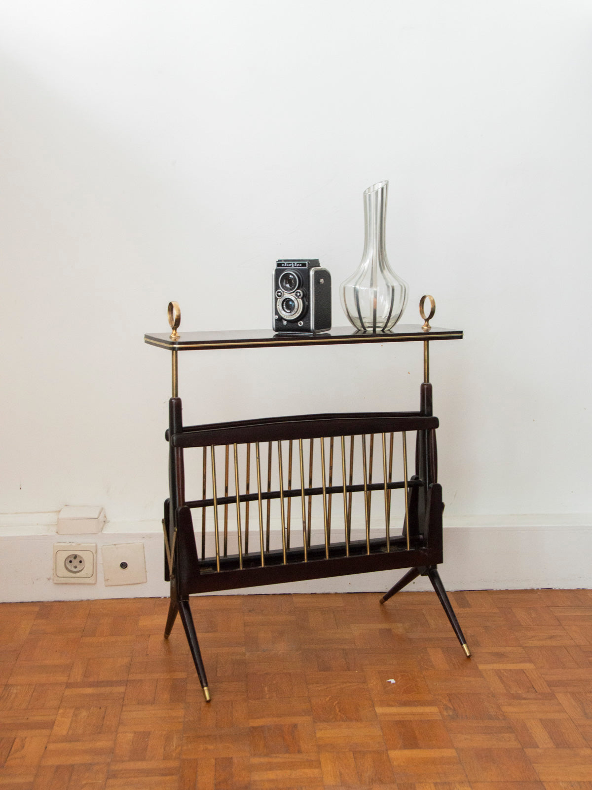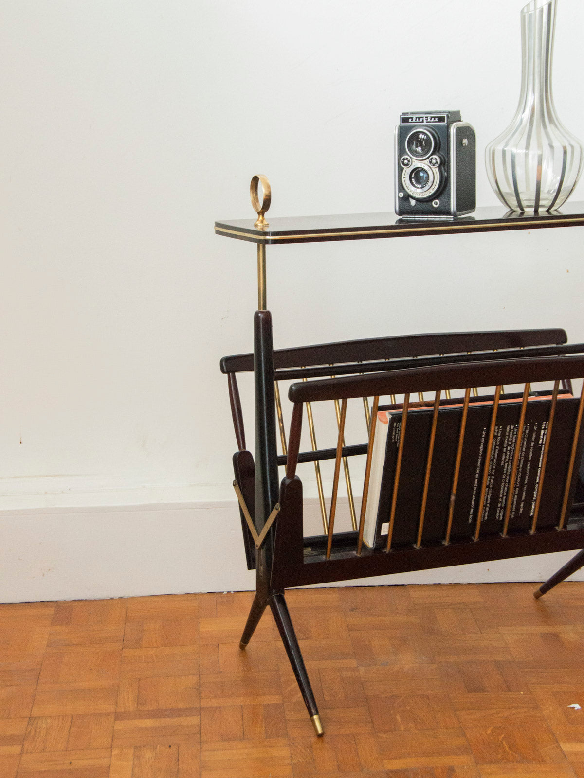 Adoptez ce porte-revues pliable du designer italien Césare Lacca, réalisé en acajou et laiton, souligné de petits pieds évasés et de jolies poignées rondes. Son gabarit compact mais solide accueille plusieurs magazines et se déploie facilement pour un accès pratique, sa construction lourde assurant stabilité et tenue dans le temps. Idéal près d'un fauteuil de lecture ou dans une entrée, il apporte une touche élégante et chaleureuse, entre design mid-century et utilité contemporaine.