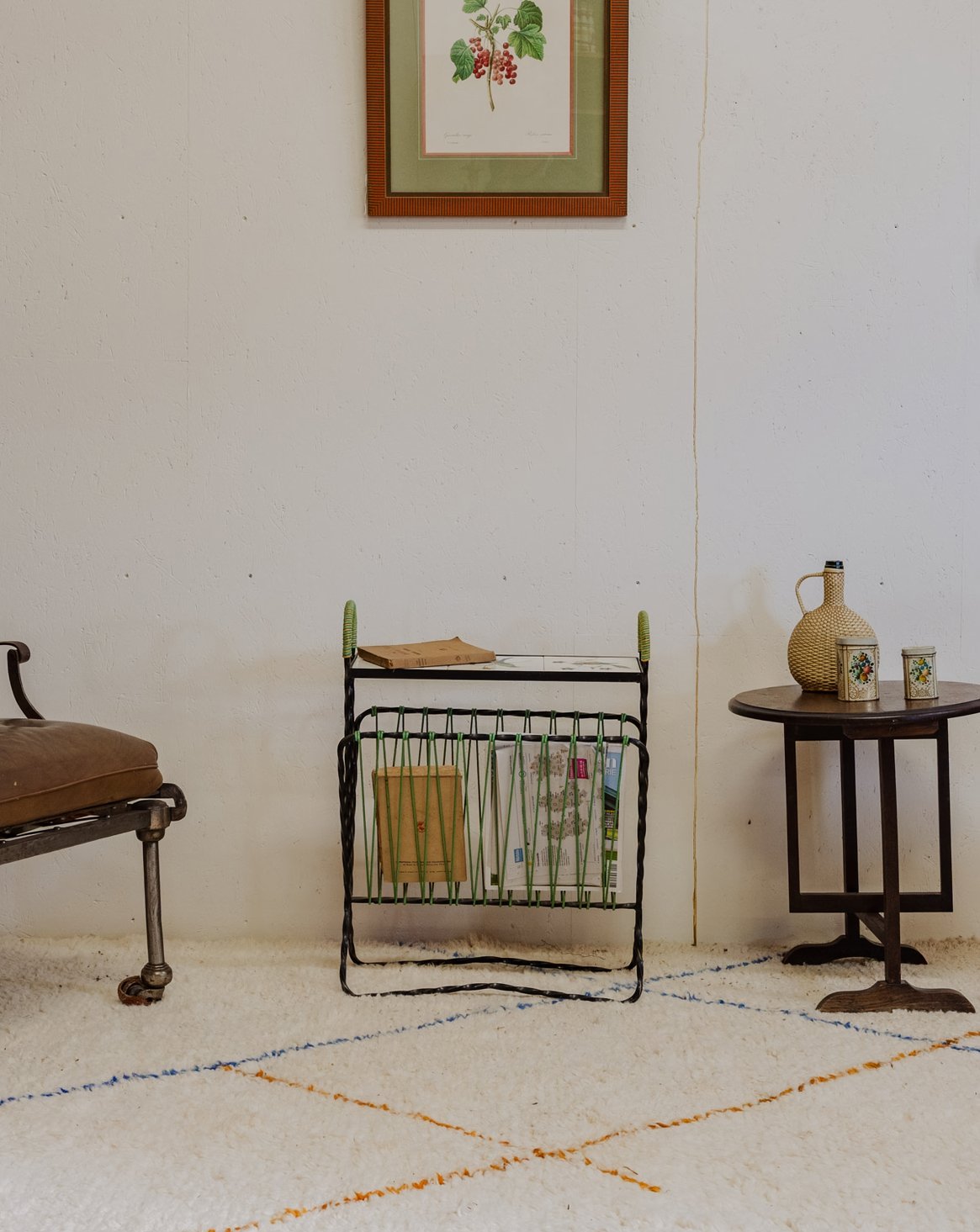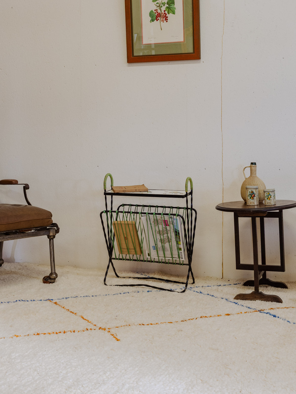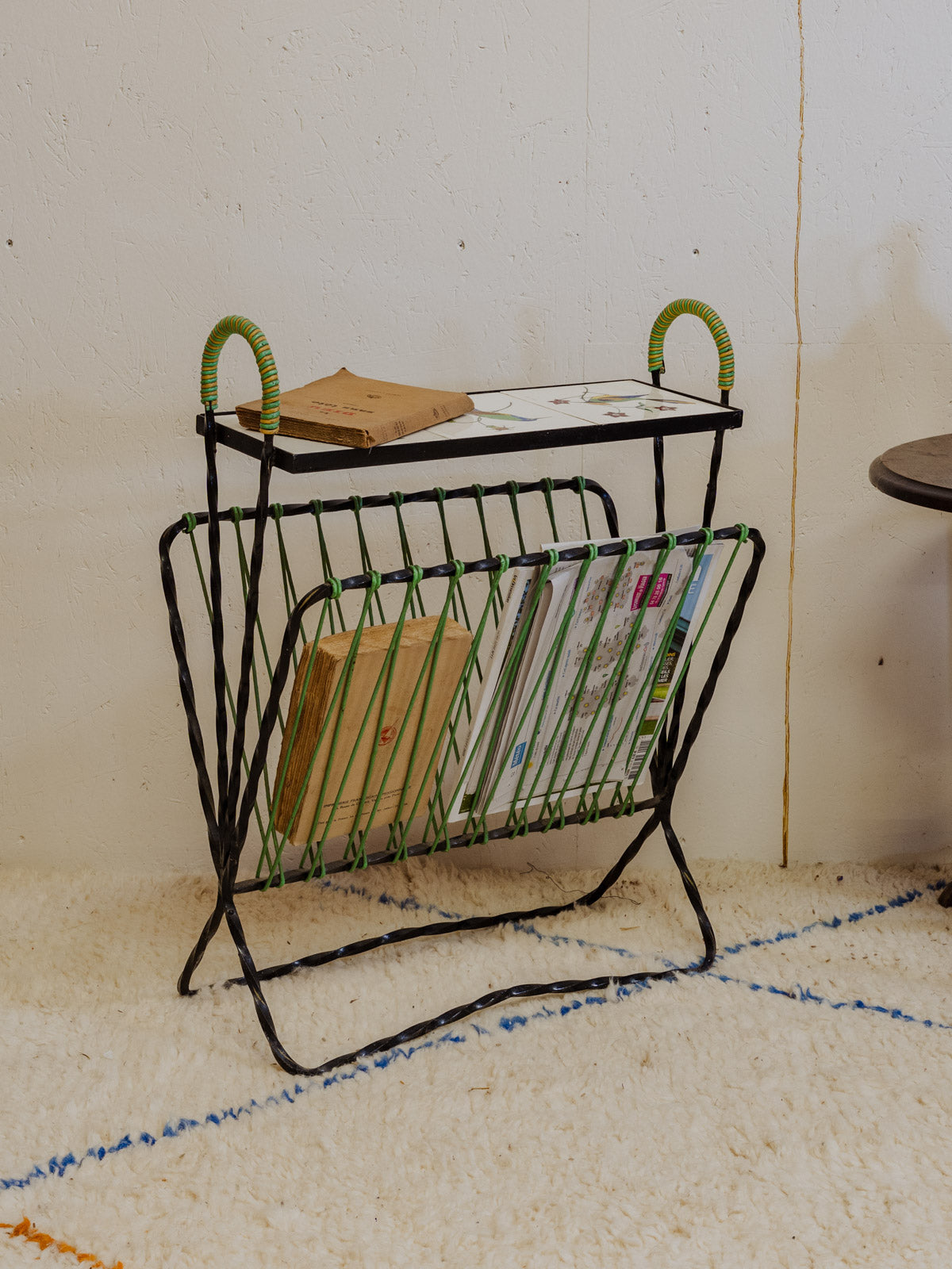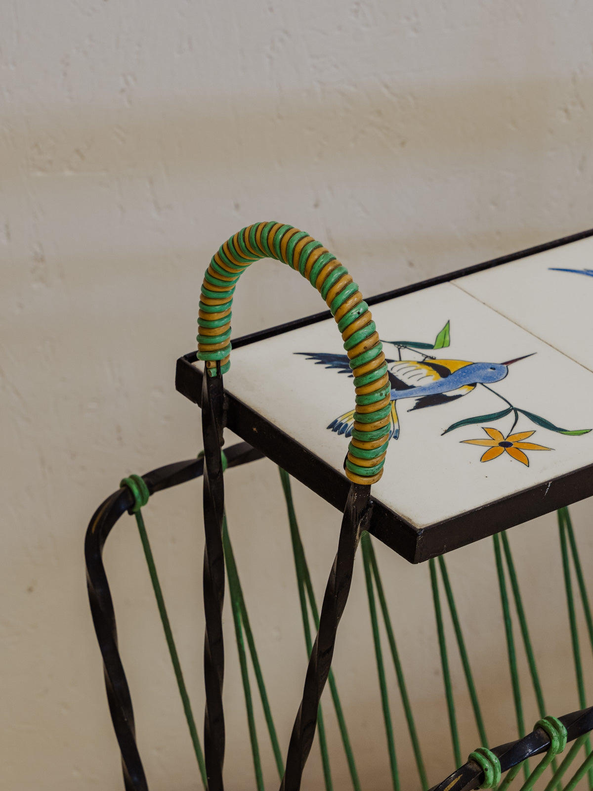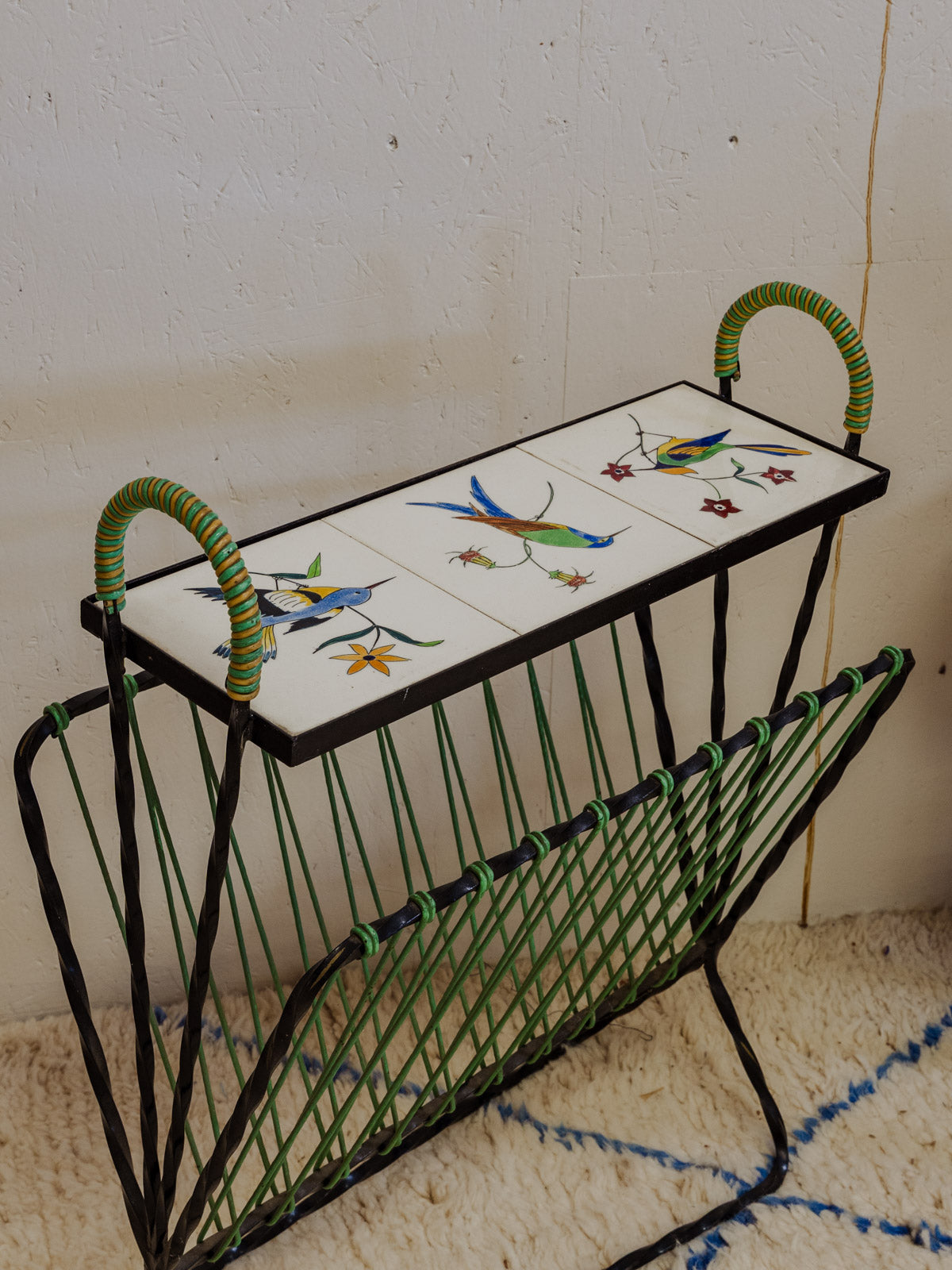 Apportez une touche vintage et poétique à votre intérieur avec ce porte-revue alliant céramique, scoubidou vert et métal noir. Son plateau en céramique blanche orné d'oiseaux accueille objets décoratifs ou une tasse, tandis que la grille en scoubidou forme un écrin respirant pour magazines et journaux. La structure métallique dessine une silhouette élancée, idéale près d'un fauteuil ou dans une entrée. Quelques traces du temps présentes.