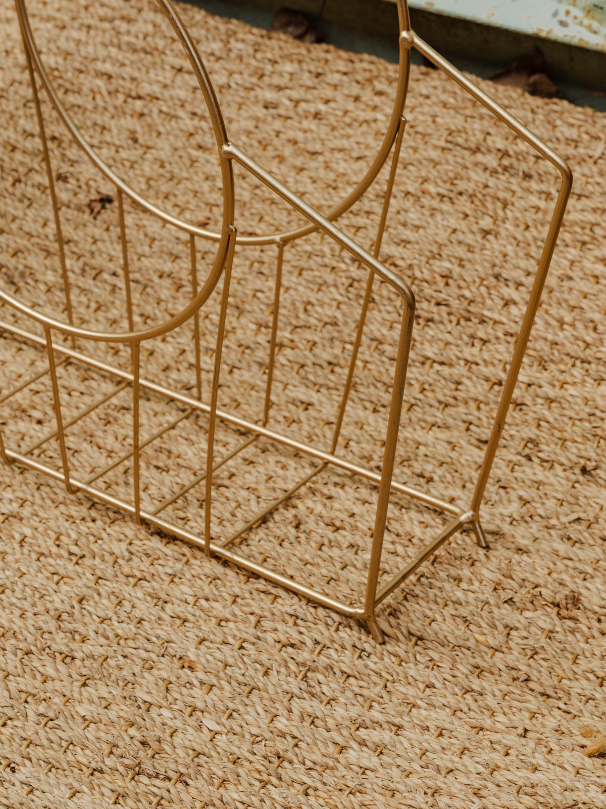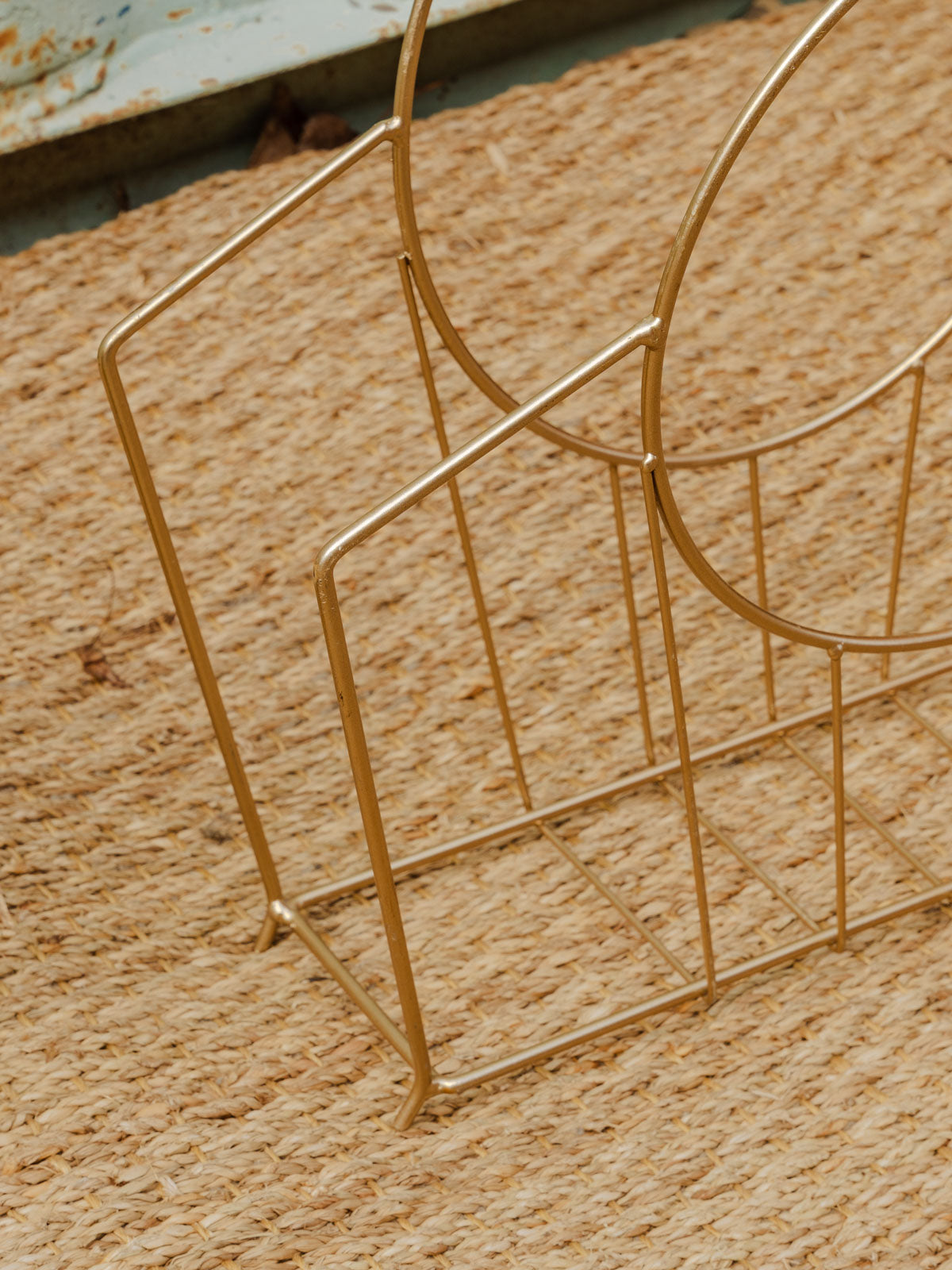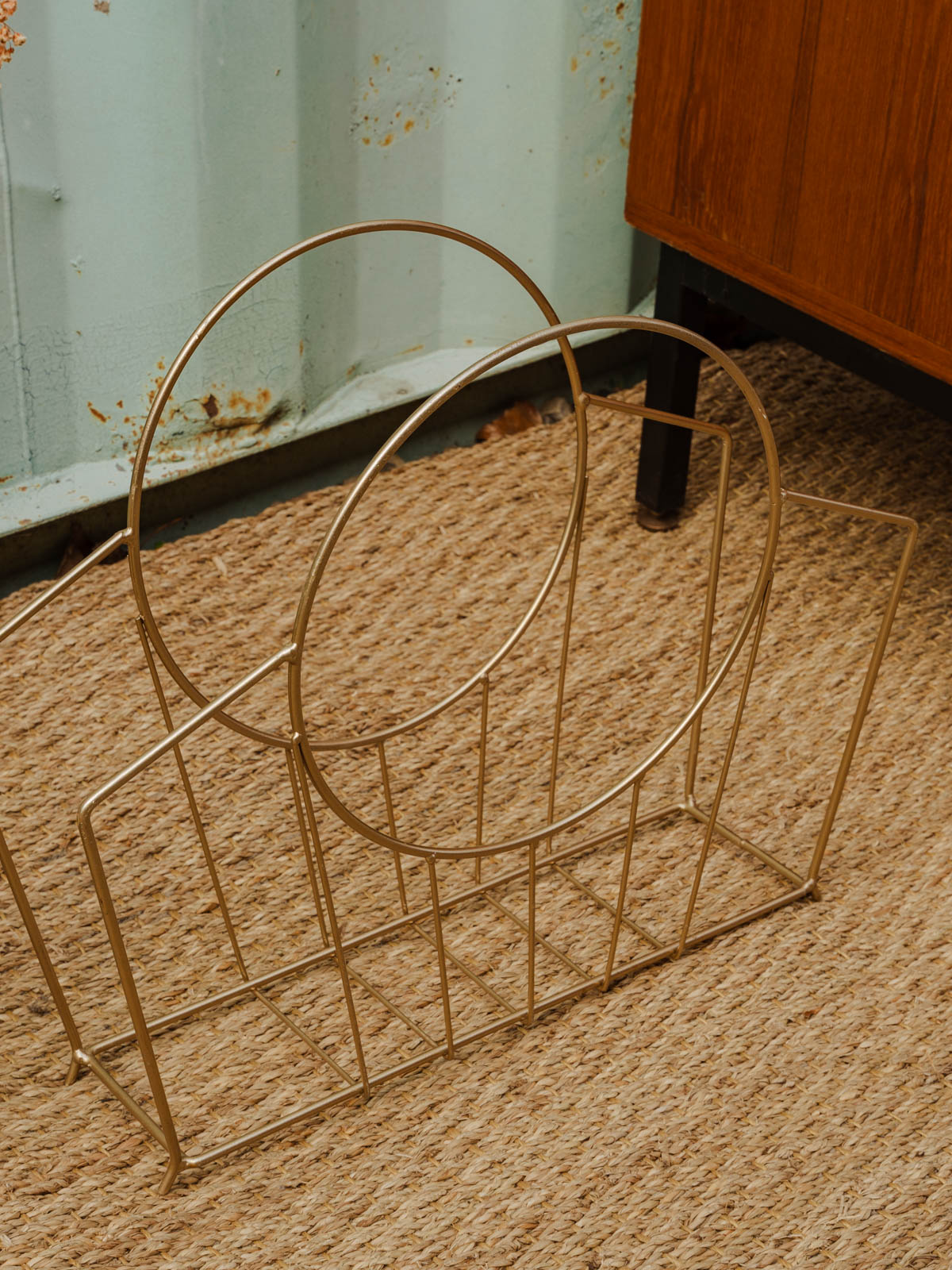 Adoptez ce porte-revue vintage doré en métal aux lignes arrondies et au motif en grillage, qui apporte une touche rétro à votre intérieur. Sa silhouette et son volume accueillent journaux et magazines sans alourdir un coin lecture ou une entrée. Le métal doré capte la lumière et dégage une chaleur subtile, créant une atmosphère graphique et raffinée idéale pour un salon ou un espace de travail élégant.