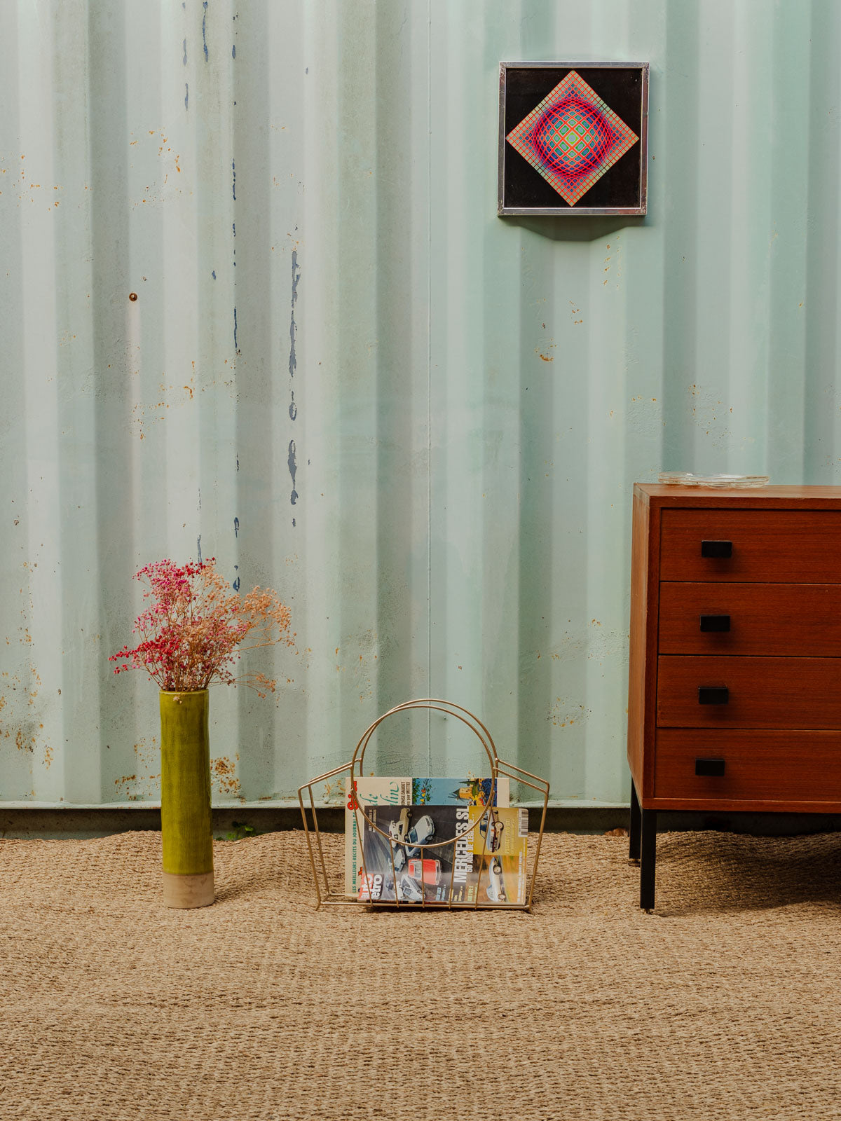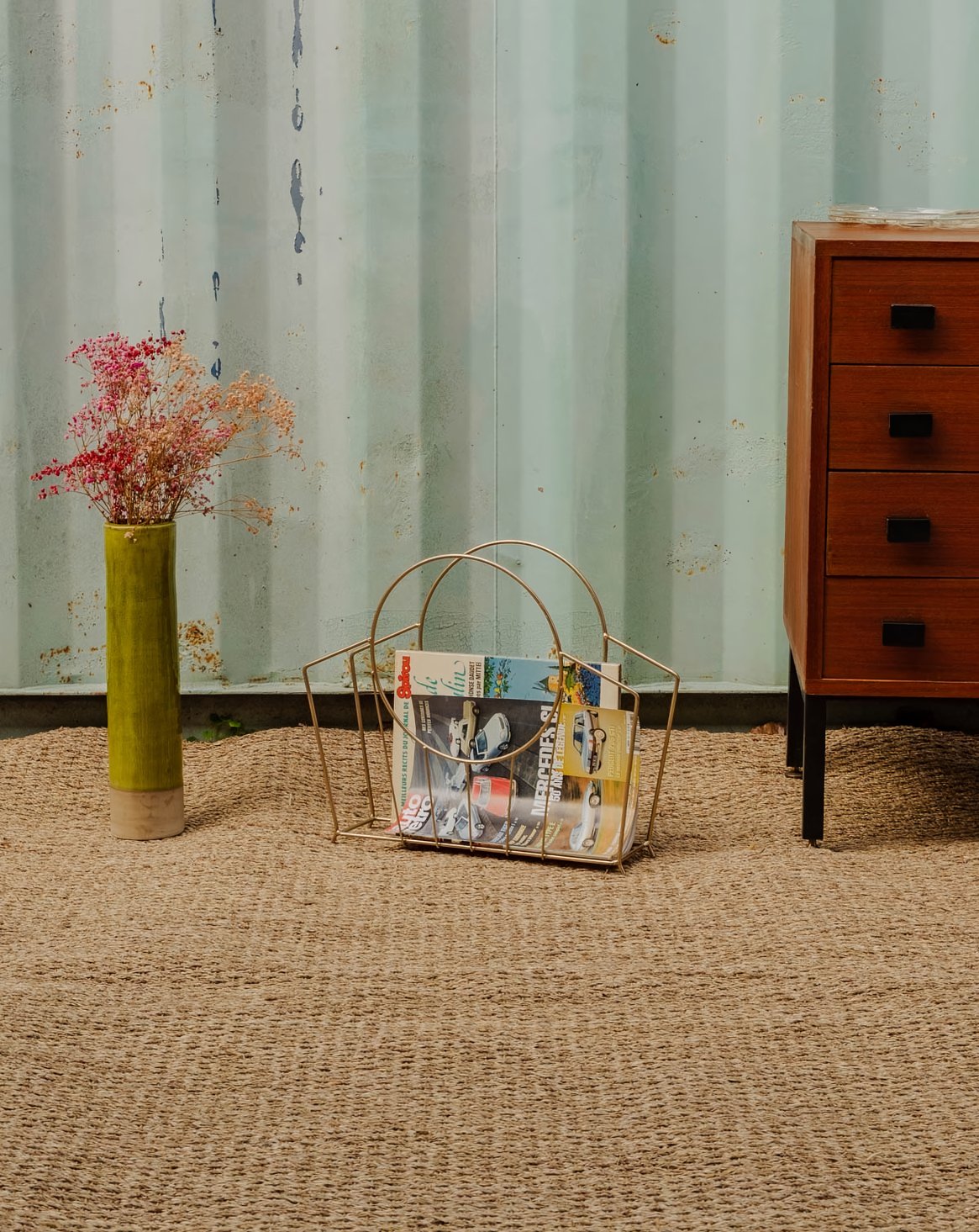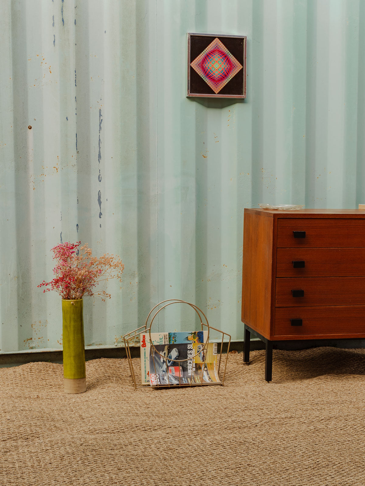 Adoptez ce porte-revue vintage doré en métal aux lignes arrondies et au motif en grillage, qui apporte une touche rétro à votre intérieur. Sa silhouette et son volume accueillent journaux et magazines sans alourdir un coin lecture ou une entrée. Le métal doré capte la lumière et dégage une chaleur subtile, créant une atmosphère graphique et raffinée idéale pour un salon ou un espace de travail élégant.