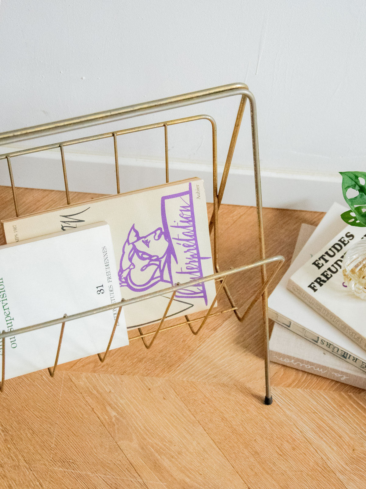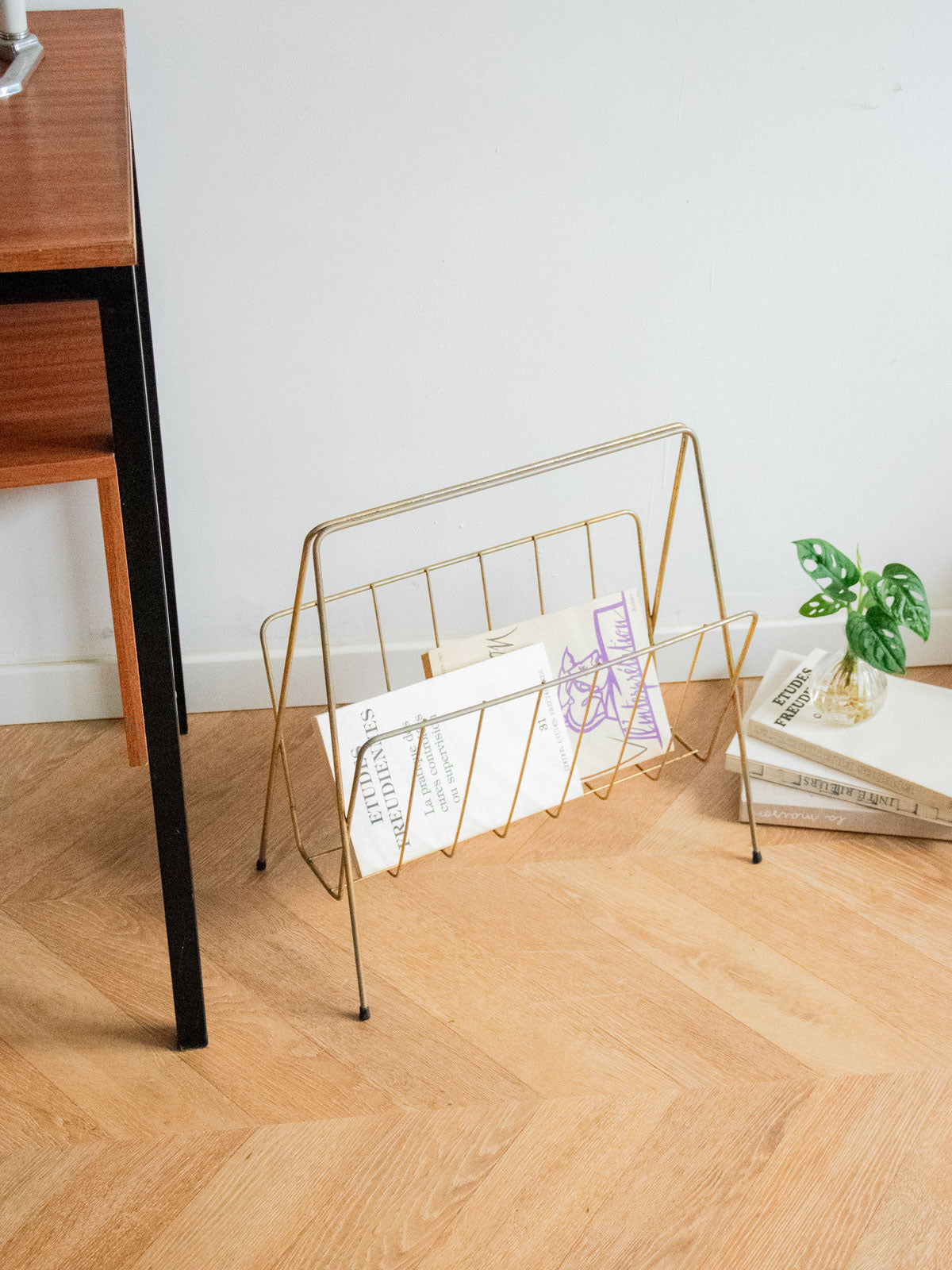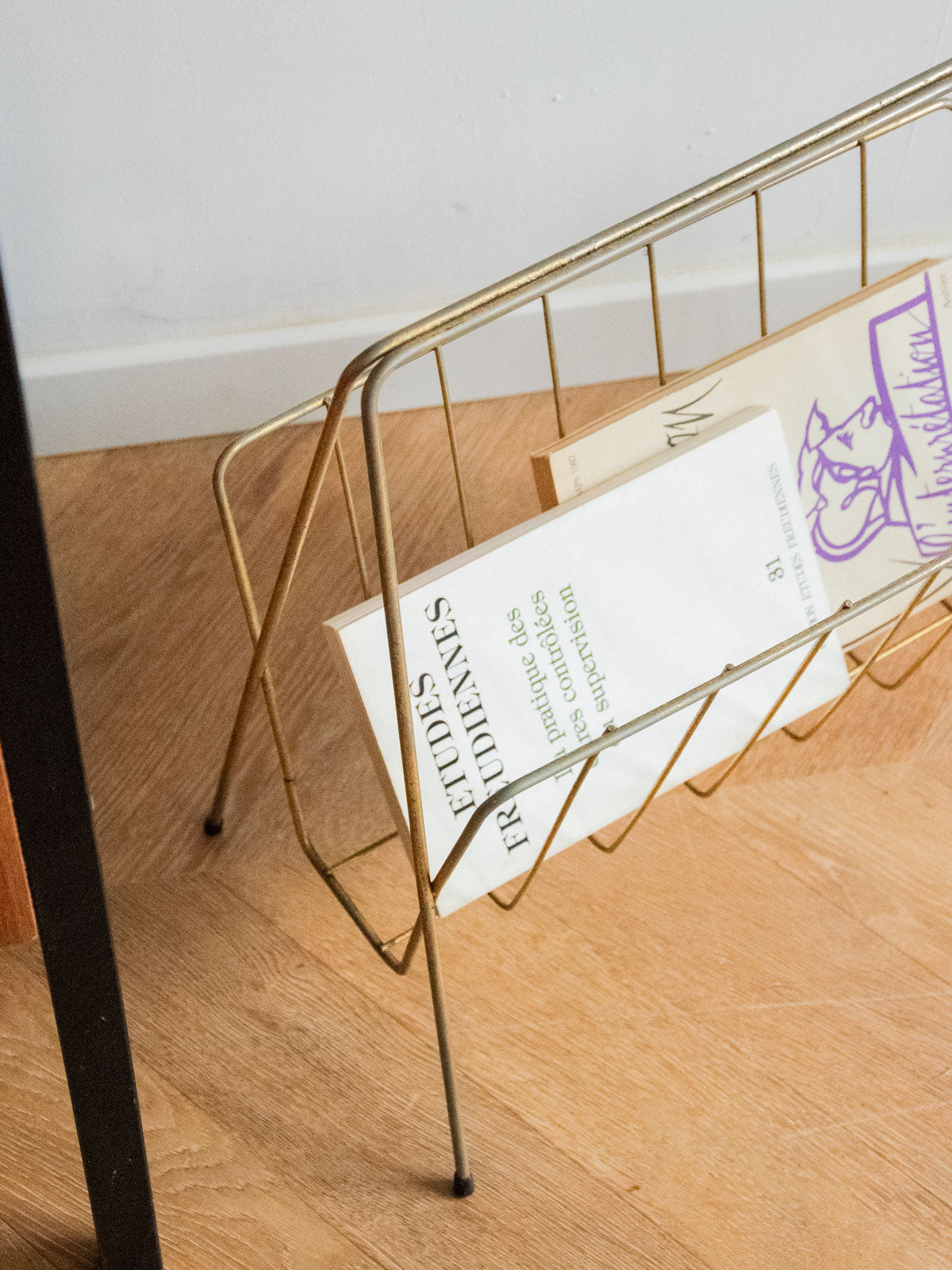 Adoptez ce porte-revues en métal argenté au design sobre et graphique, reposant sur des pieds plastifiés qui protègent le sol; sa silhouette verticale et son faible encombrement accueillent magazines et journaux avec élégance, idéale près d'un canapé, d'un bureau ou dans une entrée lumineuse. Le métal apporte une note contemporaine facile à entretenir et ses proportions compactes optimisent le rangement sans alourdir l'espace. Légères traces de rouille présentes.