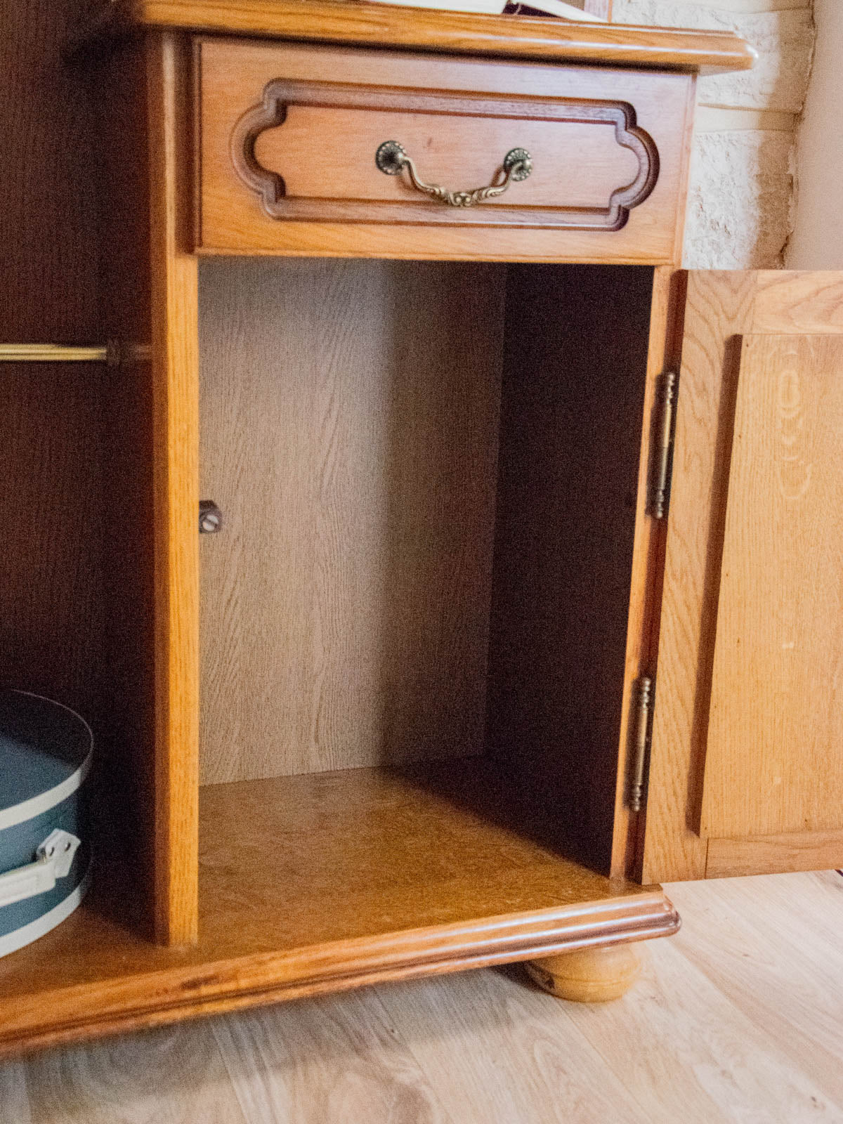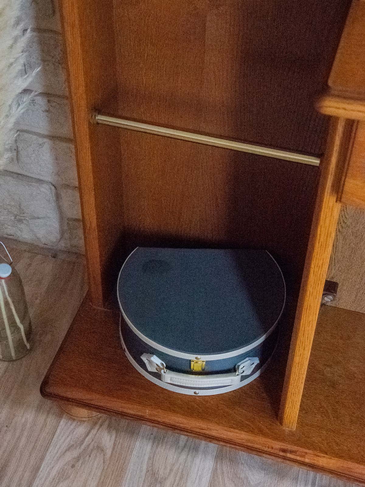 Invitez une allure chaleureuse dans votre entrée avec ce porte-manteau en bois clair, rehaussé de quatre patères en laiton et d’un grand miroir qui amplifie la luminosité; son tiroir discret, son petit placard et le compartiment à parapluies offrent un rangement structuré pensé pour les proportions d’un espace d’accueil, tandis que l’association des matières crée un style sobre et élégant, parfait pour une ambiance organisée et accueillante. Une trace dans le fond du tiroir et légères traces du temps.