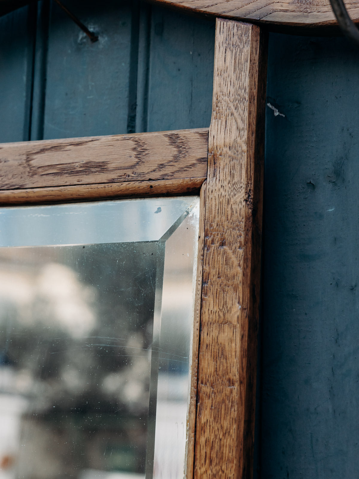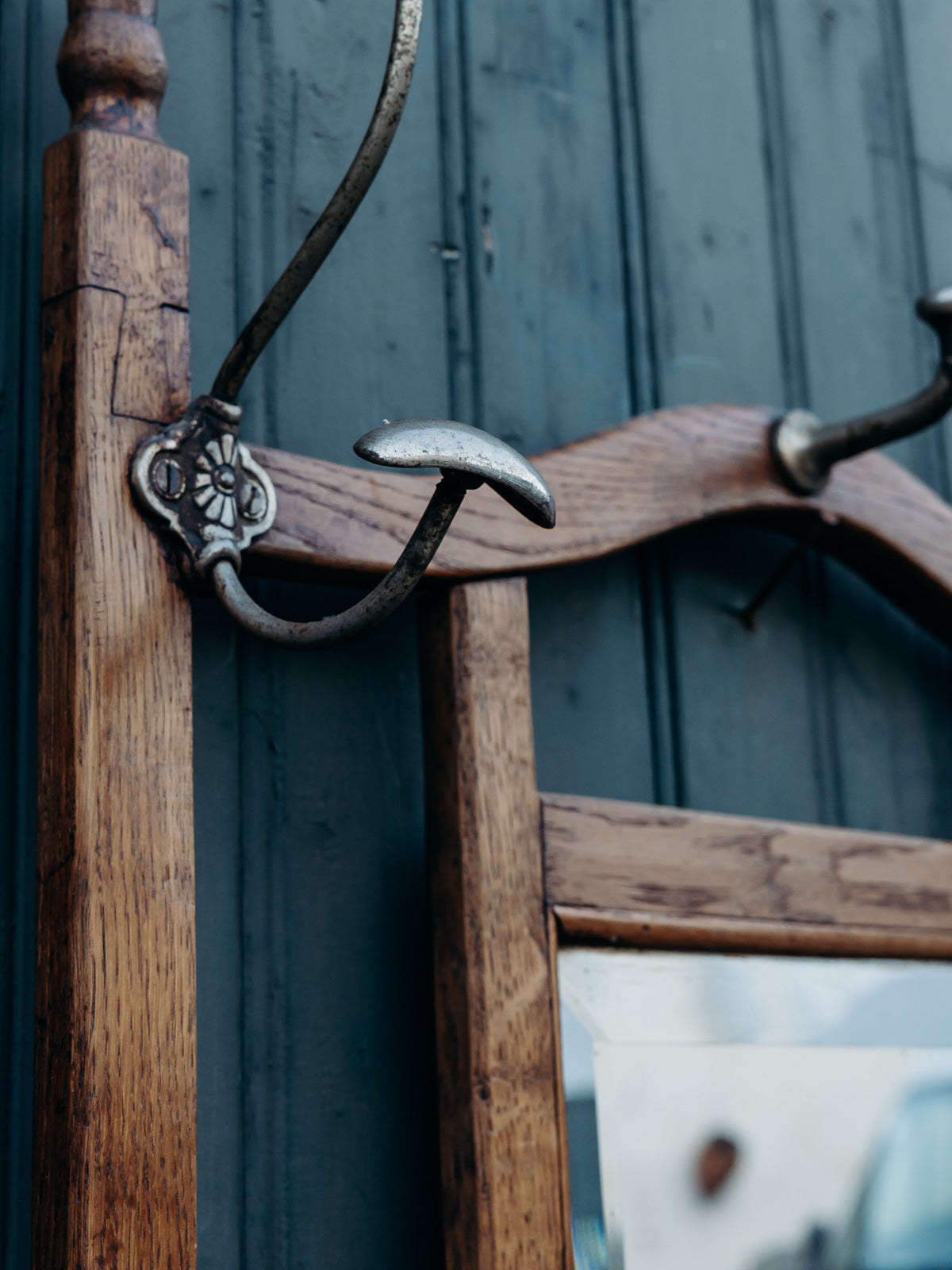 Adoptez ce porte-manteau / vestiaire haut en bois aux lignes élancées, équipé de six patères en métal qui allient robustesse et caractère; son petit miroir rectangulaire piqué apporte une touche d'authenticité et de lumière, tandis que son format vertical libère l'espace au sol — parfait pour manteaux longs et écharpes. Le mariage bois-métal instaure une ambiance chaleureuse et graphique dans l'entrée, facile à intégrer à un intérieur contemporain ou vintage. Miroir piqué témoignant de son histoire. Usures présentes.