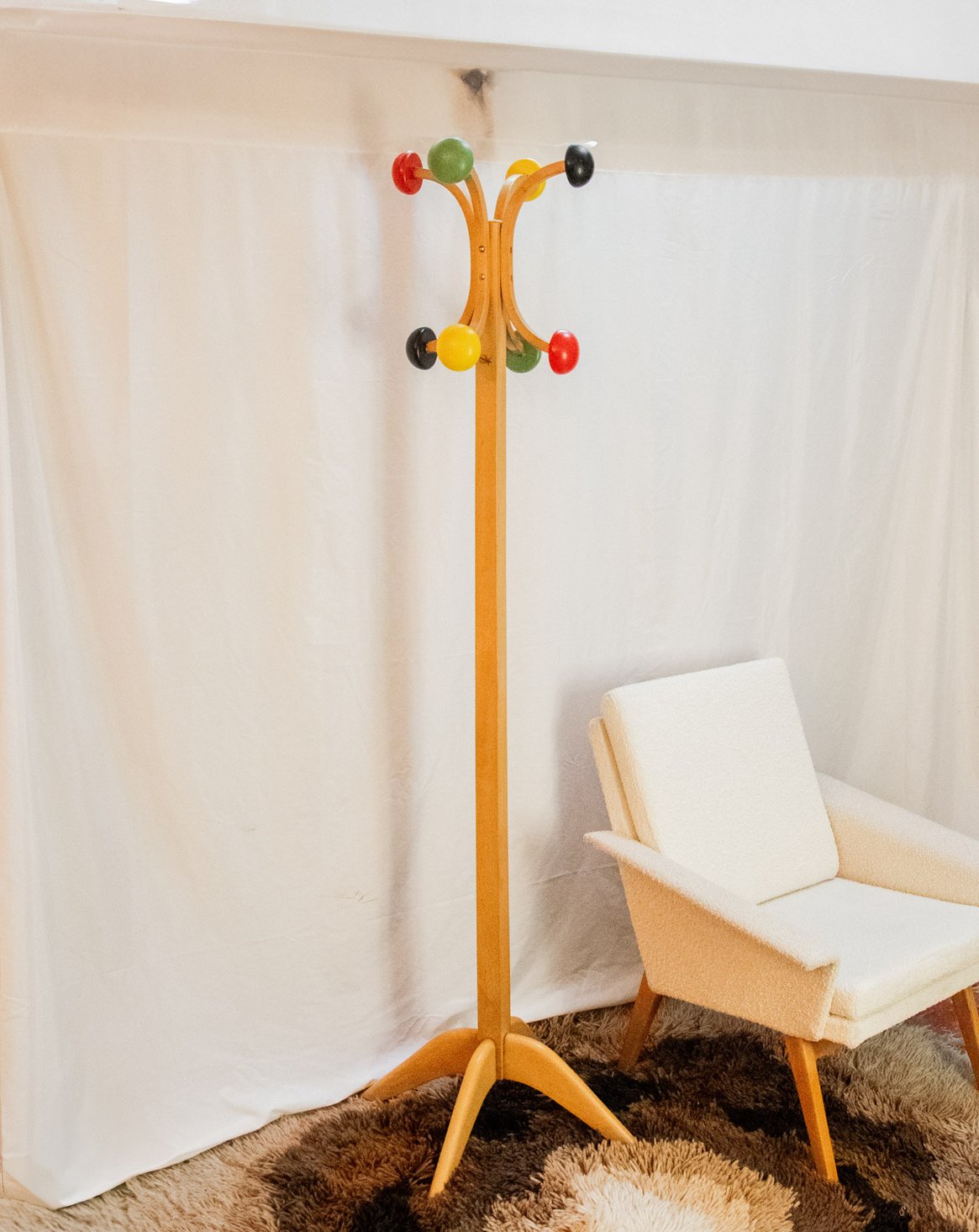 Adoptez ce porte-manteau en bois aux huit têtes colorées — jaune, rouge, vert et noir — qui apporte une note ludique et graphique à l'entrée. Sa structure en bois, aux proportions pensées pour accueillir manteaux, sacs et chapeaux, combine fonction et présence sculpturale. Inspiré du style Stella, il ponctue un intérieur sobre d'une touche rétro-moderne et chaleureuse, idéale pour un hall ou une chambre. Quelques marques d'usage qui font son authenticité.