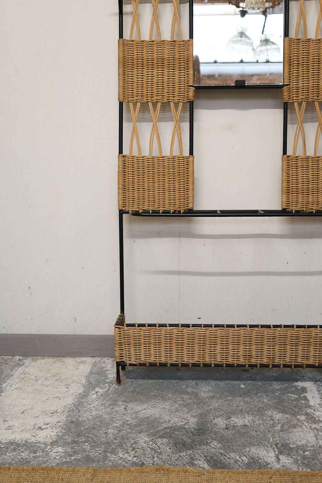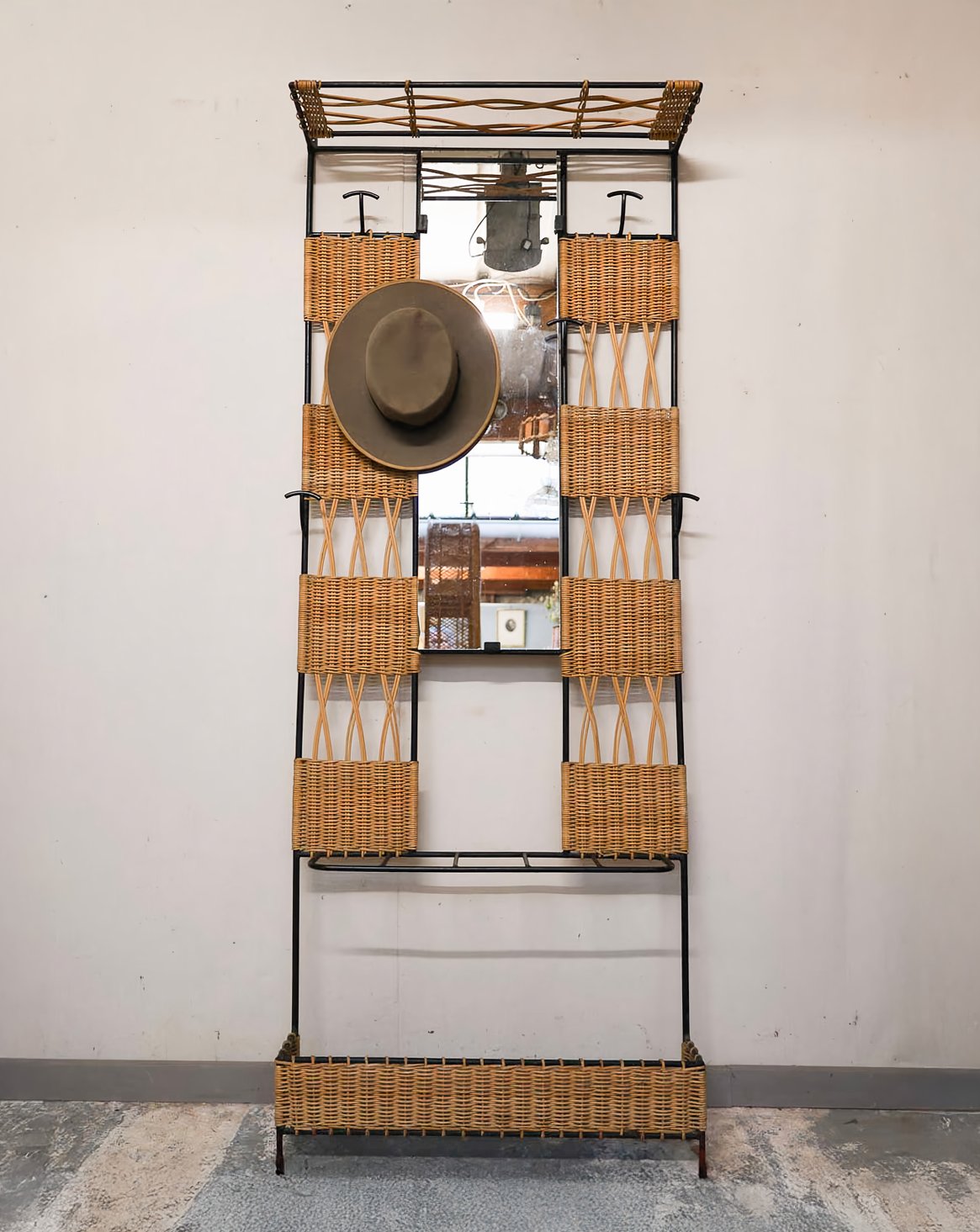 Adoptez ce grand porte‑manteau d'entrée mêlant métal et osier, aux proportions élancées qui s'intègre aisément dans une entrée étroite. Son étagère basse assure un rangement discret pour les chaussures tandis que cinq porte‑parapluies métalliques et six patères accueillent manteaux et accessoires; un miroir central apporte lumière et vue pratique, et un porte‑chapeau en hauteur complète son côté fonctionnel. L’alliance du métal et de l'osier lui confère une allure chaleureuse et structurée, idéale pour une ambiance naturelle et organisée.