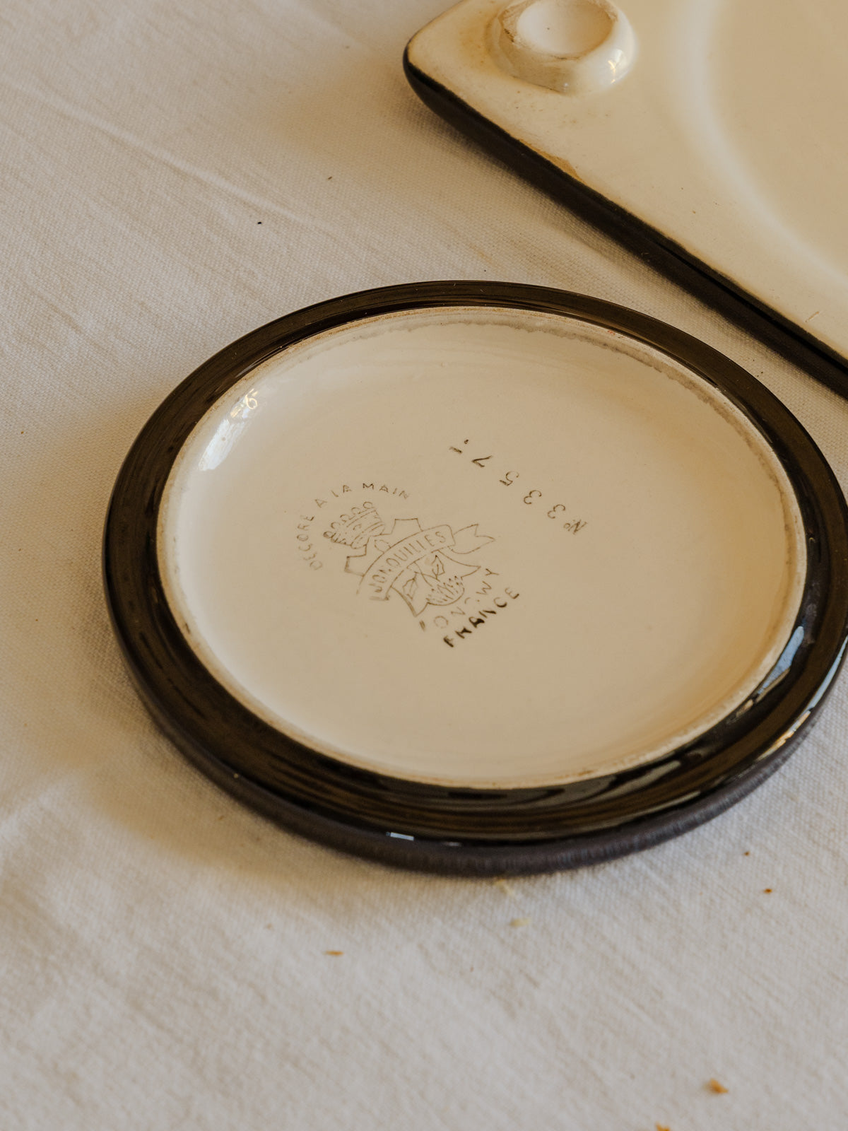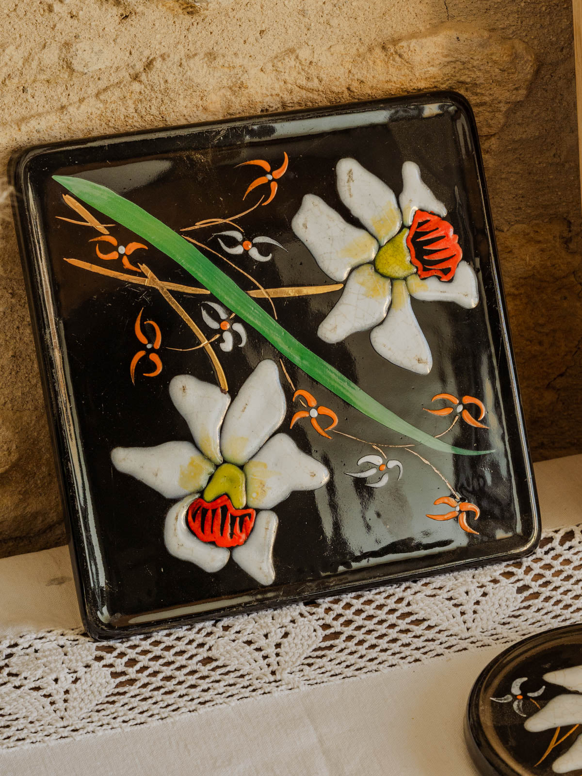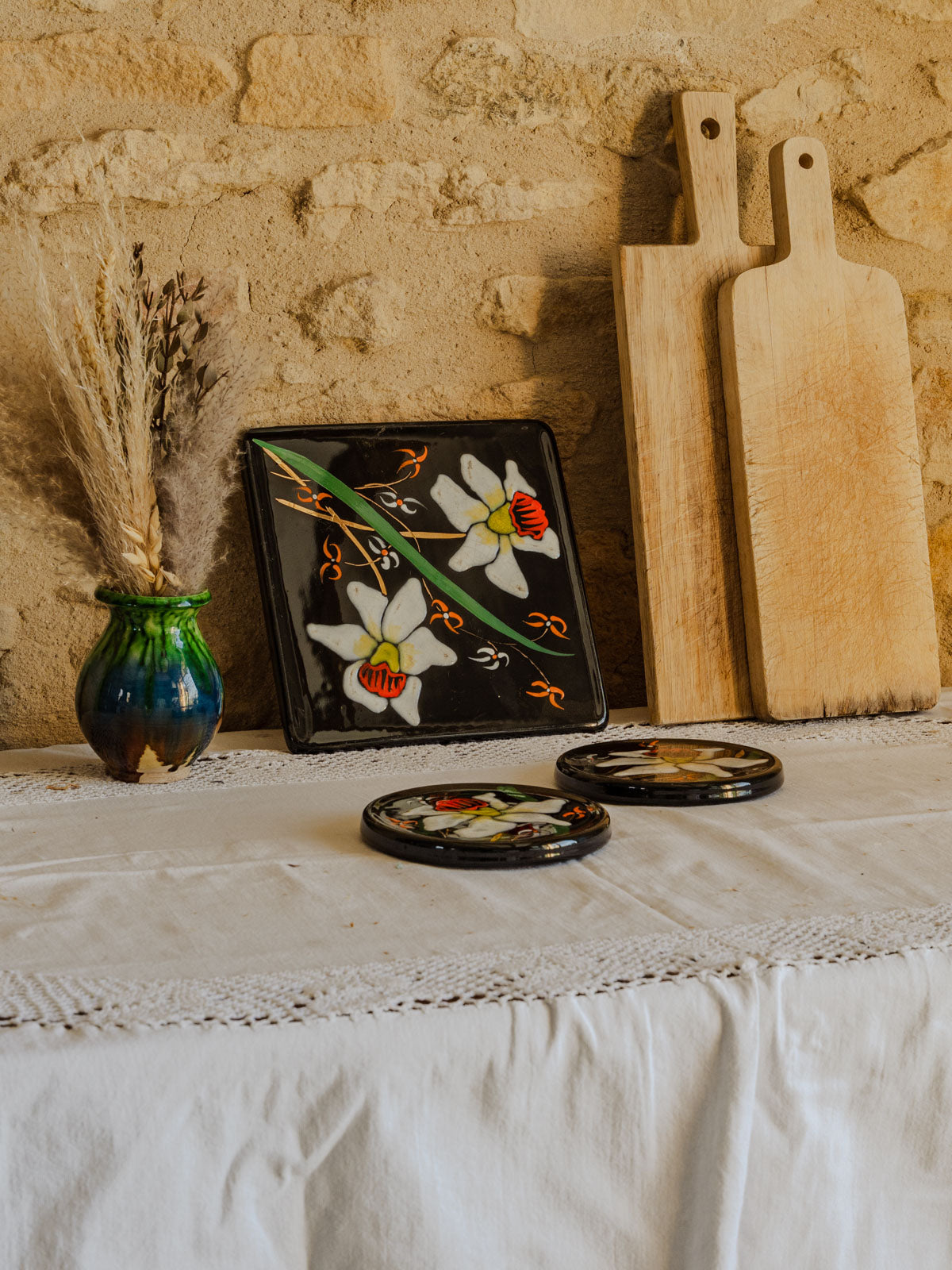 Découvrez cet ensemble de trois dessous de plats en faïence de Longwy en France, modèle Jonquilles, richement décoré à la main sur fond noir avec fleurs en verts, orangés et blanc. Deux formes rondes et un carré, aux proportions complémentaires, offrent une utilité polyvalente pour protéger et sublimer votre table — tasses, plats ou petits services — tout en apportant une touche artisanale et graphique à vos moments de partage. Un bel équilibre entre fonctionnalité et décoration.