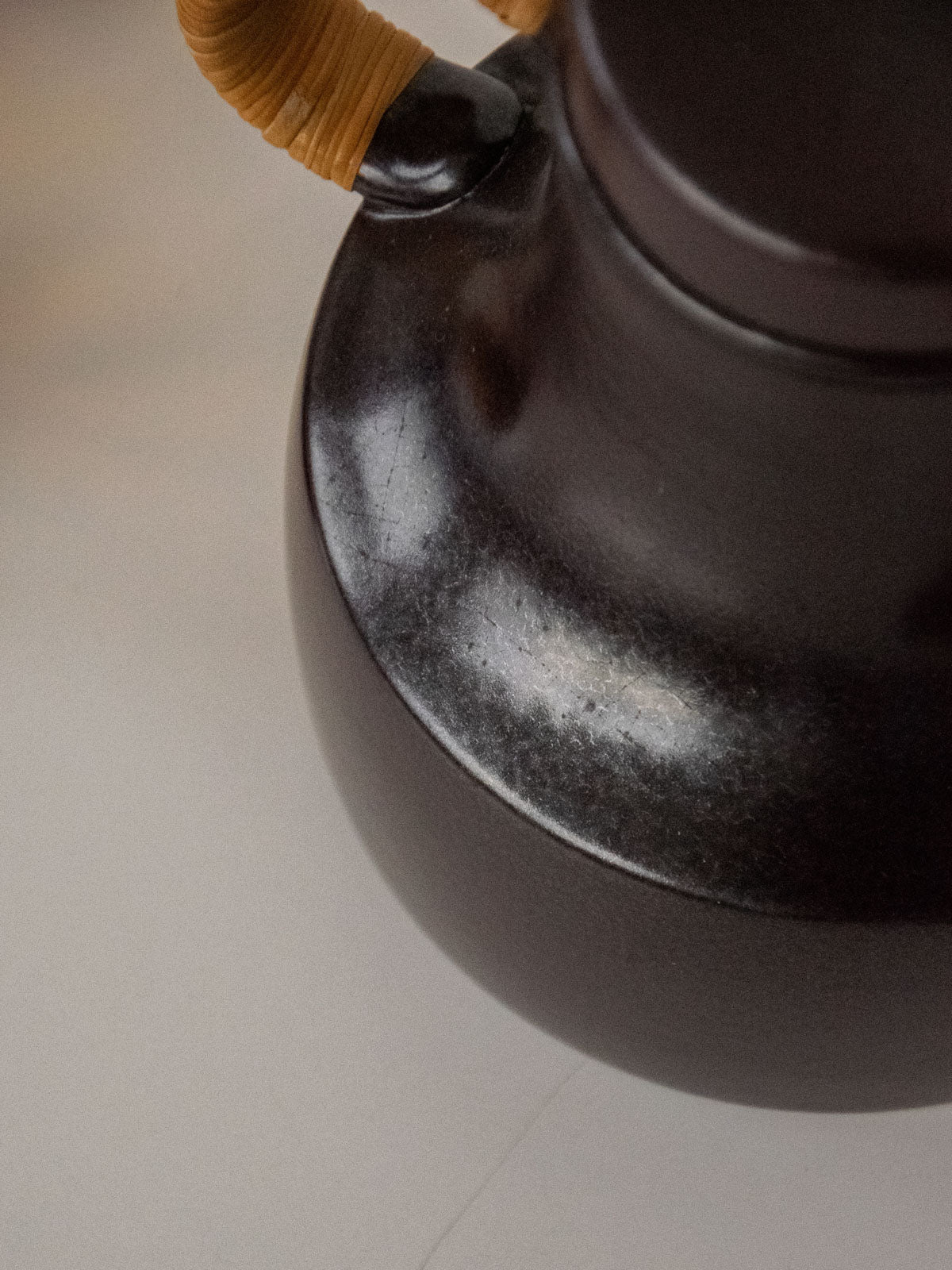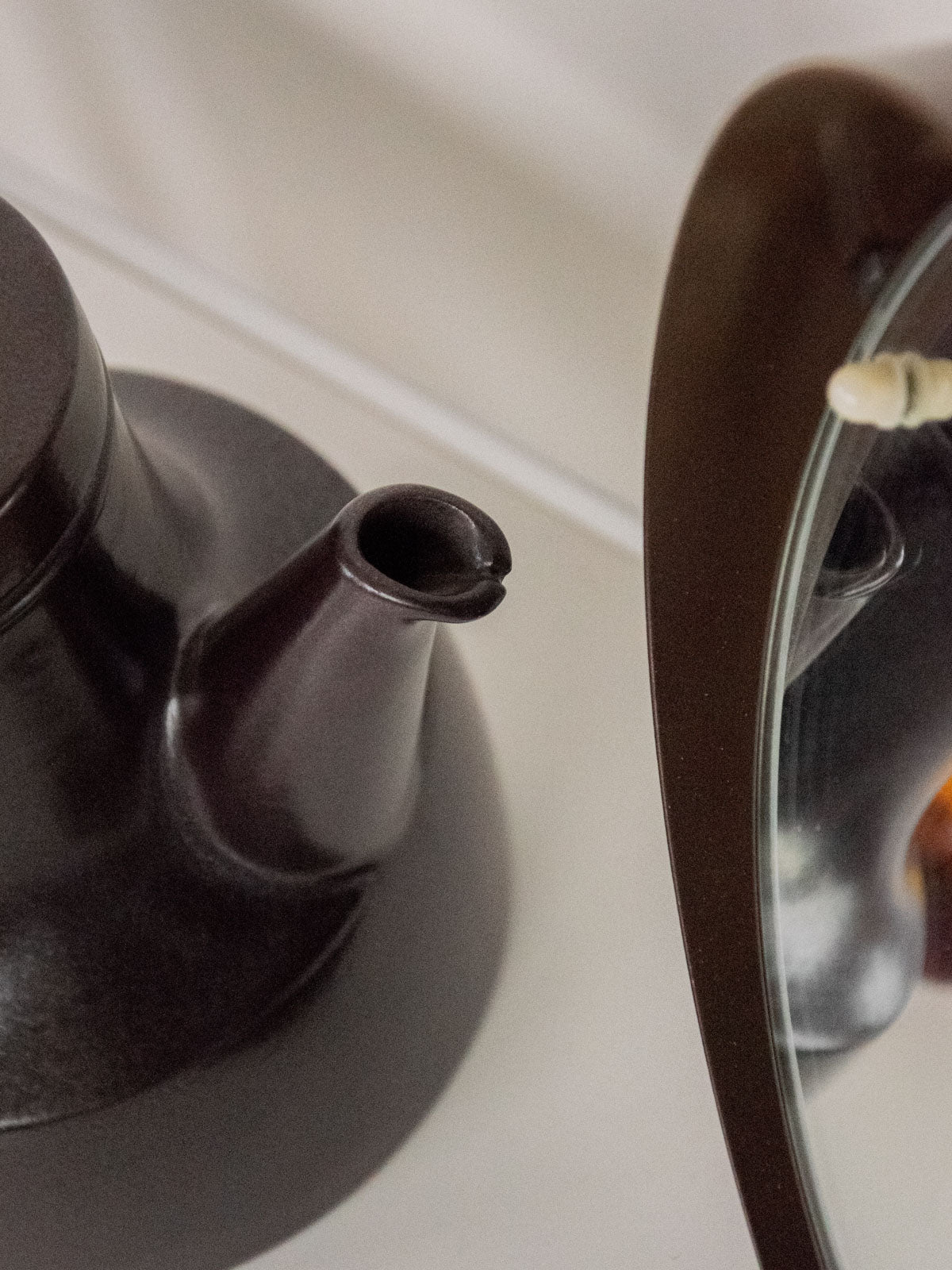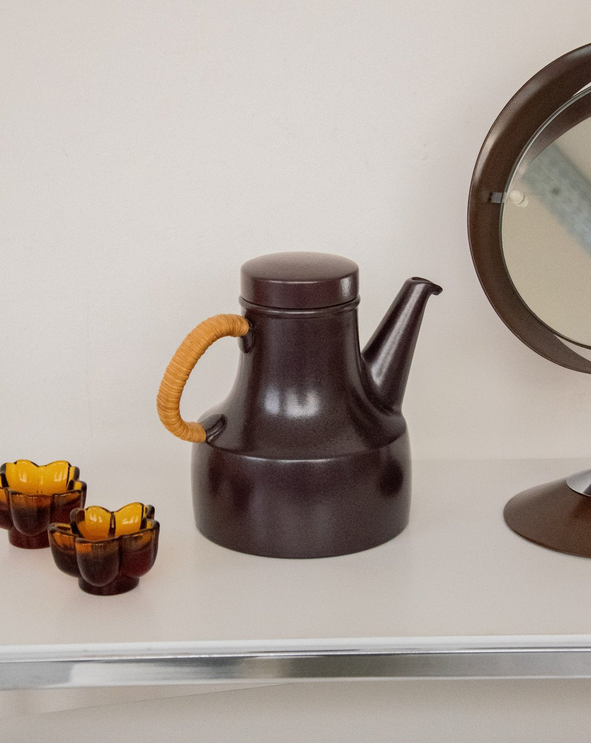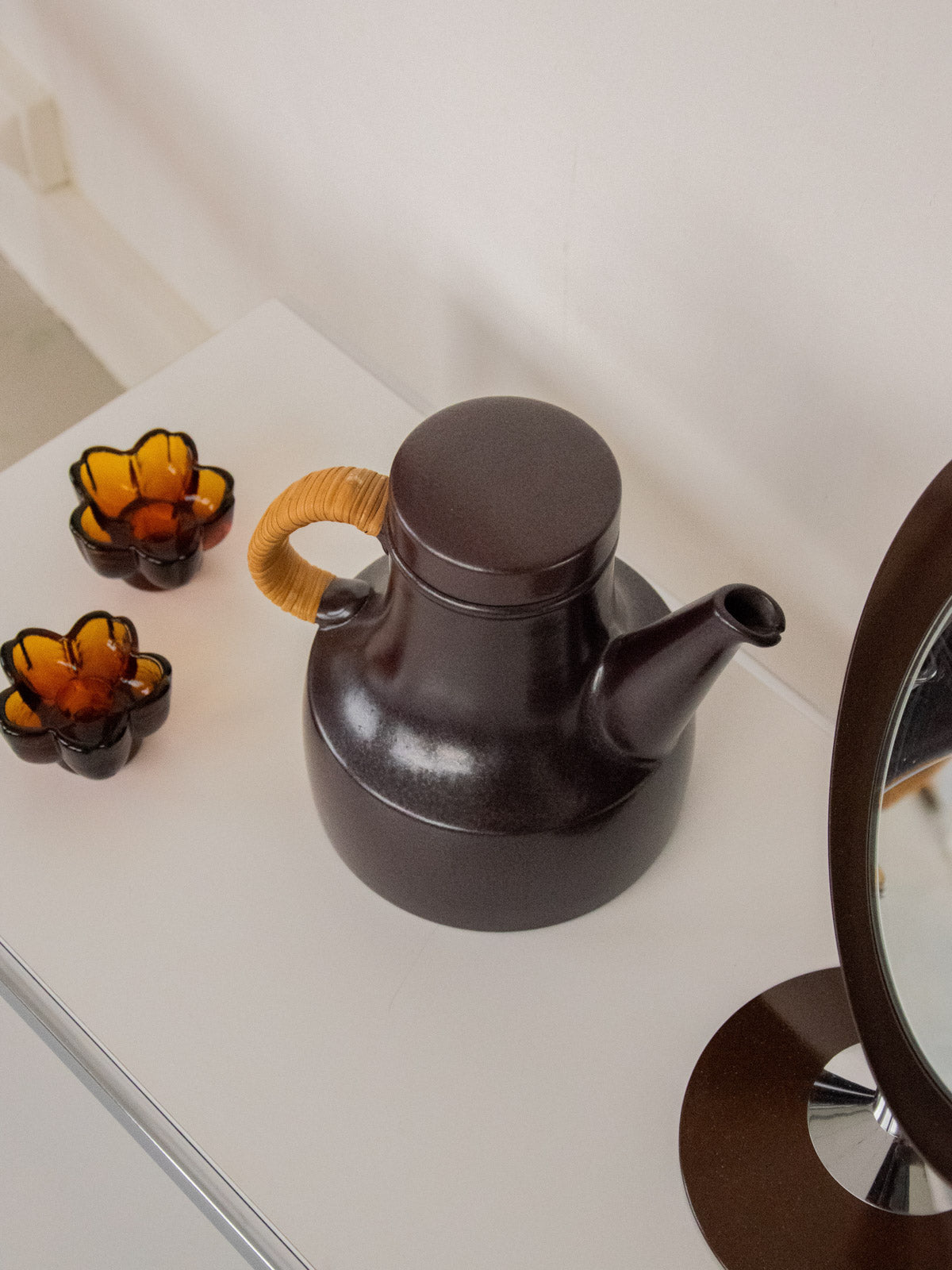 Découvrez cette théière des années 70 attribuée au fabricant suédois Gustavsberg (collection Terma). En céramique émaillée marron foncé, son bel arrondi affirme une silhouette chaleureuse sur la table. Son anse gainée d'osier apporte une note artisanale et pratique, facilitant le service tout en contrastant délicatement la surface brillante. Idéale pour une pause thé conviviale ou comme pièce d'appoint dans une cuisine au style scandinave rétro, elle invite à des moments simples et élégants.