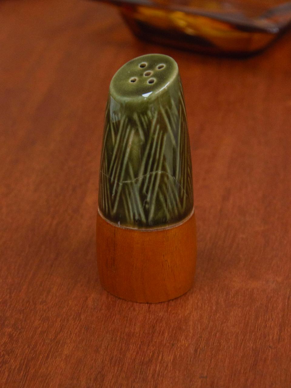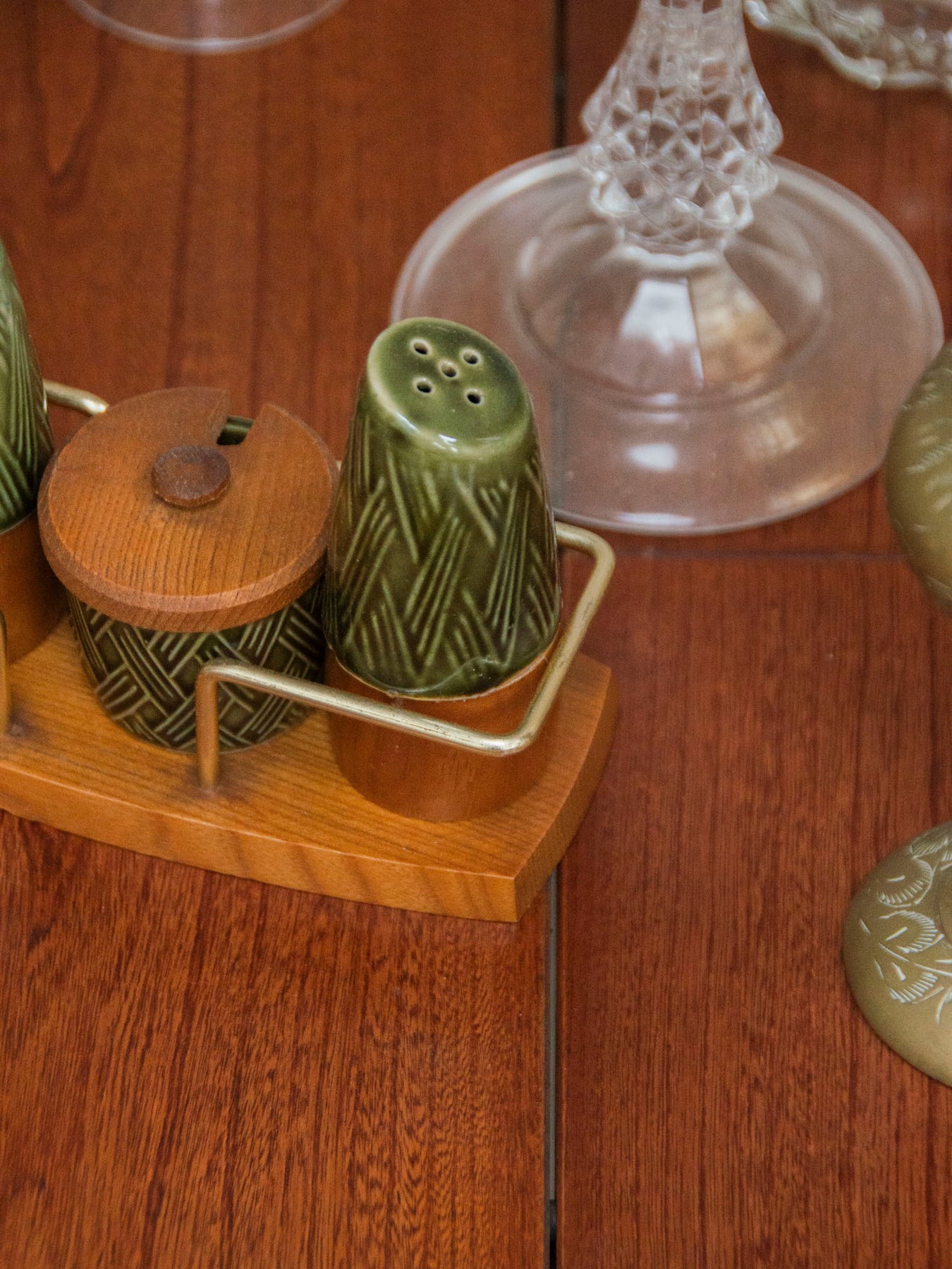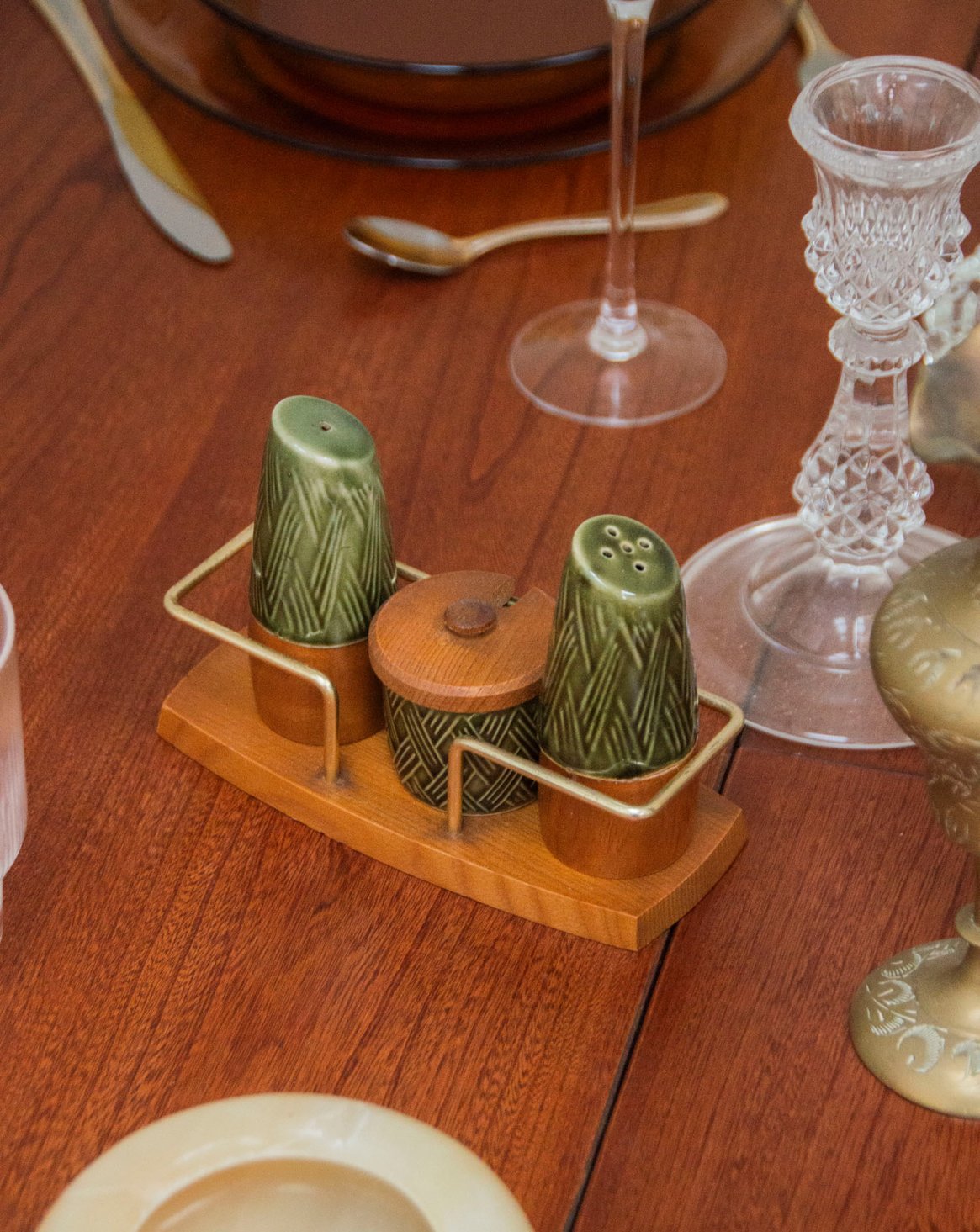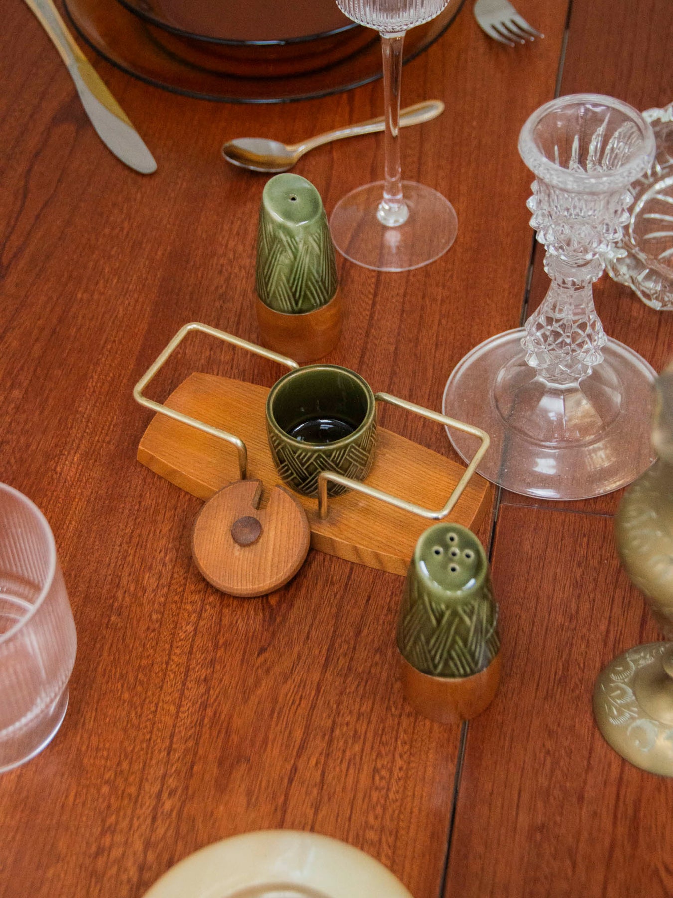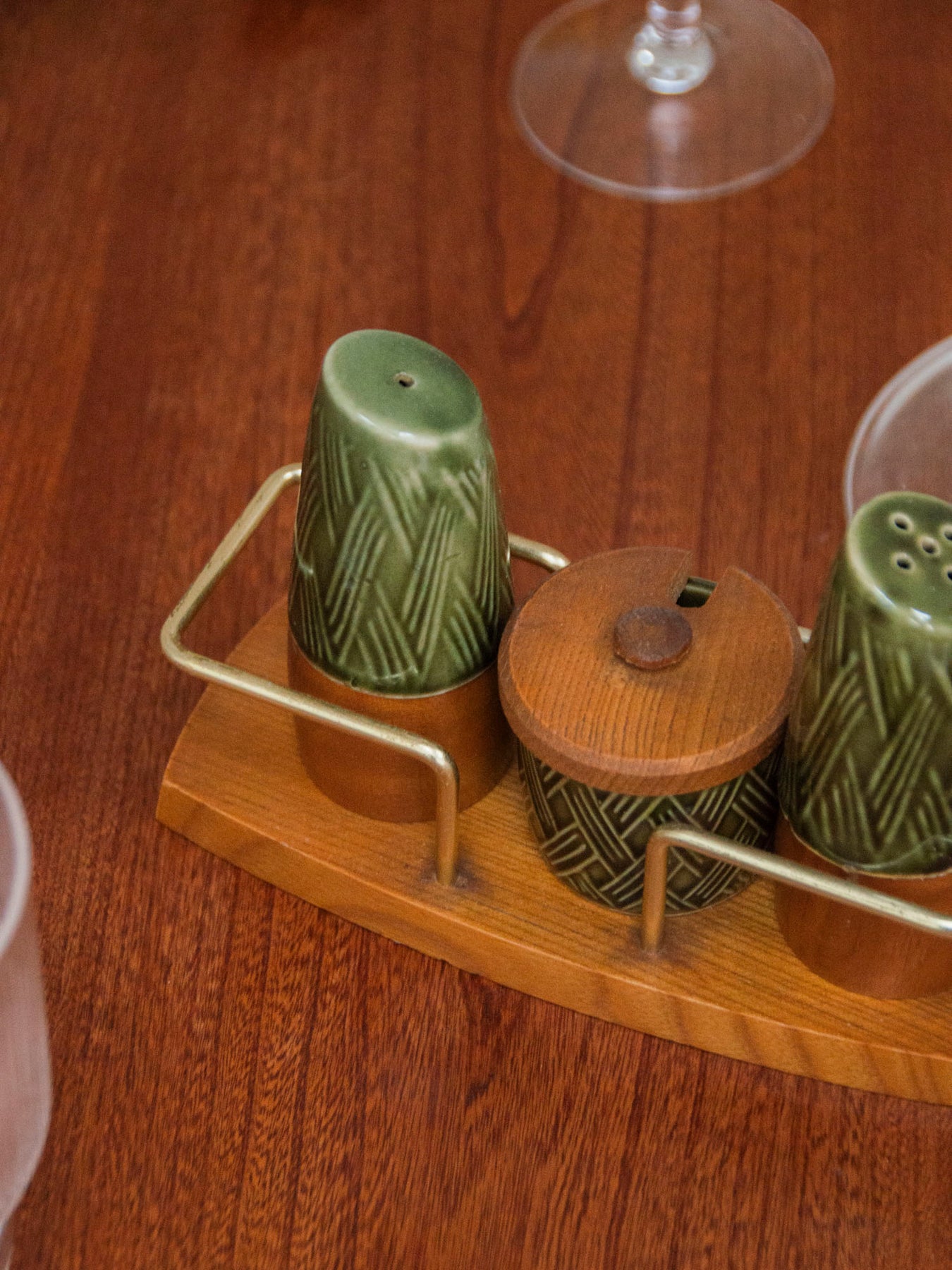 Ajoutez ce duo sel et poivre en émail à votre table, présenté autour d'un porte-épices central qui facilite le service et l'organisation des condiments. Les nuances d'émail associées aux détails en bois apportent une esthétique chaleureuse et intemporelle, parfaite pour une table conviviale ou une cuisine au style authentique. Son format compact permet de le poser au centre sans encombrer l'espace, offrant une touche vintage subtile à vos repas. Fissures légères présentes.