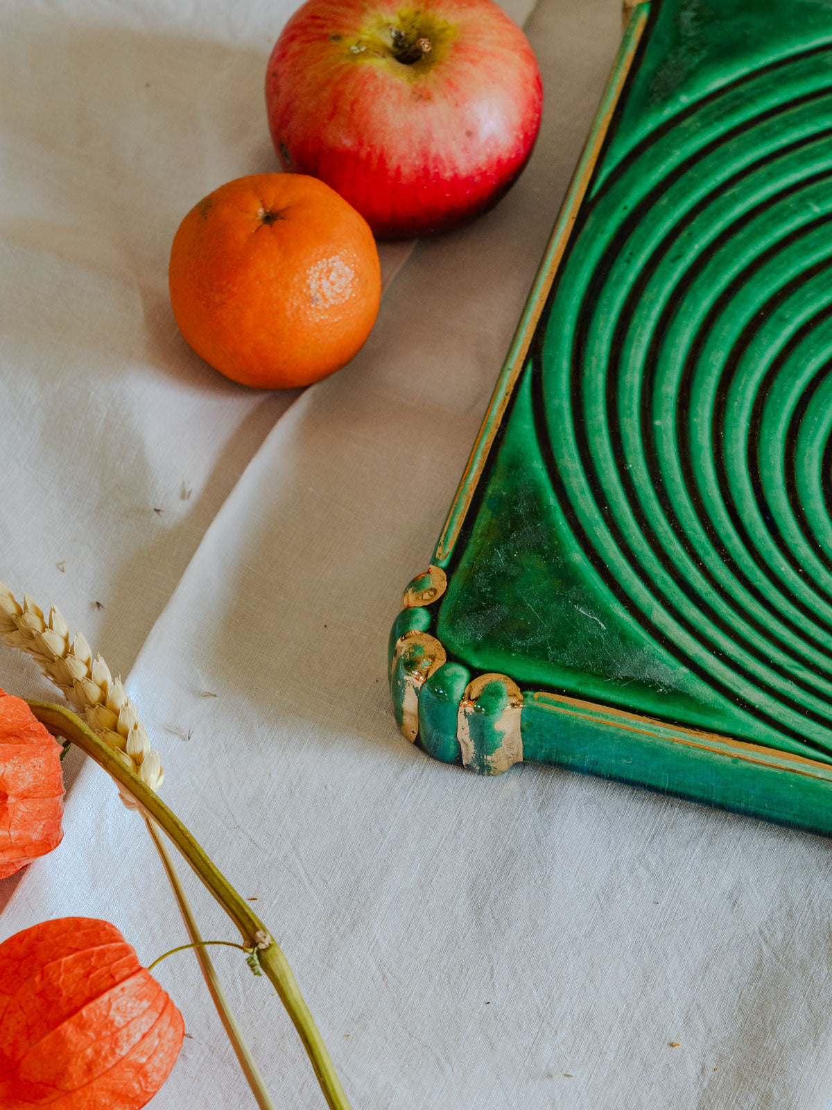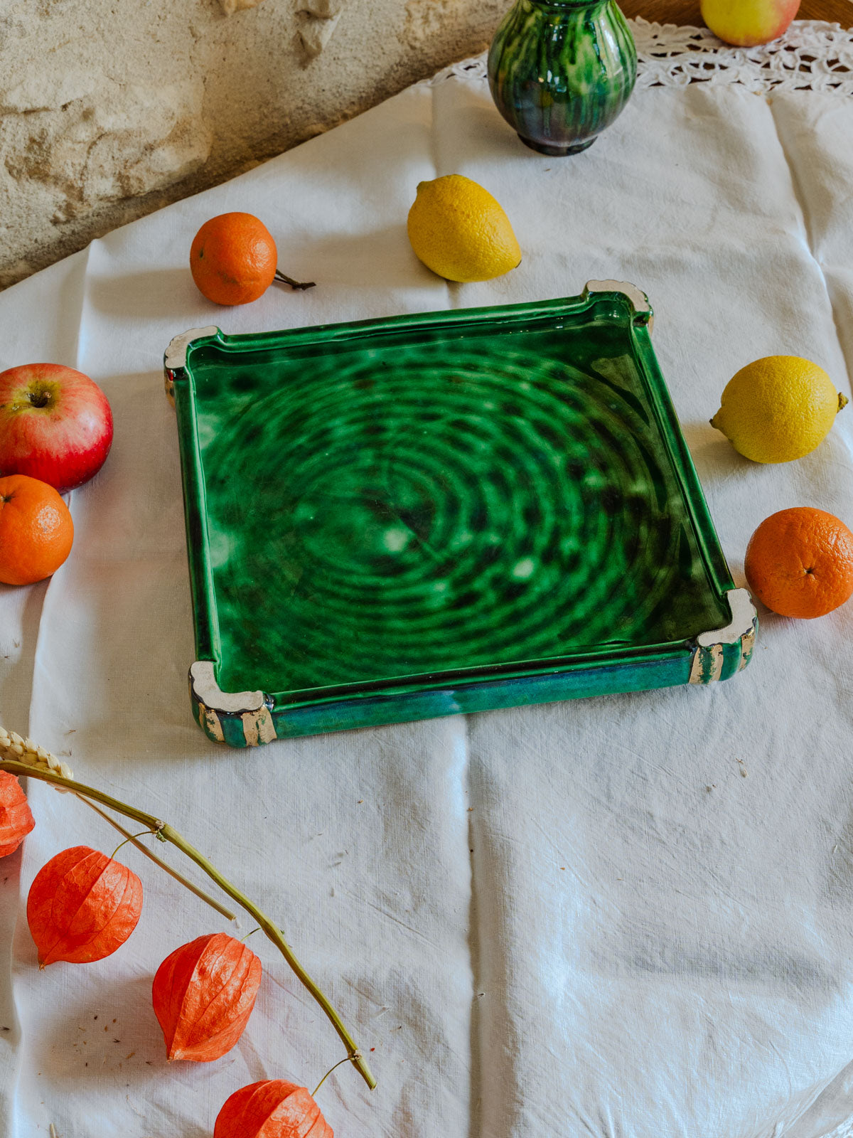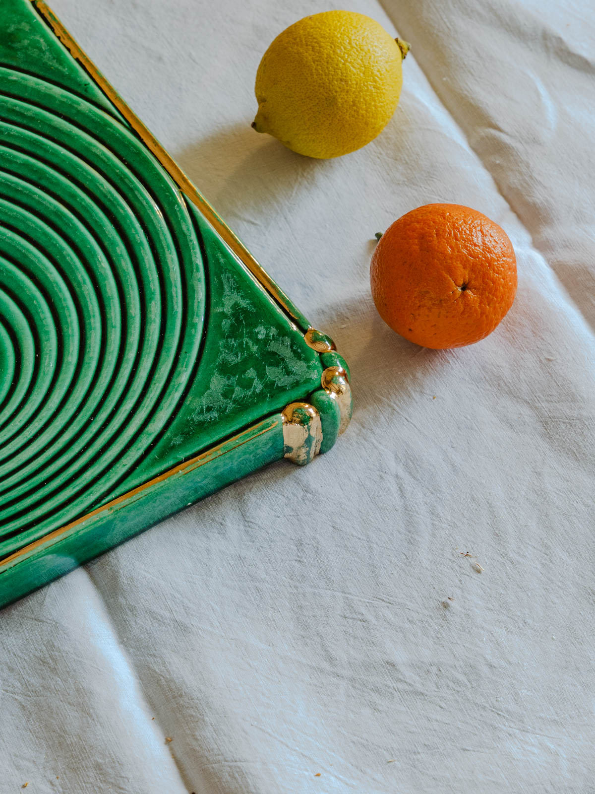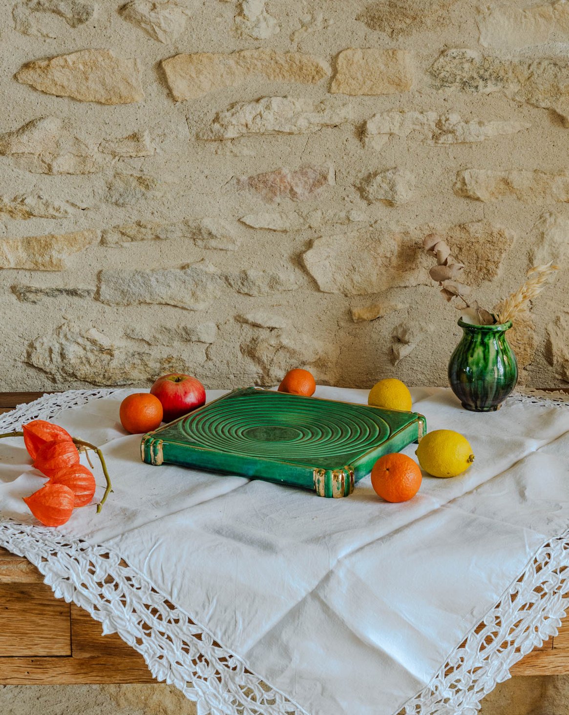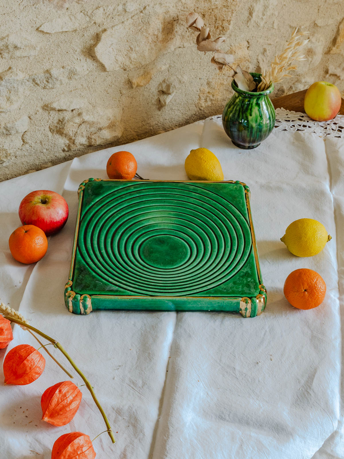 Ajoutez un accent Art déco à vos tables avec ce dessous de plat vintage aux nuances vertes et dorées et base métallique patinée, qui marie élégance graphique et chaleur rétro. Sa finition soignée protège joliment les surfaces tout en mettant en valeur vos plats lors des repas et réceptions, et son format compact accueille assiettes et petites casseroles avec aisance. Idéal pour une présentation raffinée et conviviale.