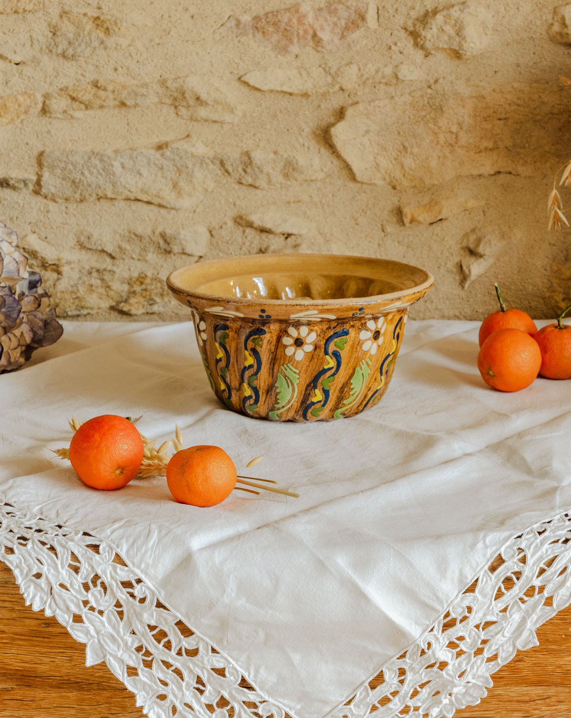 Découvrez ce plat à kouglof vintage en poterie vernissée, signé HR, aux lignes simples et à la glaçure chaleureuse. Son moule à cheminée central garantit une cuisson régulière et sa taille compacte convient aux préparations familiales ou aux présentations gourmandes. L'orifice prévu pour le suspendre facilite le rangement et lui apporte une touche d'authenticité artisanale, idéale pour une cuisine qui mêle tradition et élégance.
