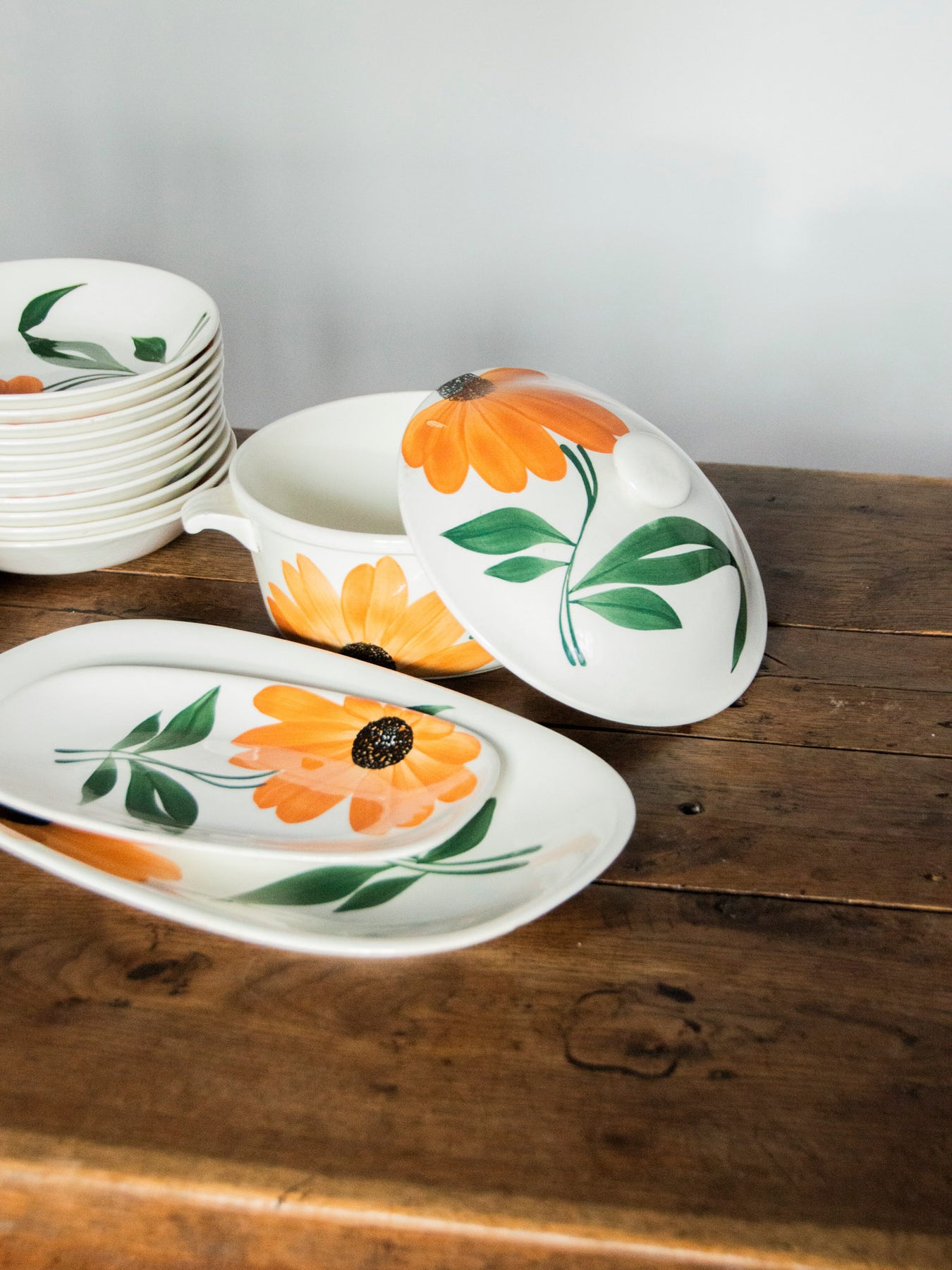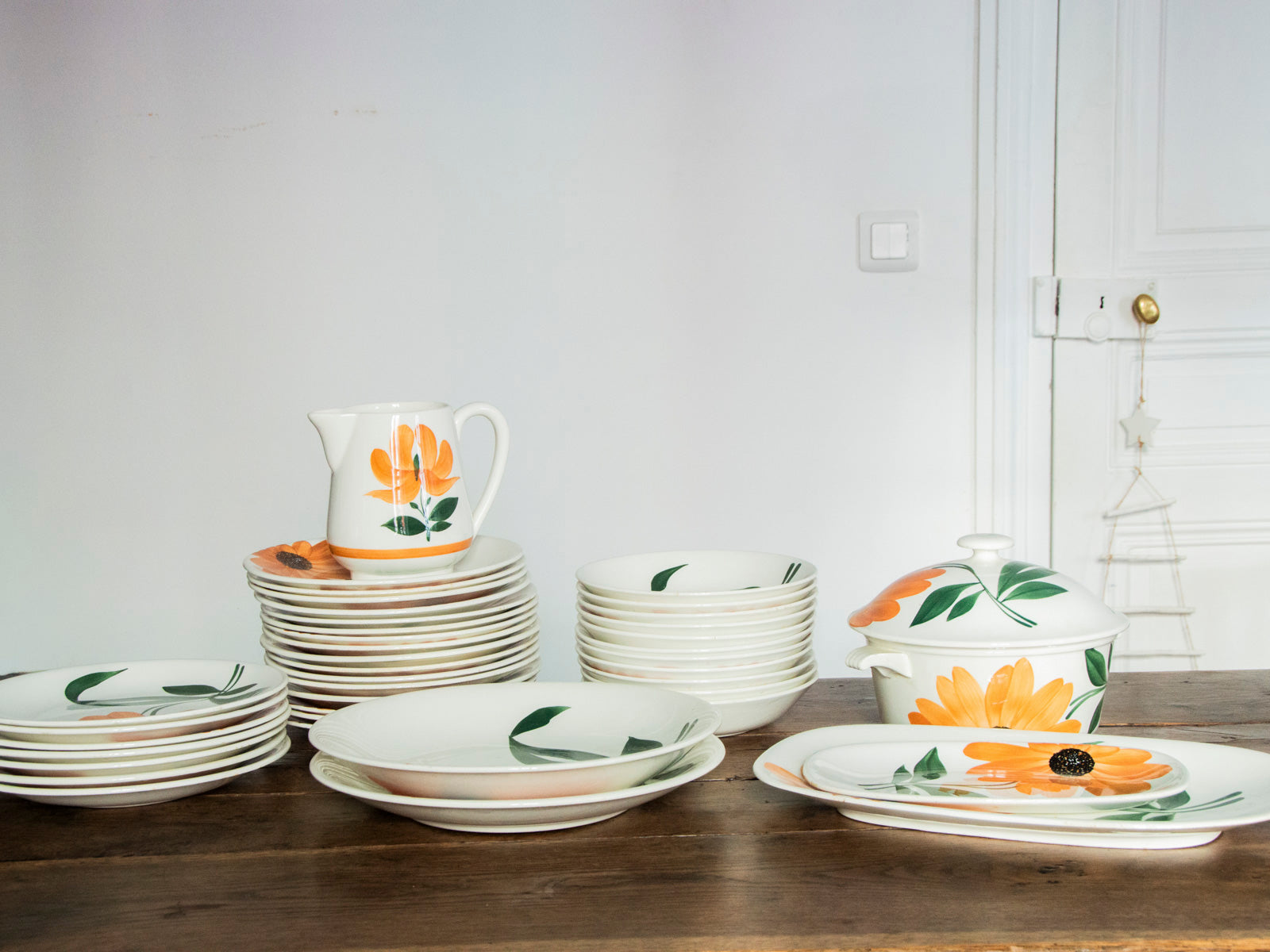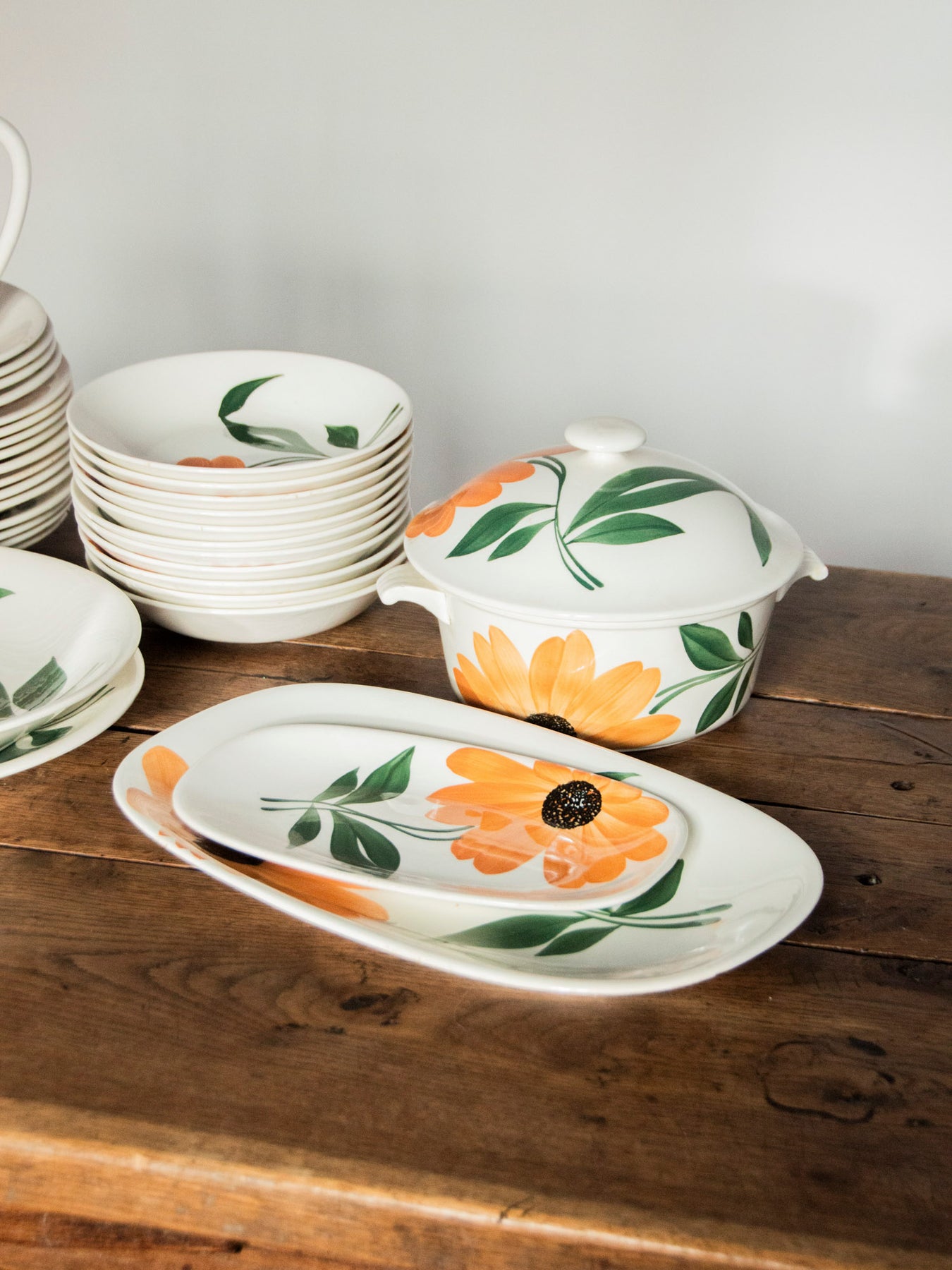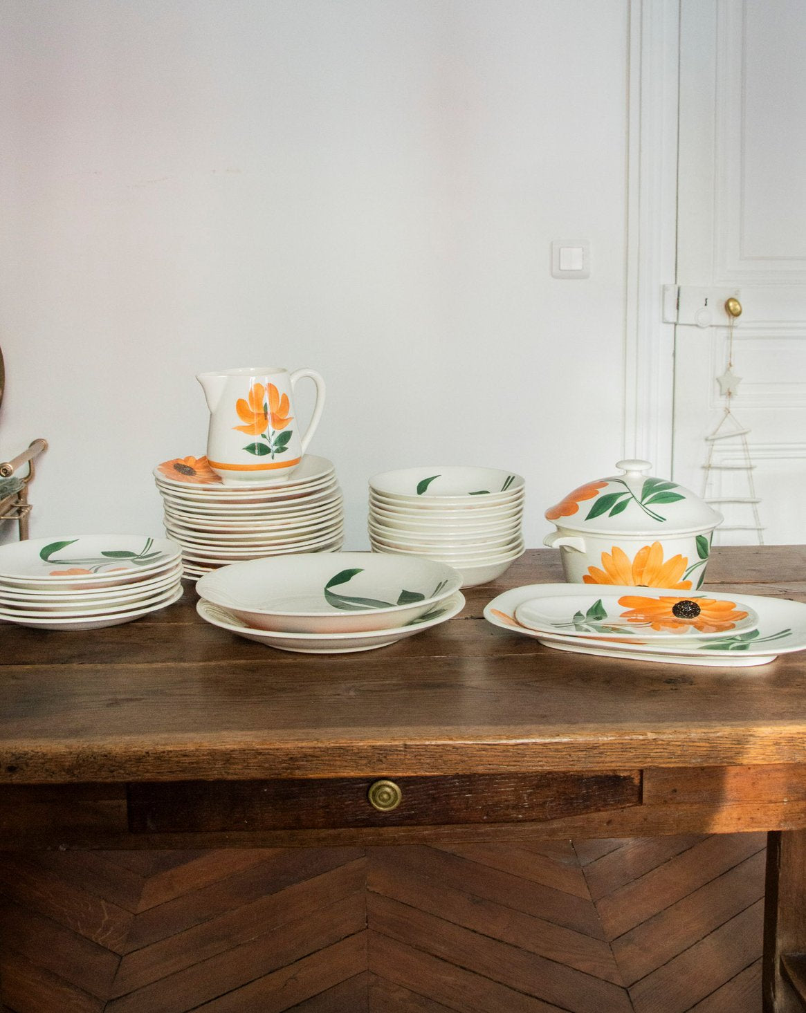 Sublimez votre table avec ce service Giens peint à la main, un ensemble de 40 pièces en faïence aux motifs floraux — tournesols orangés et feuilles vertes — qui apporte une ambiance à la fois champêtre et raffinée. La soupière couverte, le broc et les plats de service, associés aux assiettes creuses et plates, offrent un service complet idéal pour repas familiaux ou réceptions conviviales. Petits défauts et usures présents. Composé d'une soupière, 1 broc, 11 assiettes creuses, 25 assiettes plates, 2 plats de service longs, 2 plats de services ronds.