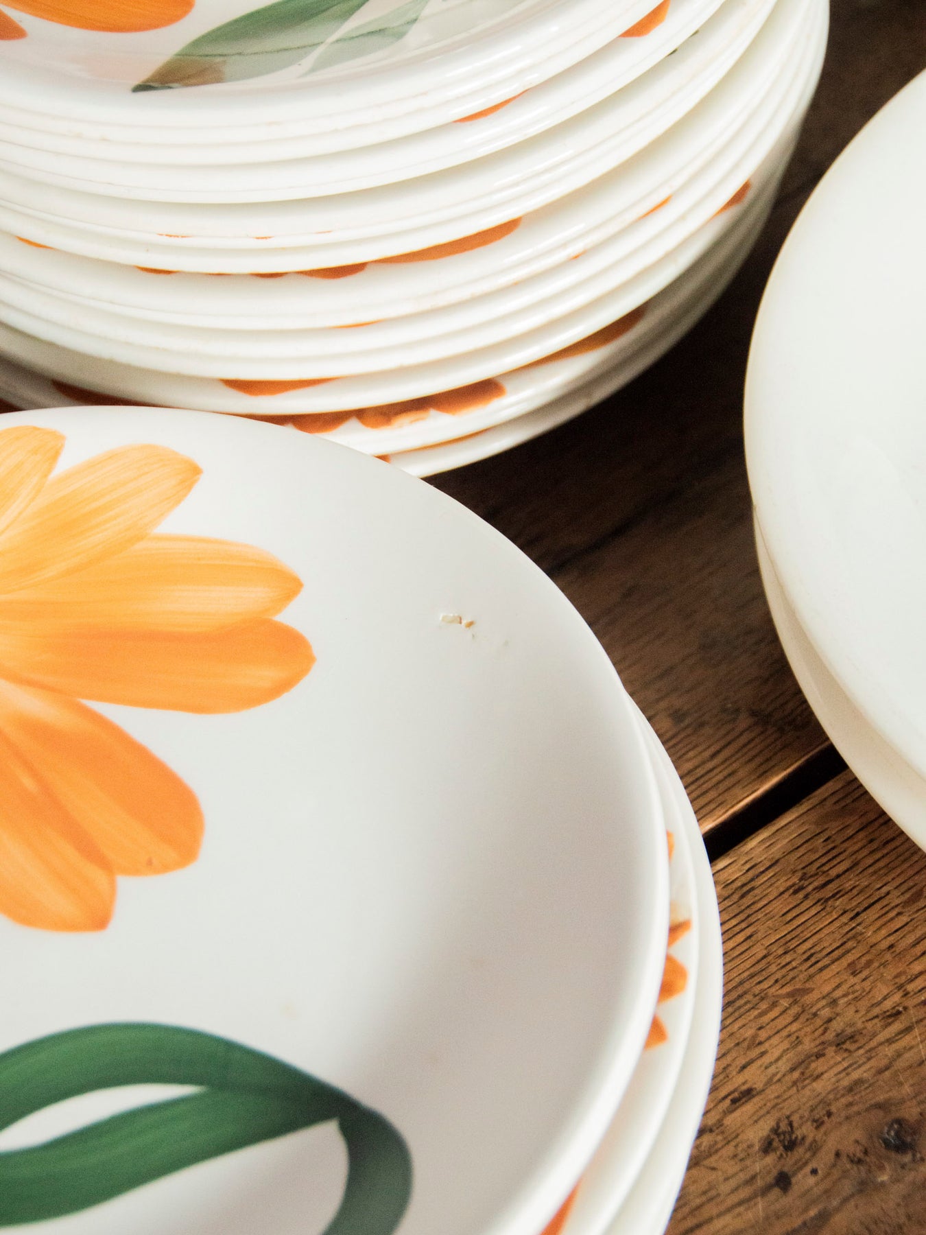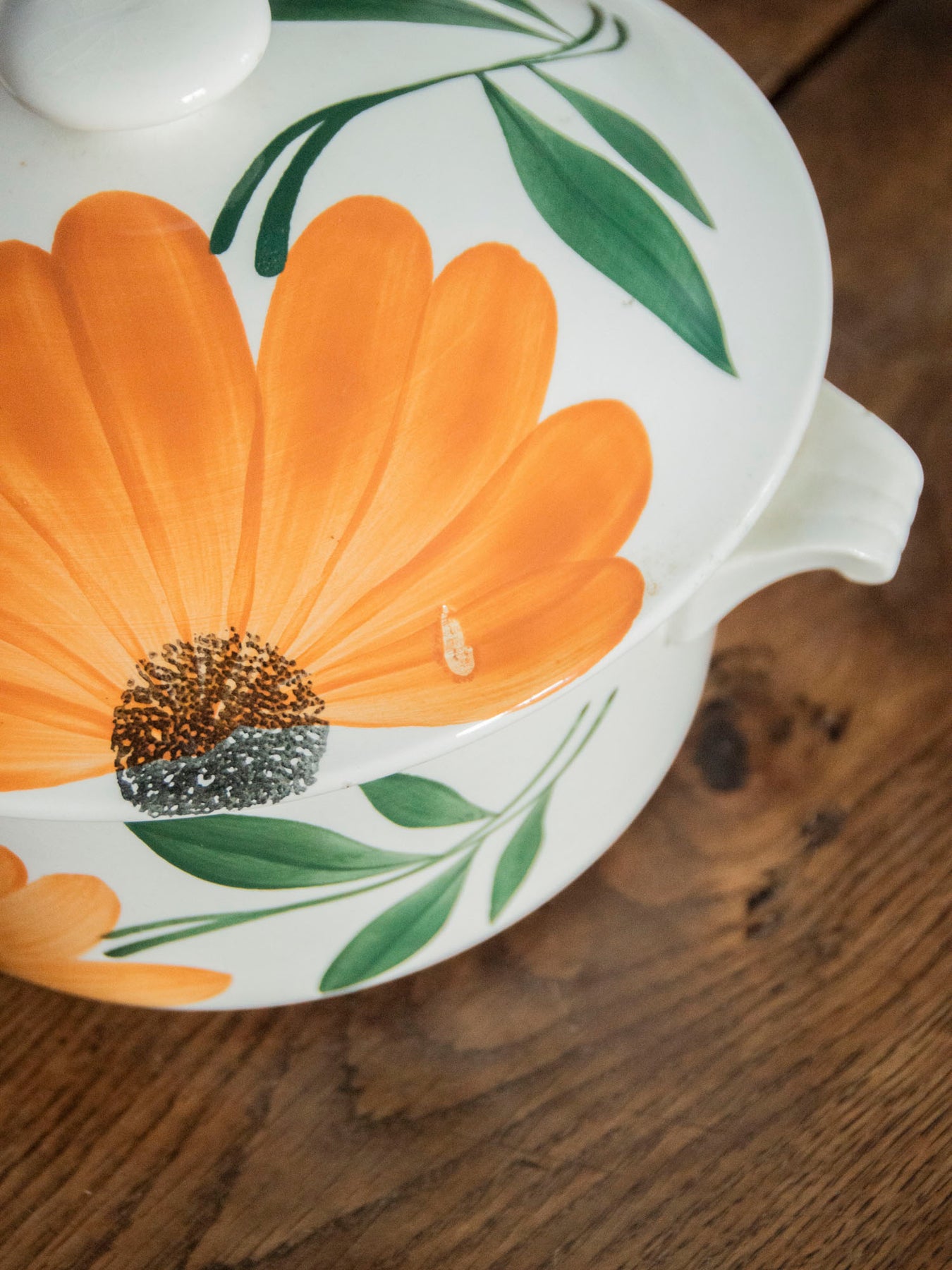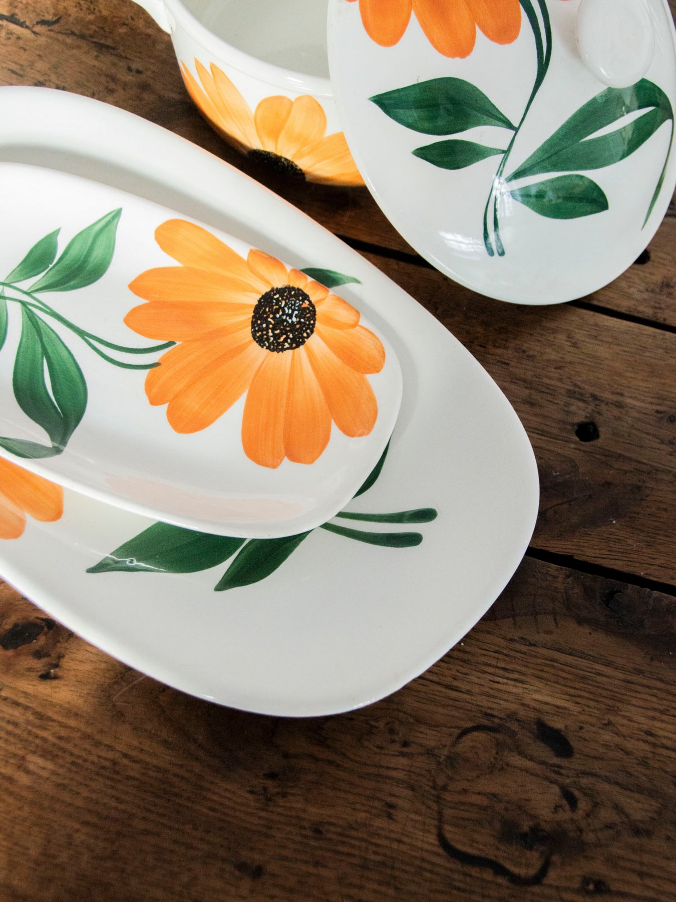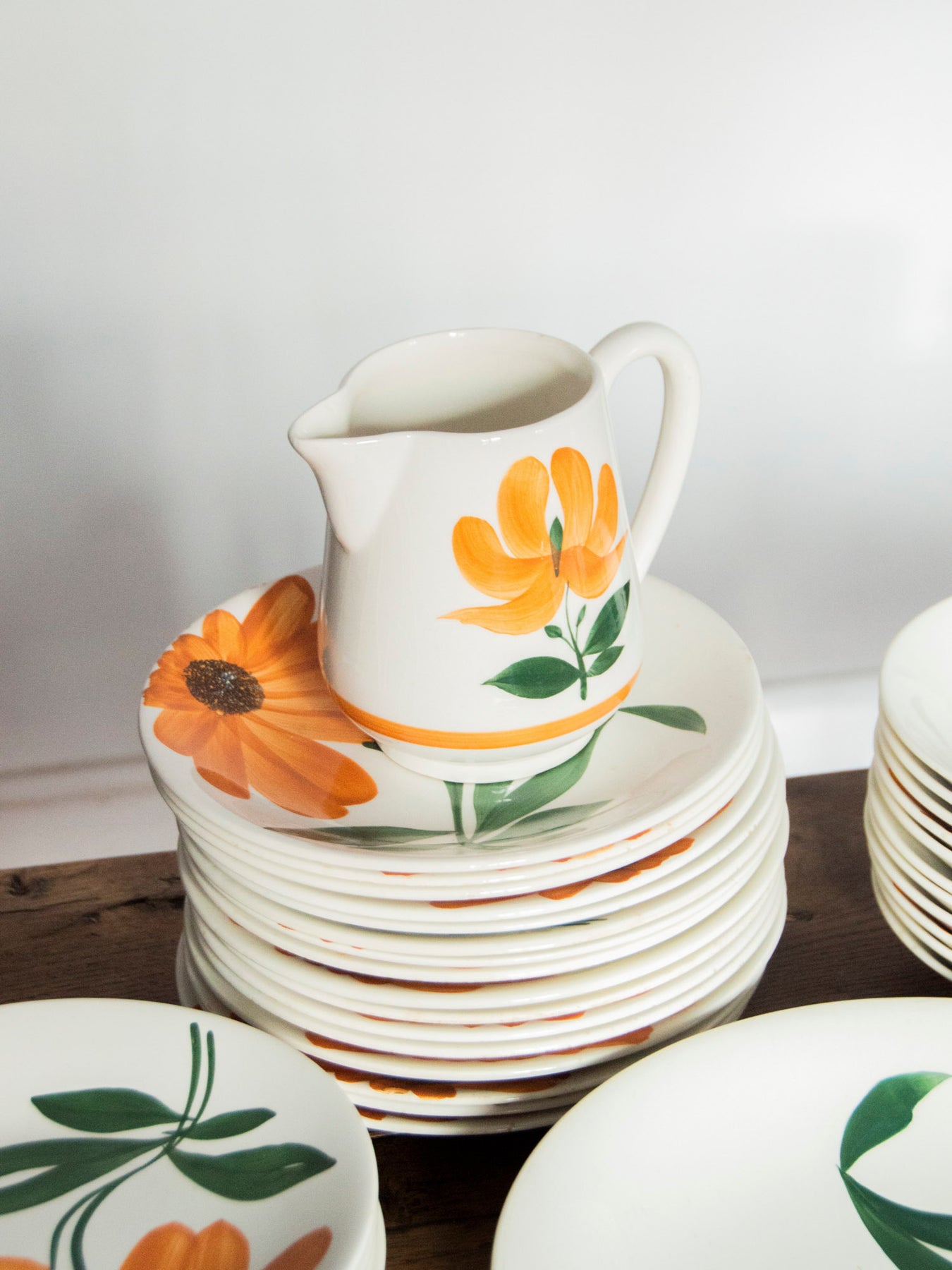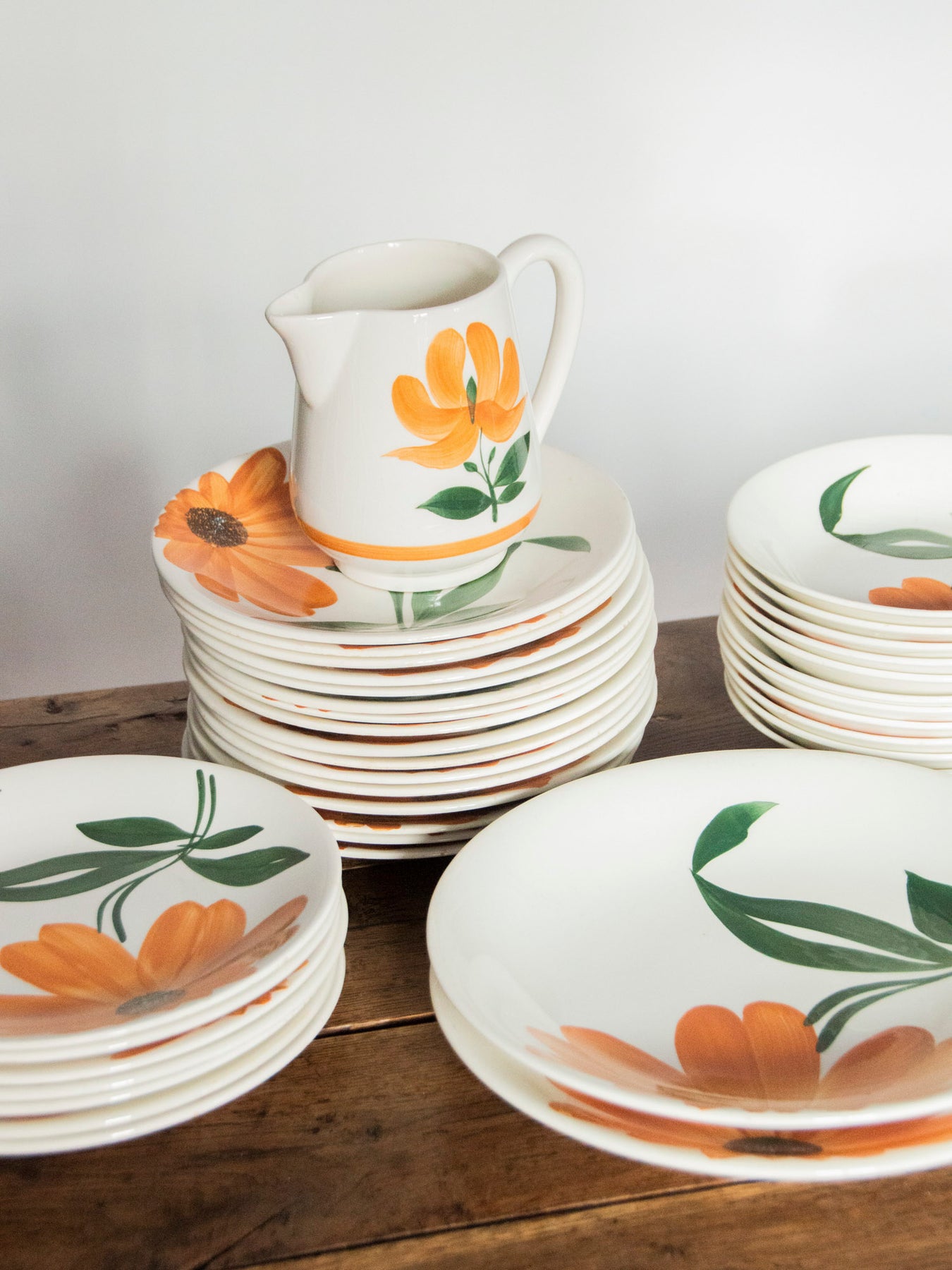 Sublimez votre table avec ce service Giens peint à la main, un ensemble de 40 pièces en faïence aux motifs floraux — tournesols orangés et feuilles vertes — qui apporte une ambiance à la fois champêtre et raffinée. La soupière couverte, le broc et les plats de service, associés aux assiettes creuses et plates, offrent un service complet idéal pour repas familiaux ou réceptions conviviales. Petits défauts et usures présents. Composé d'une soupière, 1 broc, 11 assiettes creuses, 25 assiettes plates, 2 plats de service longs, 2 plats de services ronds.