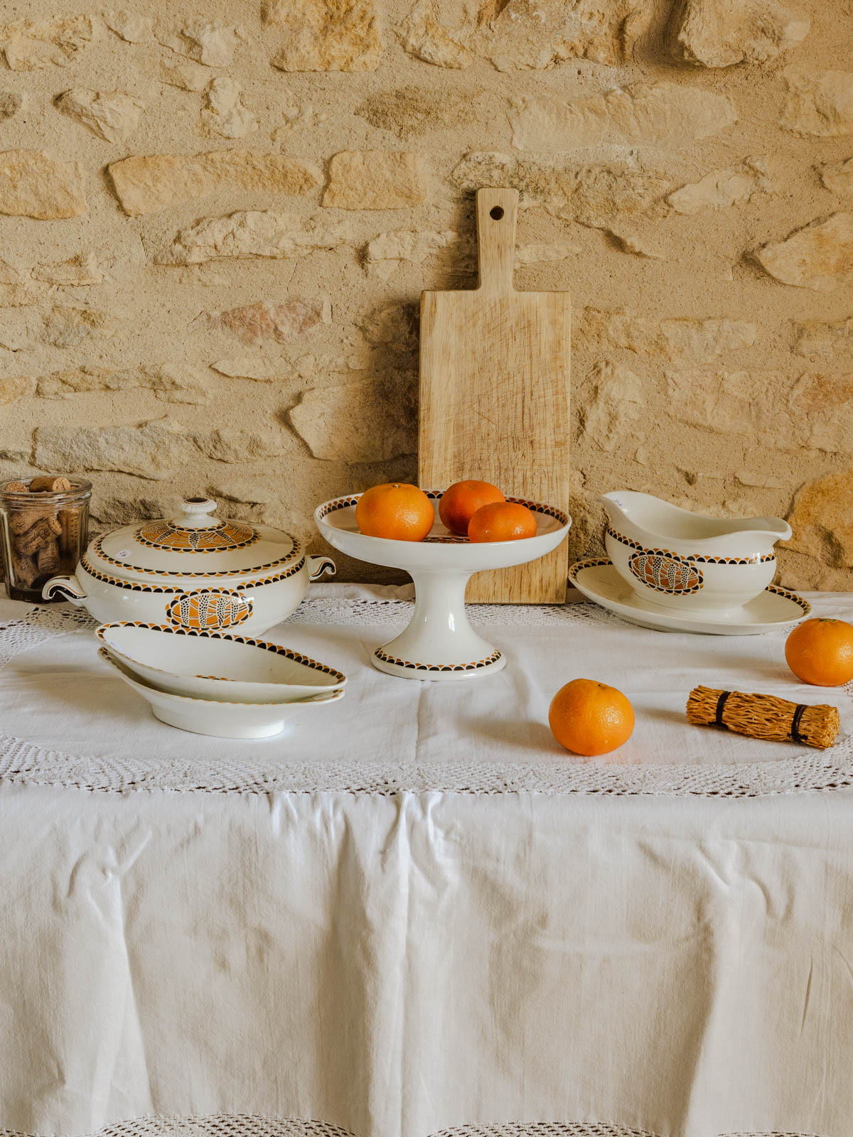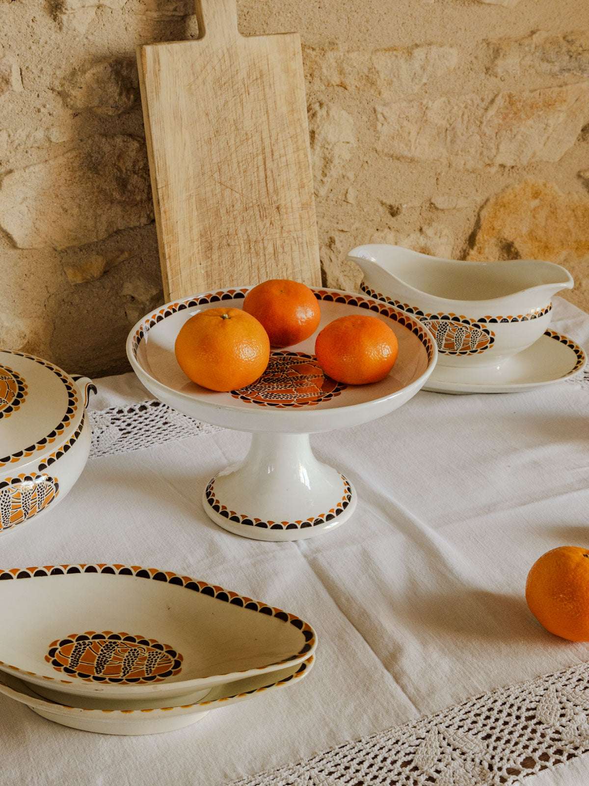 Découvrez ce compotier en faïence de Sarreguemines, modèle Nomeny, habillé d'un dessin noir et orange qui lui confère une allure rétro-chic. Sa hauteur accueille compotes, fruits ou présentations sucrées, offrant un usage aussi pratique qu'esthétique. L'émail brillant met en valeur les couleurs et invite à une mise en scène conviviale sur la table ou dans une cuisine chaleureuse.