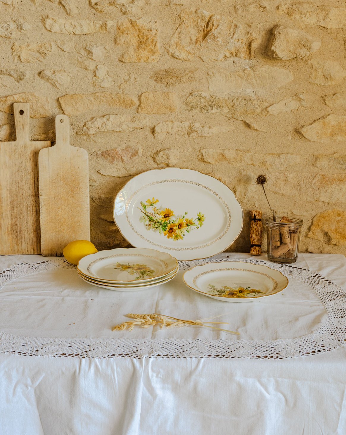 Ajoutez une touche champêtre et élégante à votre table avec ce lot en faïence de Gien, modèle Marguerite, orné d'un délicat liseré et de détails dorés. Quatre assiettes creuses au format convivial et un plat offrent de belles possibilités pour dresser un service harmonieux, tandis que les motifs de marguerites jaunes et verts apportent une note florale et lumineuse. Idéal pour un déjeuner en famille ou un dîner soigné, il crée une ambiance chaleureuse et raffinée.