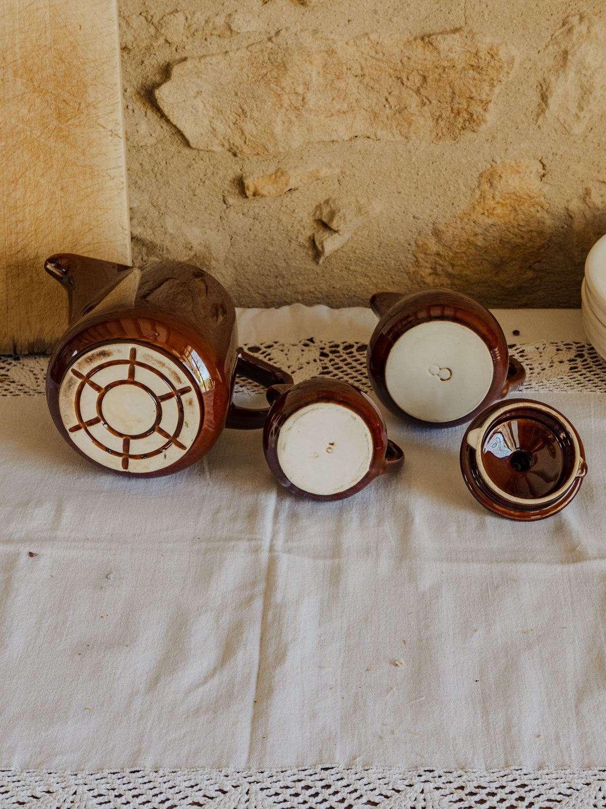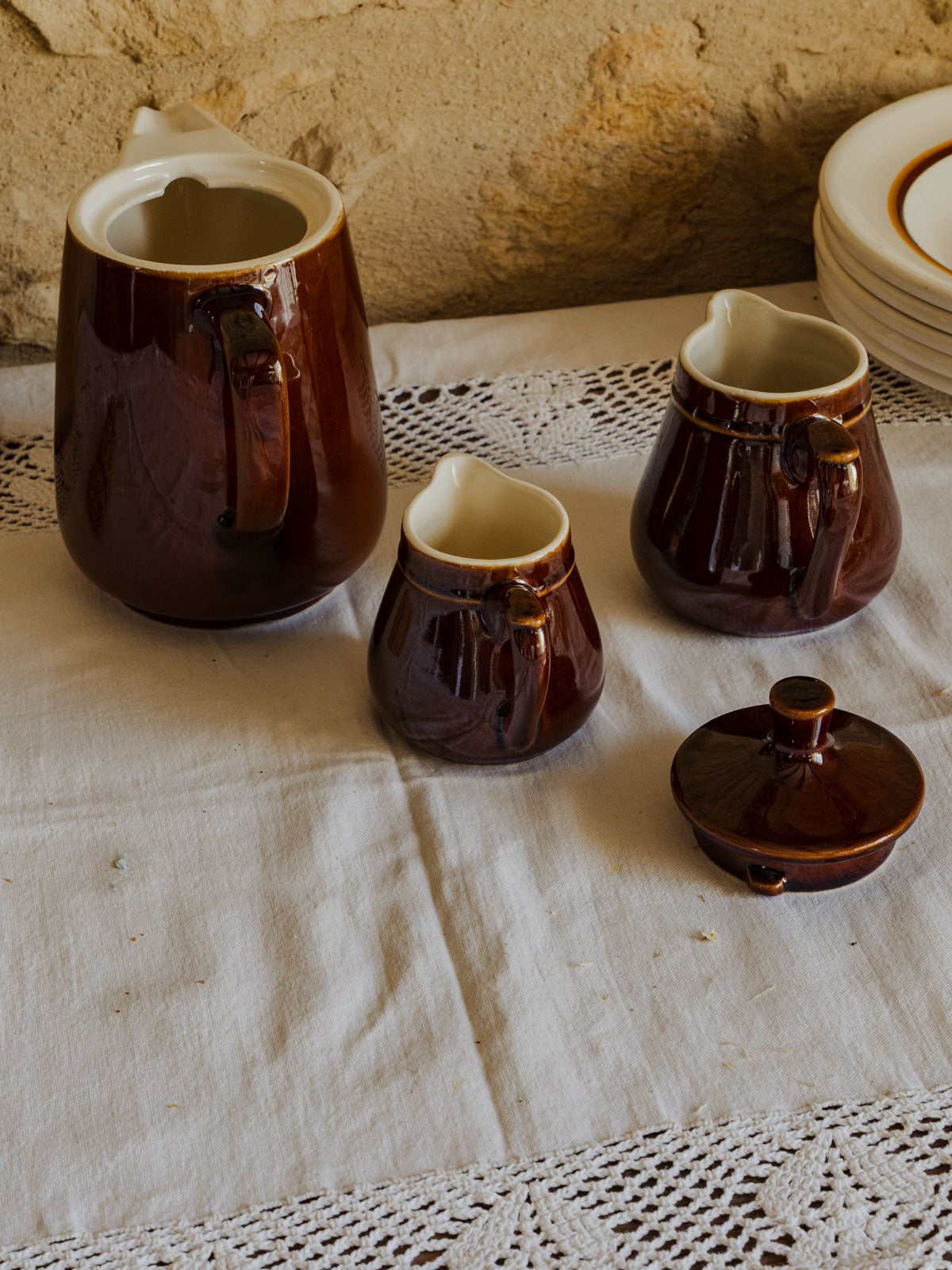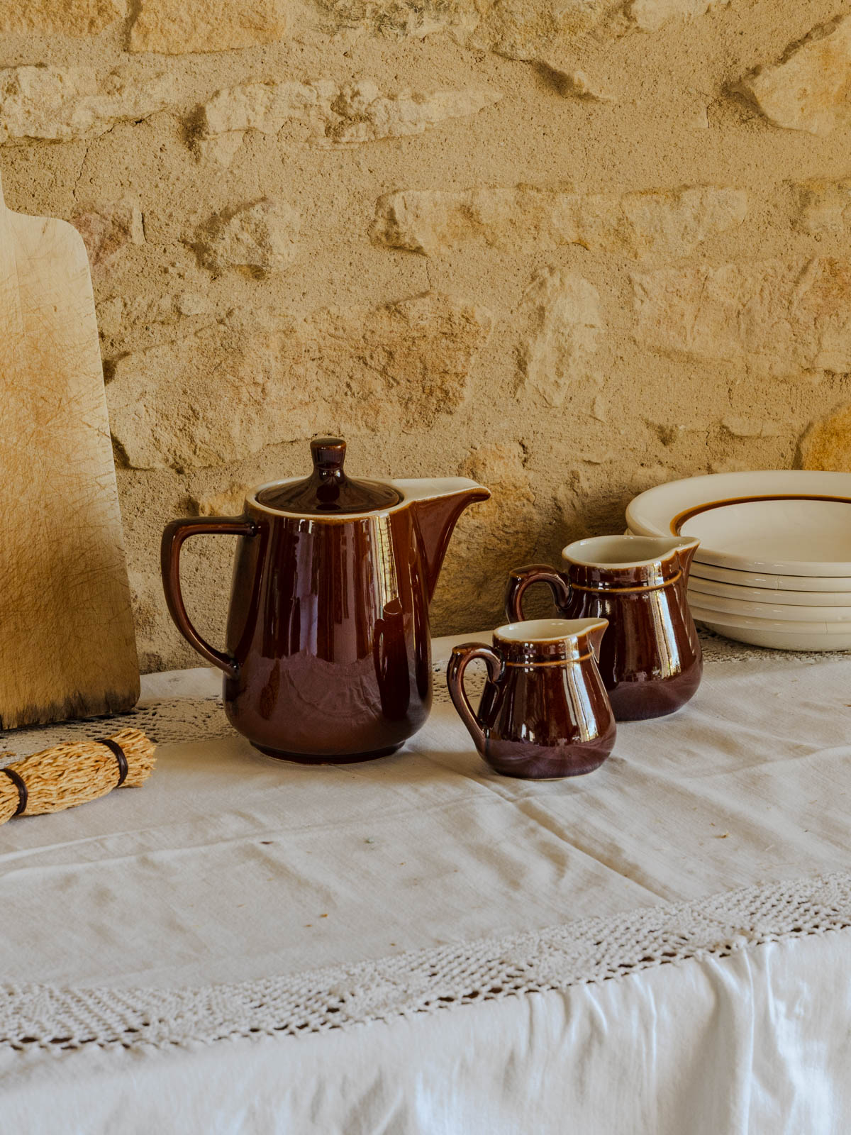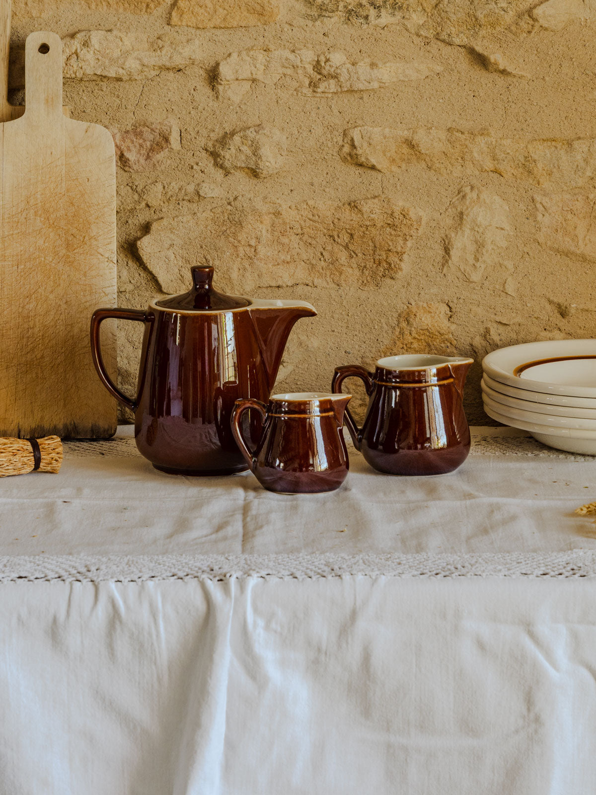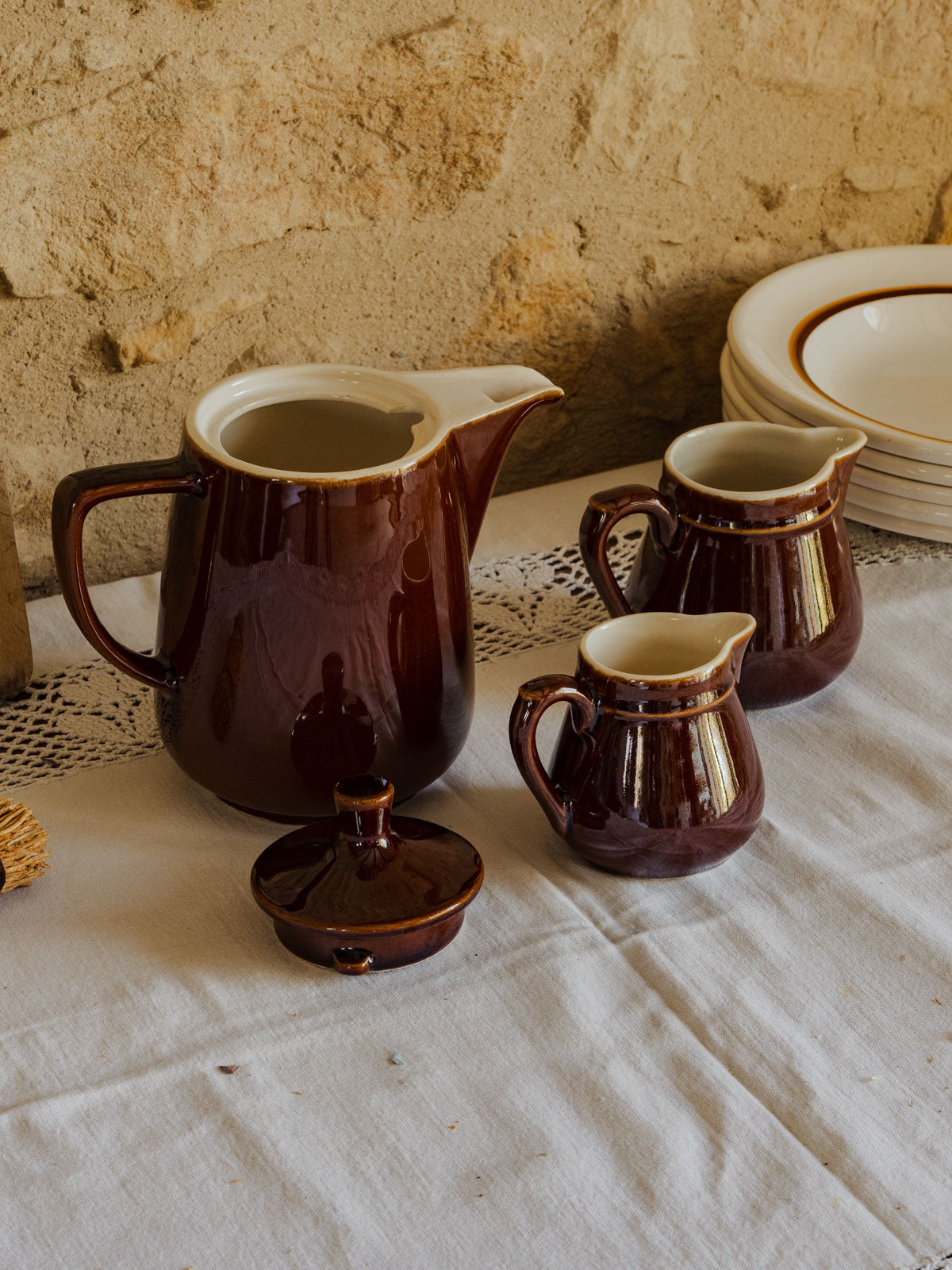 Apportez à votre table un air de bistrot rétro avec ce lot en faïence composé d'un pichet à couvercle et de deux pots à lait numérotés, aux teintes chaudes marron et beige. Le pichet et les pots sont parfaits pour servir lait, crème ou confiture, ou pour animer une étagère en guise d'accents décoratifs. Inspiré des années 60-70, cet ensemble diffuse une convivialité simple et authentique, idéal pour petits déjeuners et pauses café.