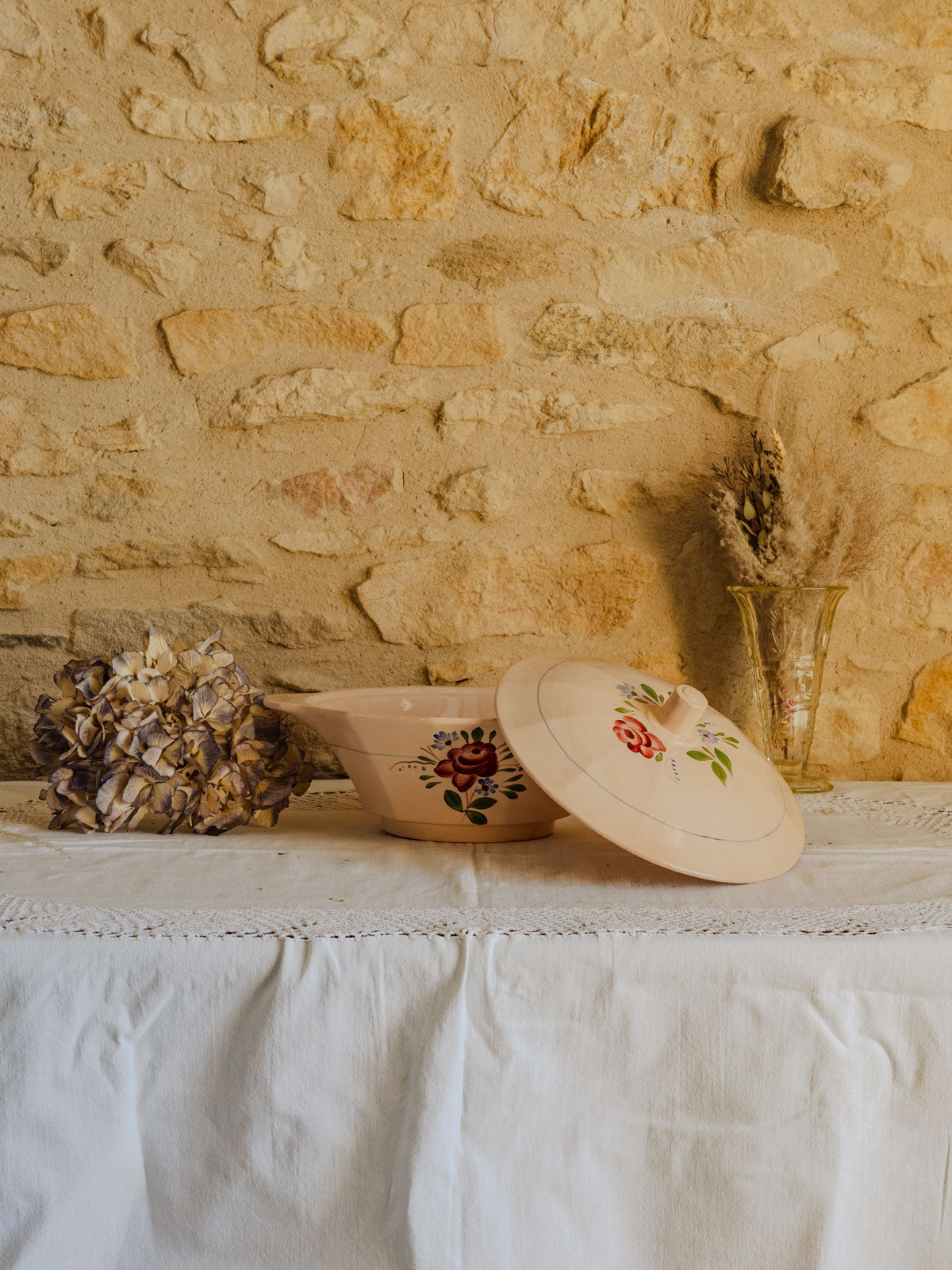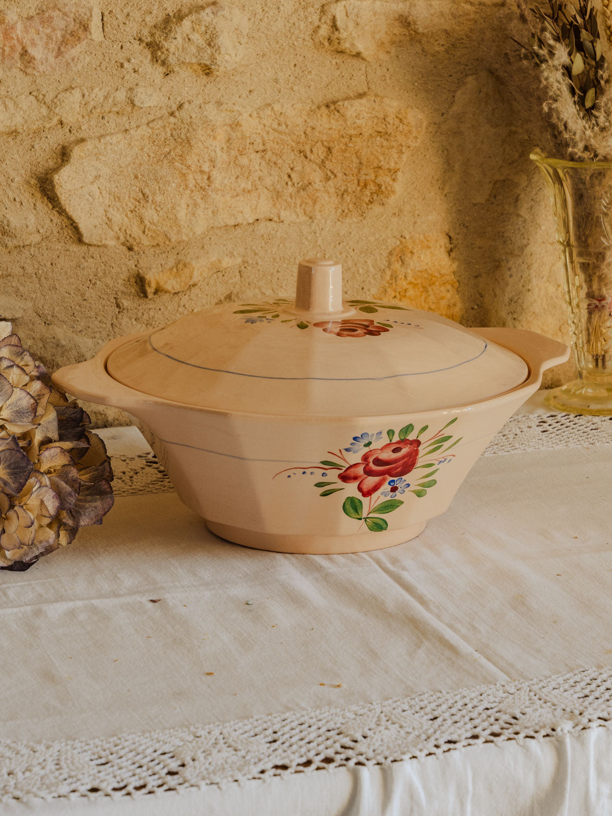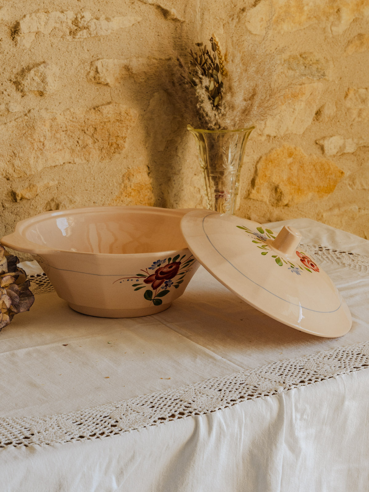 Apportez une touche délicate à votre table avec cette soupière en faïence rose poudré, ornée de motifs floraux roses et verts soulignés de petits détails bleus. Dotée d'un couvercle et de proportions conviviales, elle se prête aussi bien au service de soupes et plats mijotés qu'à la présentation raffinée d'un buffet. Sa glaçure lumineuse offre une présence chaleureuse et discrète, capable d'habiller une table champêtre comme une mise en scène plus contemporaine.
