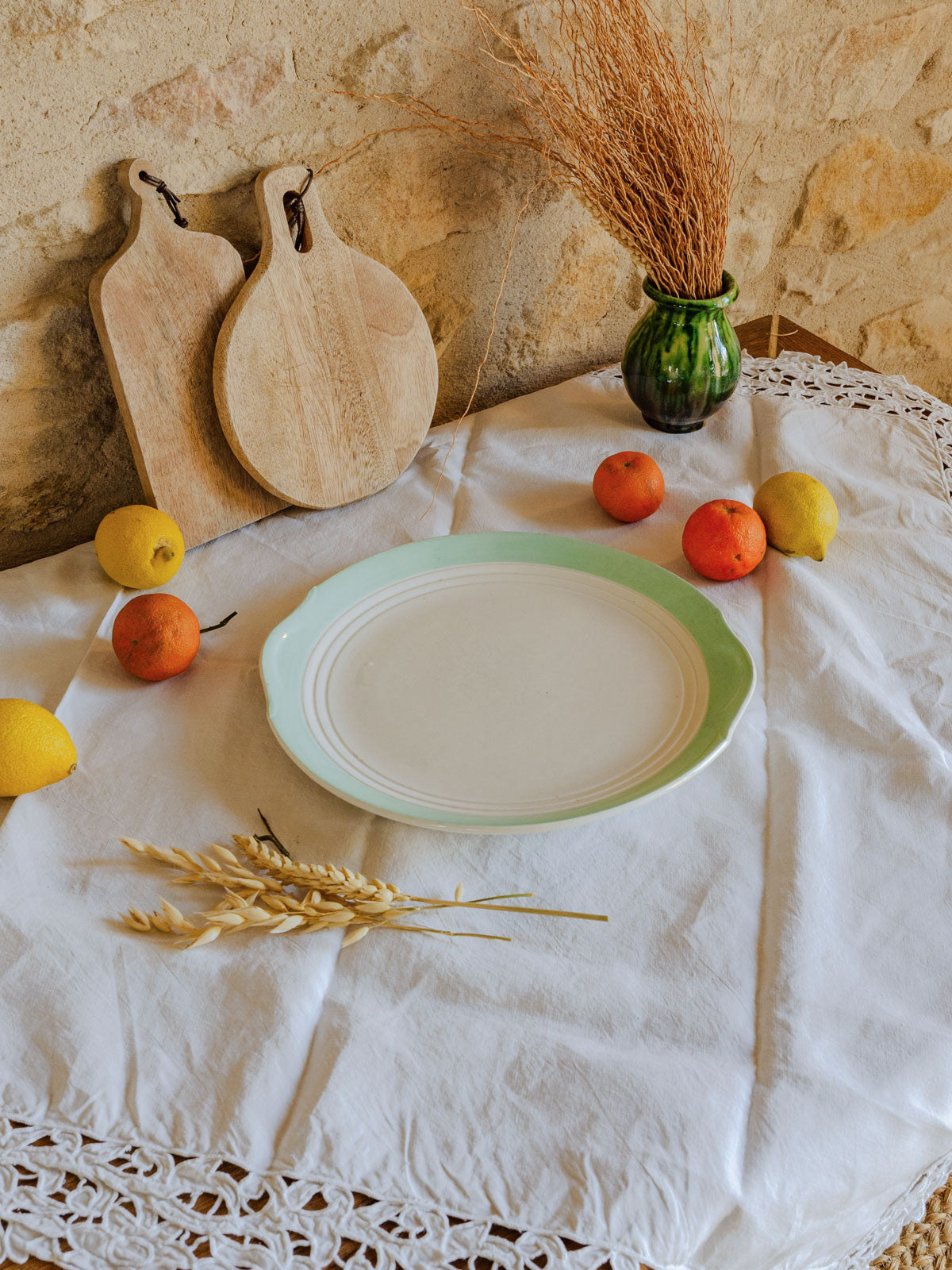 Sublimez votre table avec ce plat à gâteau vintage en faïence vert d'eau signé St Amand Ceranord. Son format généreux accueille un gâteau familial ou une sélection de pâtisseries, tandis que son profil bas met en valeur les créations dressées. La glaçure douce et le design rétro apportent une touche lumineuse et délicate à vos présentations, idéale pour un brunch ou un goûter élégant. Stable et facile à dresser, il s'accorde aussi bien aux services contemporains qu'aux pièces chinées.
