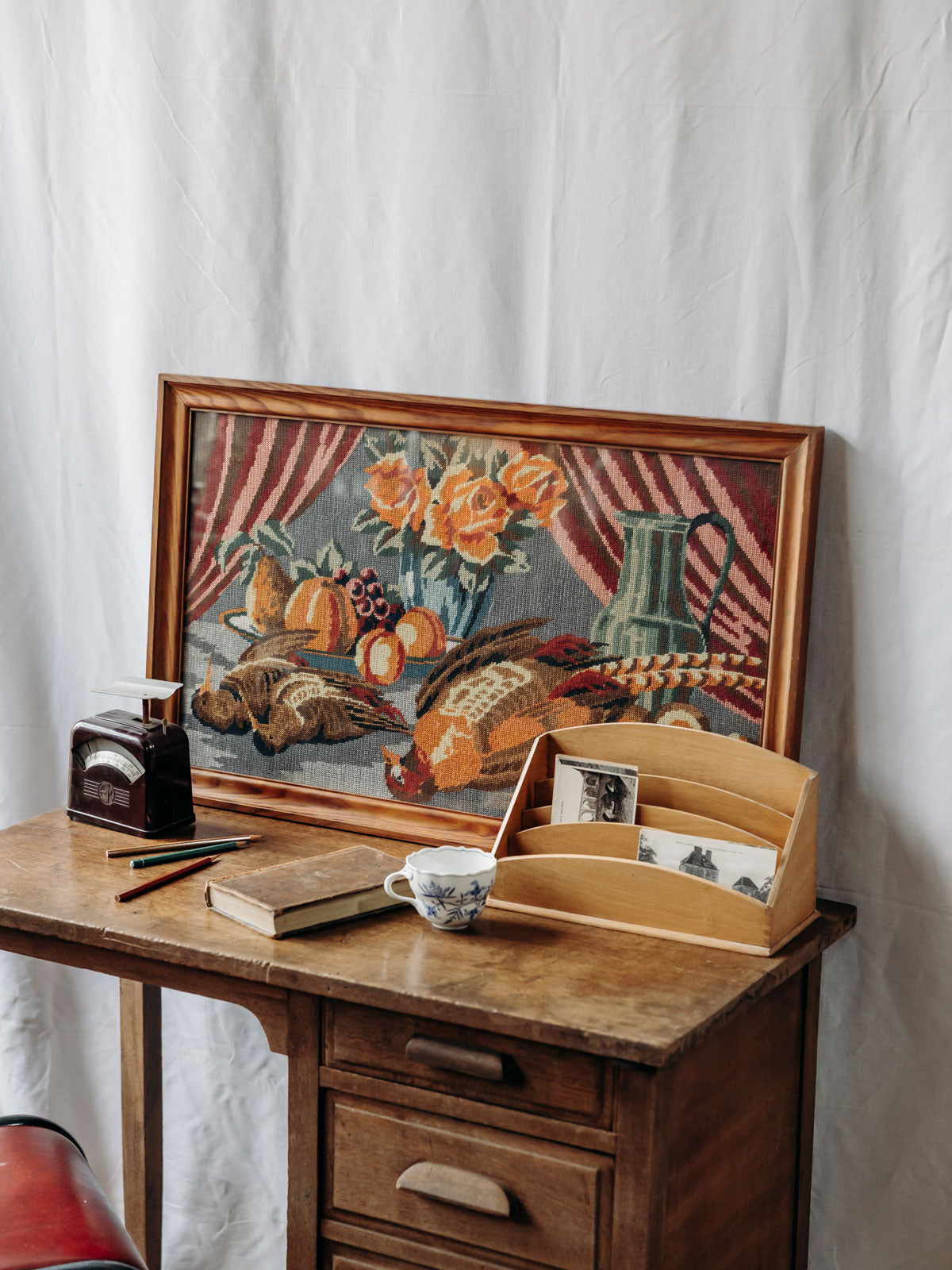 Découvrez cette toile sur canevas encadrée d'un bois clair, une nature morte multicolore datée de mars 1970 qui invite à une pause contemplative. Les teintes chatoyantes et le grain du canevas apportent chaleur et profondeur, tandis que le cadre sobre souligne sa présence sans imposer. À accrocher dans une cuisine, un salon ou un coin lecture, elle installe une atmosphère rétro et lumineuse, parfaite pour ponctuer un mur d'une touche artistique et singulière.