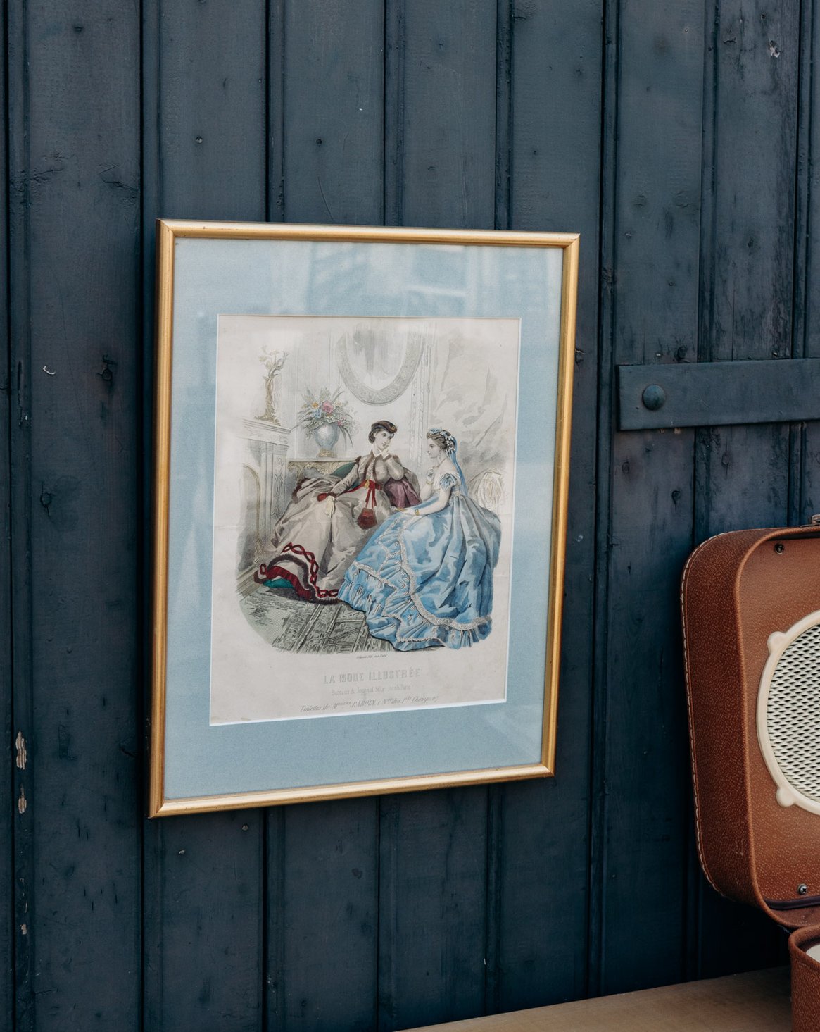 Découvrez cette gravure de mode sur toile, mise en valeur par un cadre en bois doré qui souligne les délicates nuances de bleu et le tracé élégant du motif. Son format élancé et ses proportions verticales lui confèrent une présence graphique parfaite pour animer une entrée, habiller un pan de mur étroit ou rythmer une composition murale au-dessus d'une console. La rencontre de la toile et du bois crée une matière chaleureuse et texturée, apportant une ambiance raffinée et contemplative à votre intérieur.