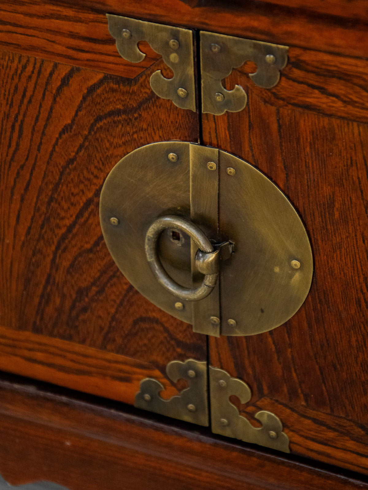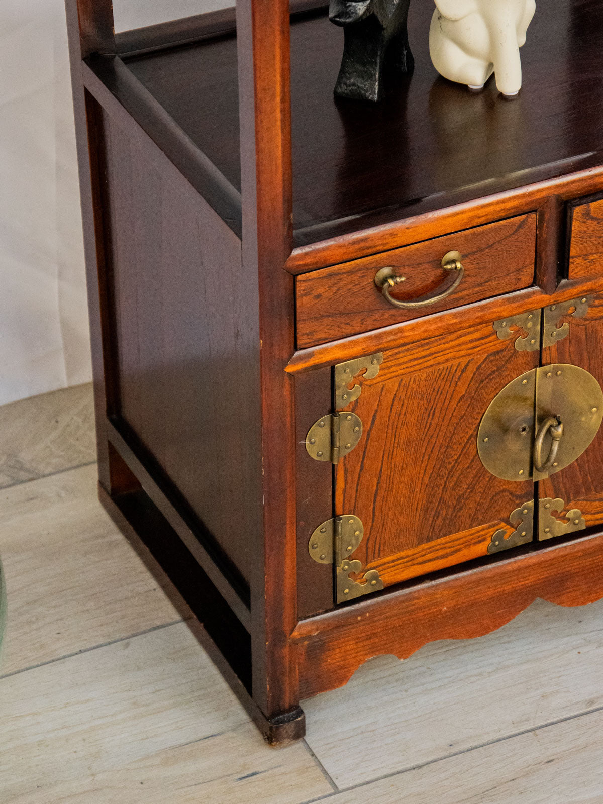 Adoptez ce chevet d'inspiration chinoise en bois, rehaussé d'un métal doré brossé, qui apporte une touche élégante et chaleureuse à votre chambre ou salon. Ses deux tiroirs et sa double porte s'ouvrant sur un grand compartiment offrent un rangement organisé et discret pour livres, accessoires ou linge de nuit. Ses proportions le rendent aussi pratique comme meuble d'appoint dans une entrée, tandis que la patine du bois et la finition métallisée créent une atmosphère raffinée.
