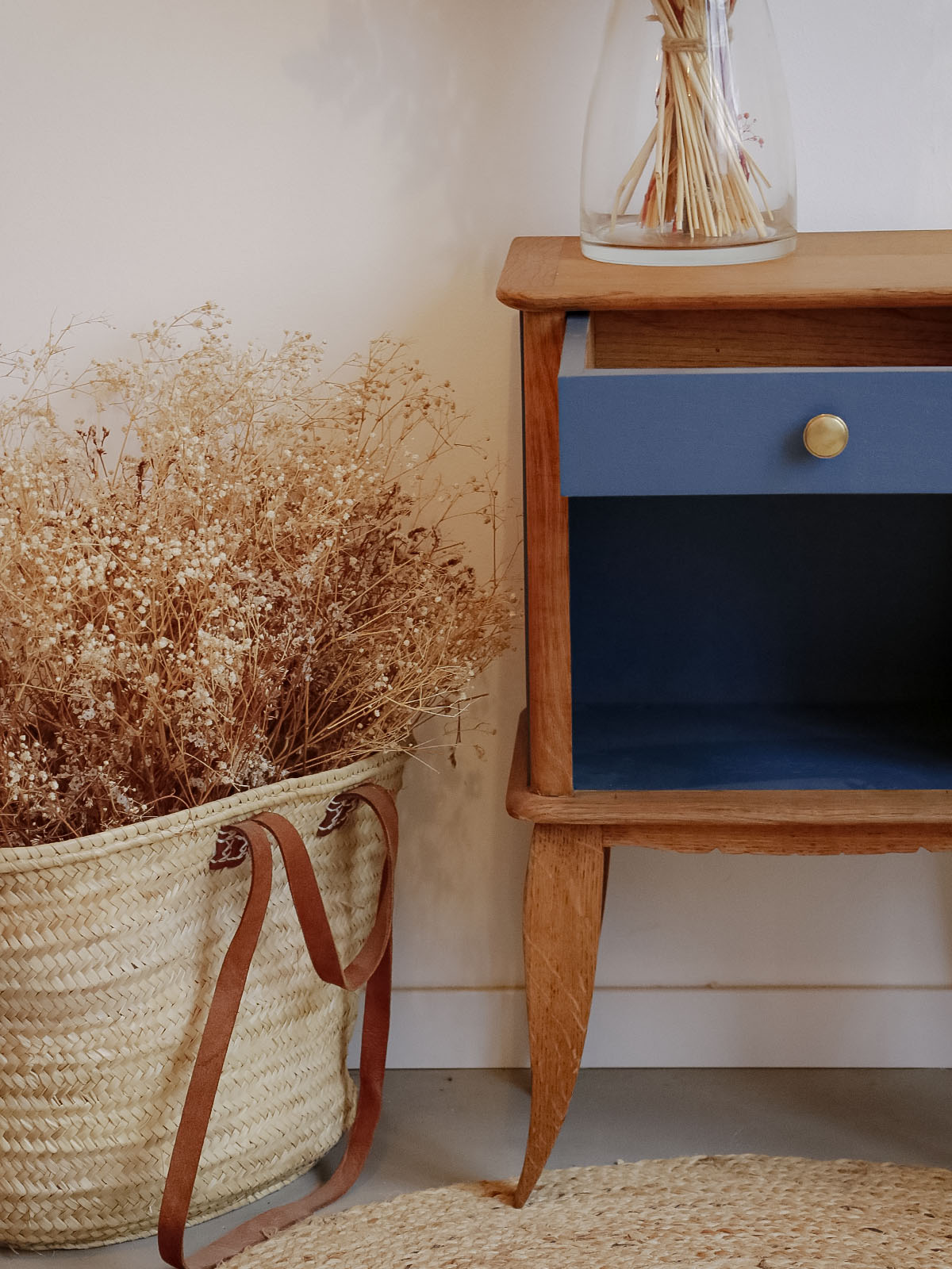 Adoptez ce chevet en plaquage chêne au charme campagne, rehaussé d'un bleu doux et de pieds courbés qui lui confèrent une silhouette élégante. Un tiroir discret et une niche accueillante offrent un rangement astucieux pour vos livres, lampe de chevet et petits indispensables, tandis que ses proportions compactes se glissent facilement au côté du lit.. Le mélange du bois et de la teinte subtile crée une atmosphère chaleureuse et sereine, parfaite pour une décoration sobre et inspirée.