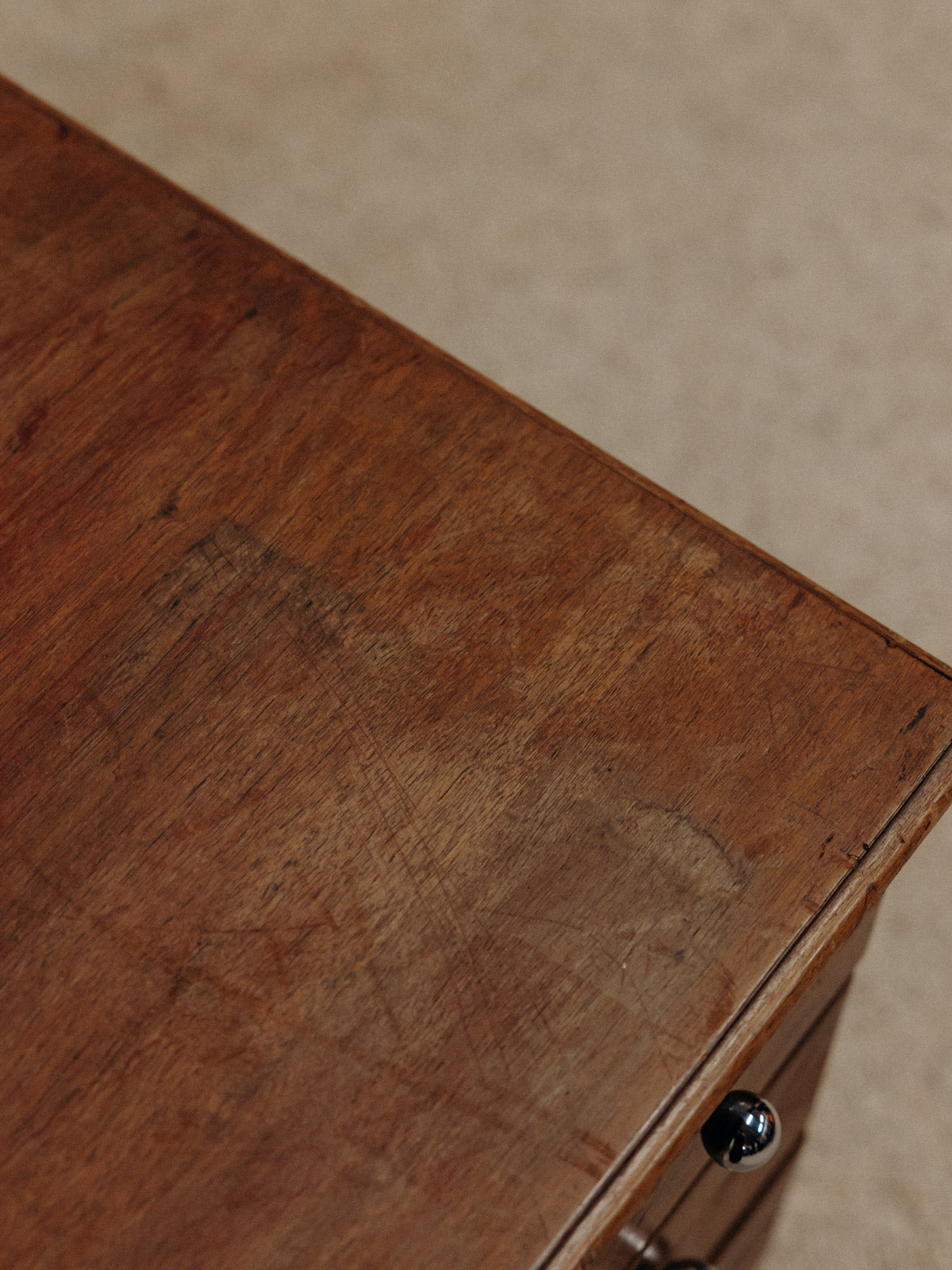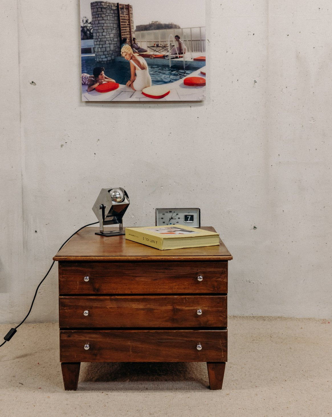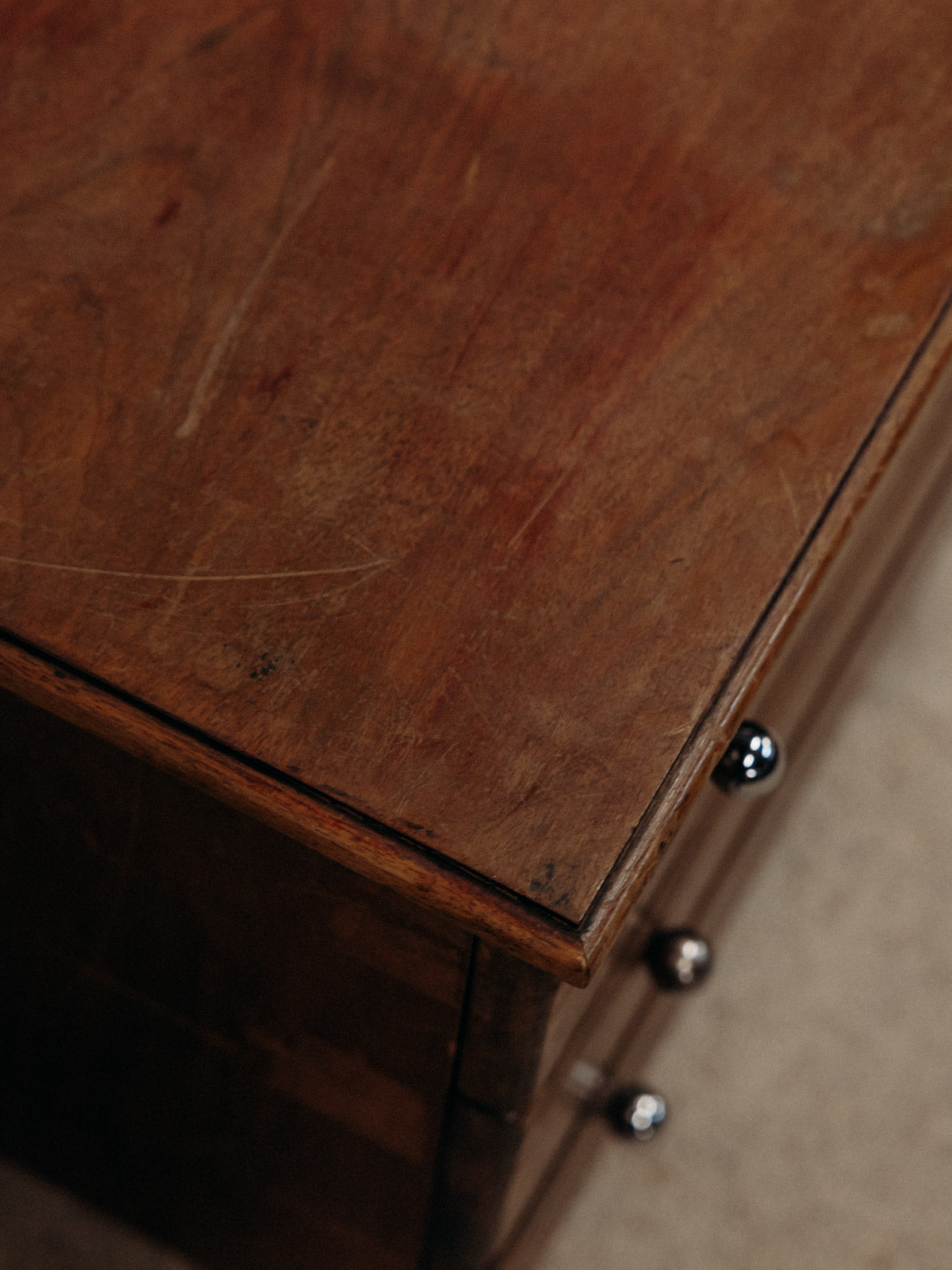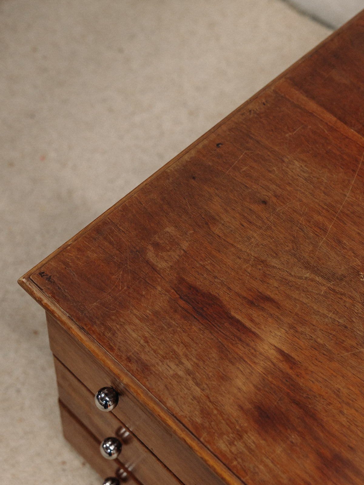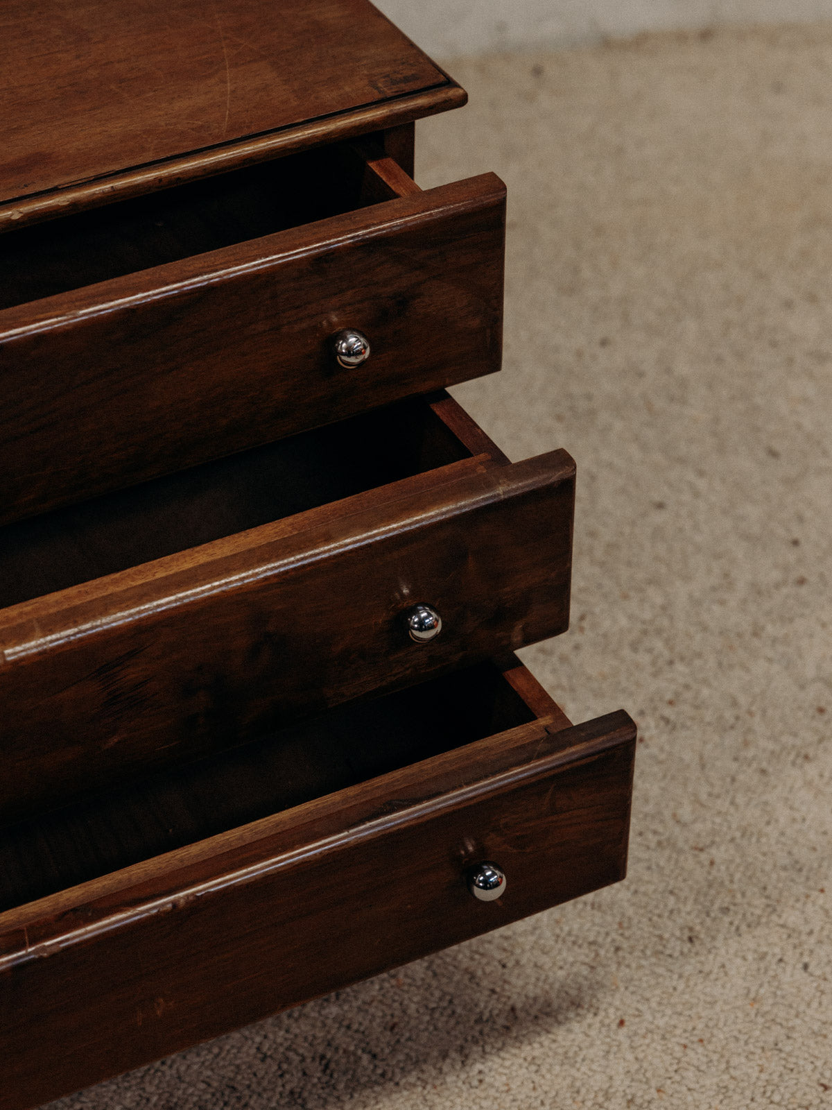 Apportez à votre intérieur cette commode basse en bois foncé, au format bas et profond offrant un rangement généreux dans un salon ou une chambre. Ses trois tiroirs, rehaussés de boutons ronds chromés, conjuguent praticité et élégance tandis que les pieds fuselés allègent sa silhouette. Le bois sombre et la finition subtile instaurent une atmosphère chaleureuse et sobre, propice à une décoration contemporaine ou rétro. Légères traces du temps présentes et variables suivant la commode.