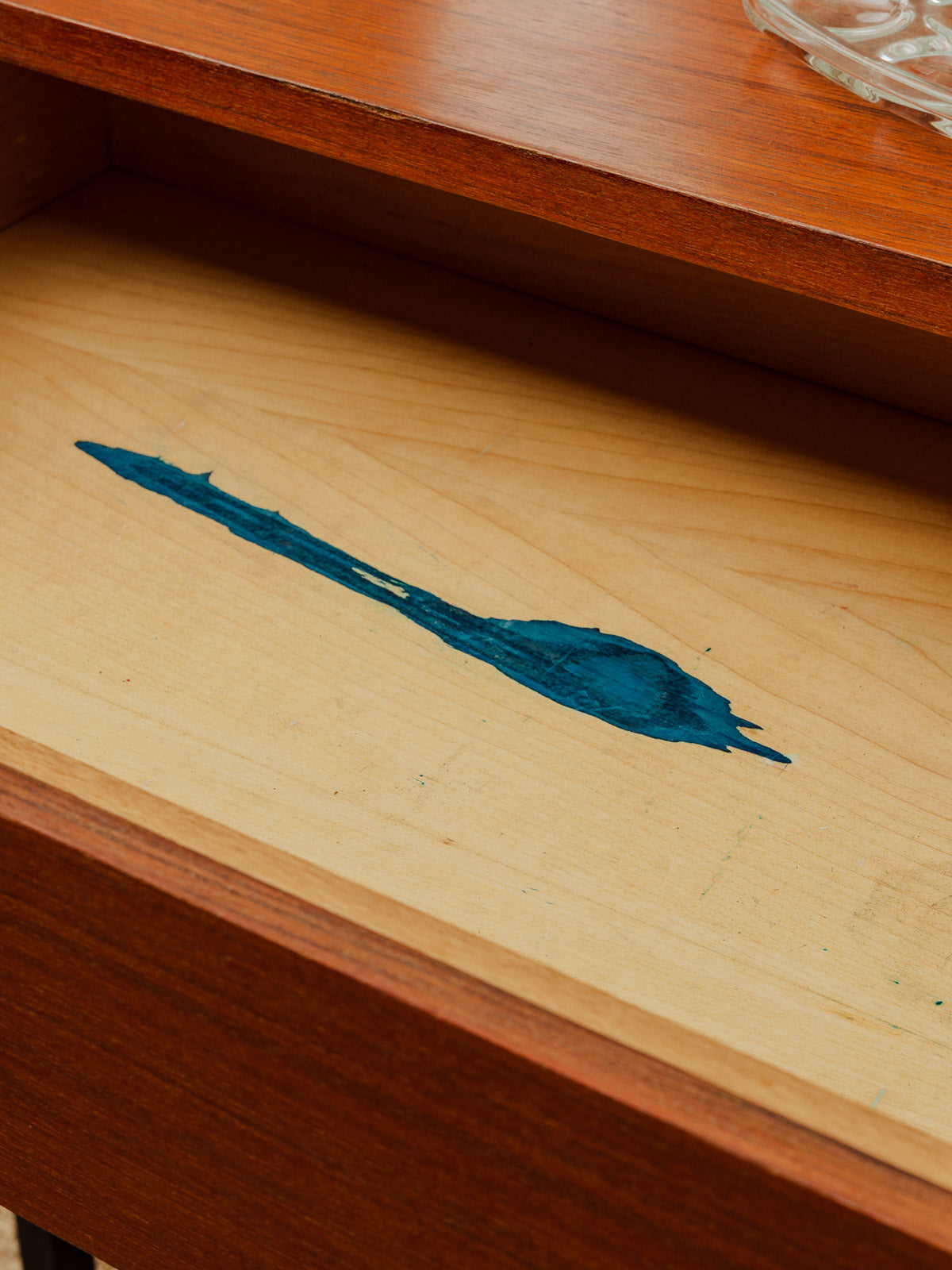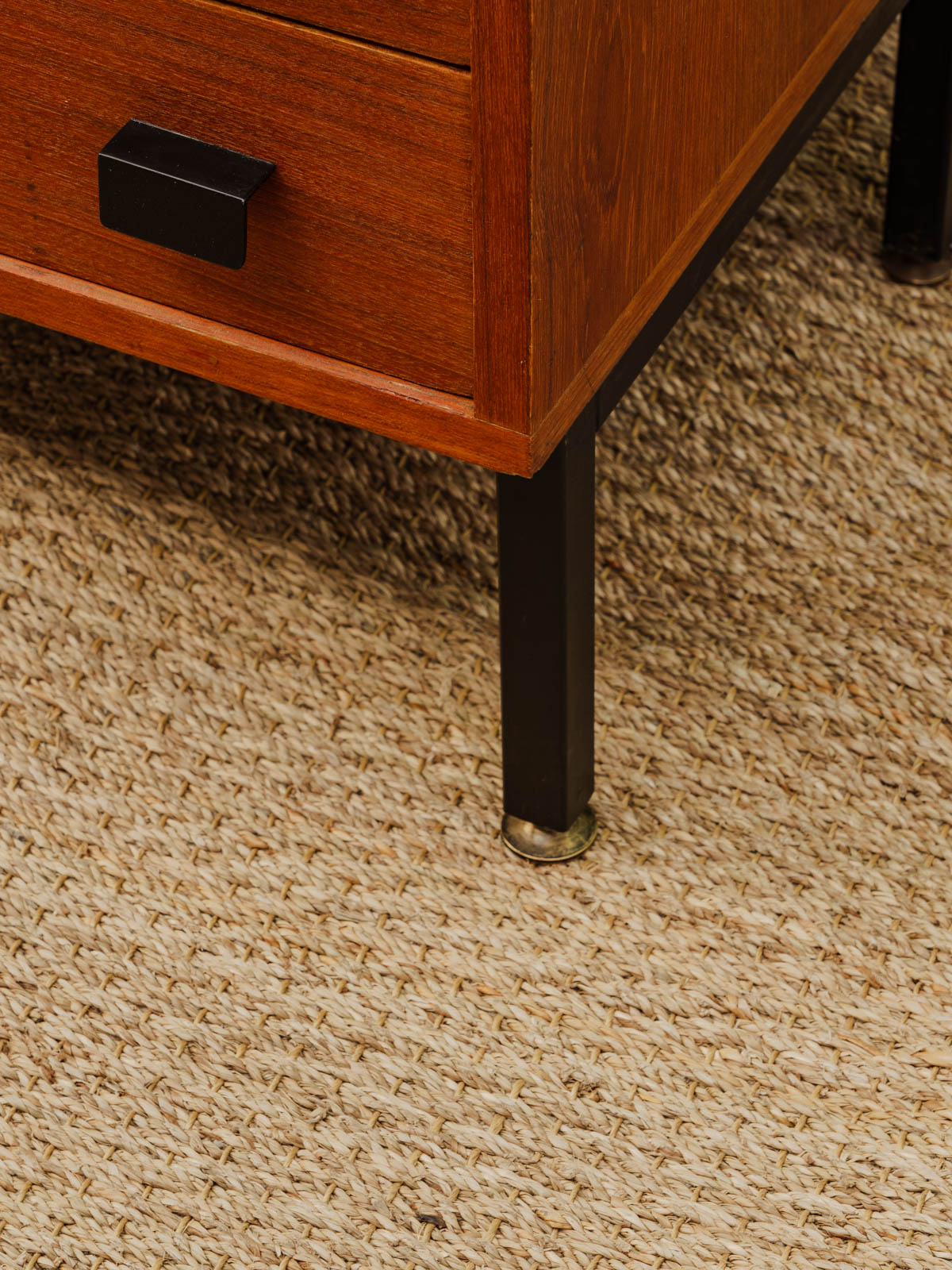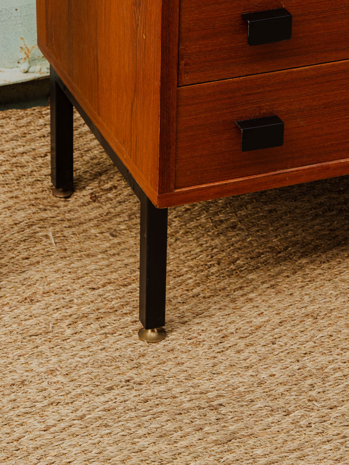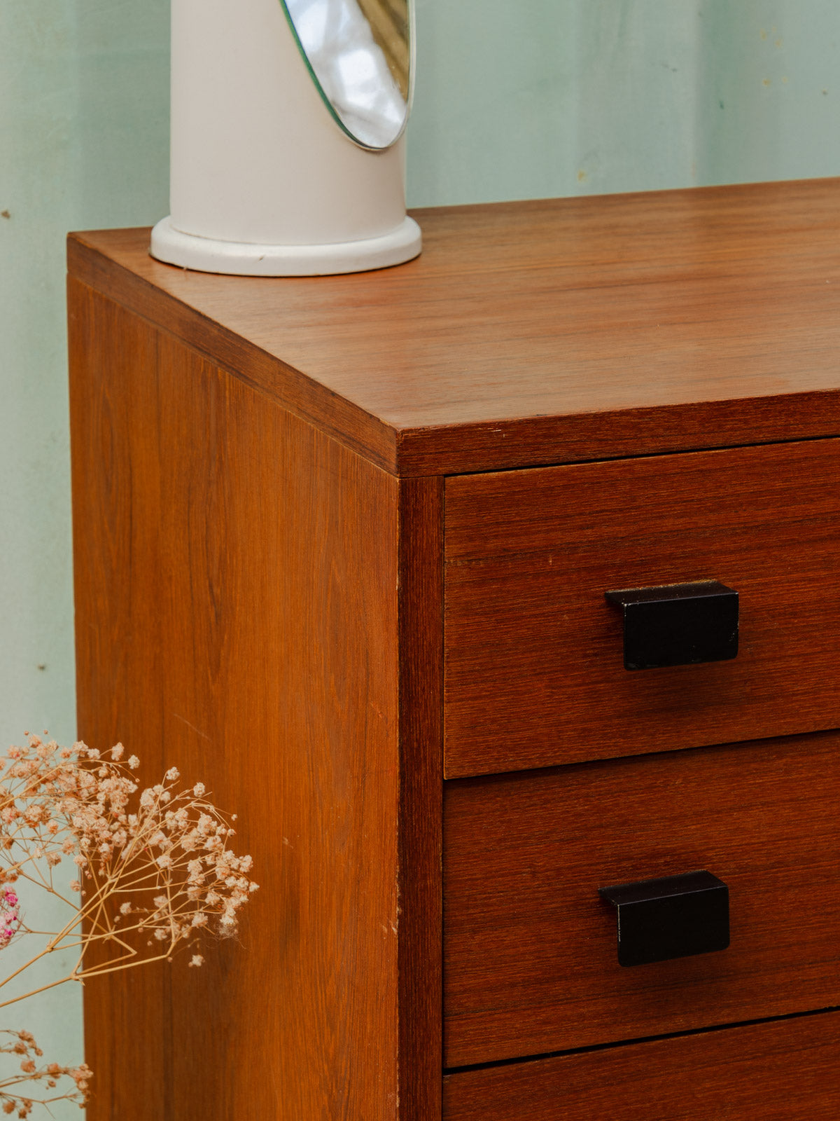 Ajoutez une commode en bois au style contemporain et chaleureux, animée par quatre tiroirs pratiques pour organiser linge et accessoires. Les poignées et pieds en métal noir, relevés de ronds dorés, apportent une élégante note graphique tandis que la patine sombre souligne une silhouette de caractère, idéale dans une entrée ou une chambre. Quelques traces du temps et une tache dans le premier tiroir.