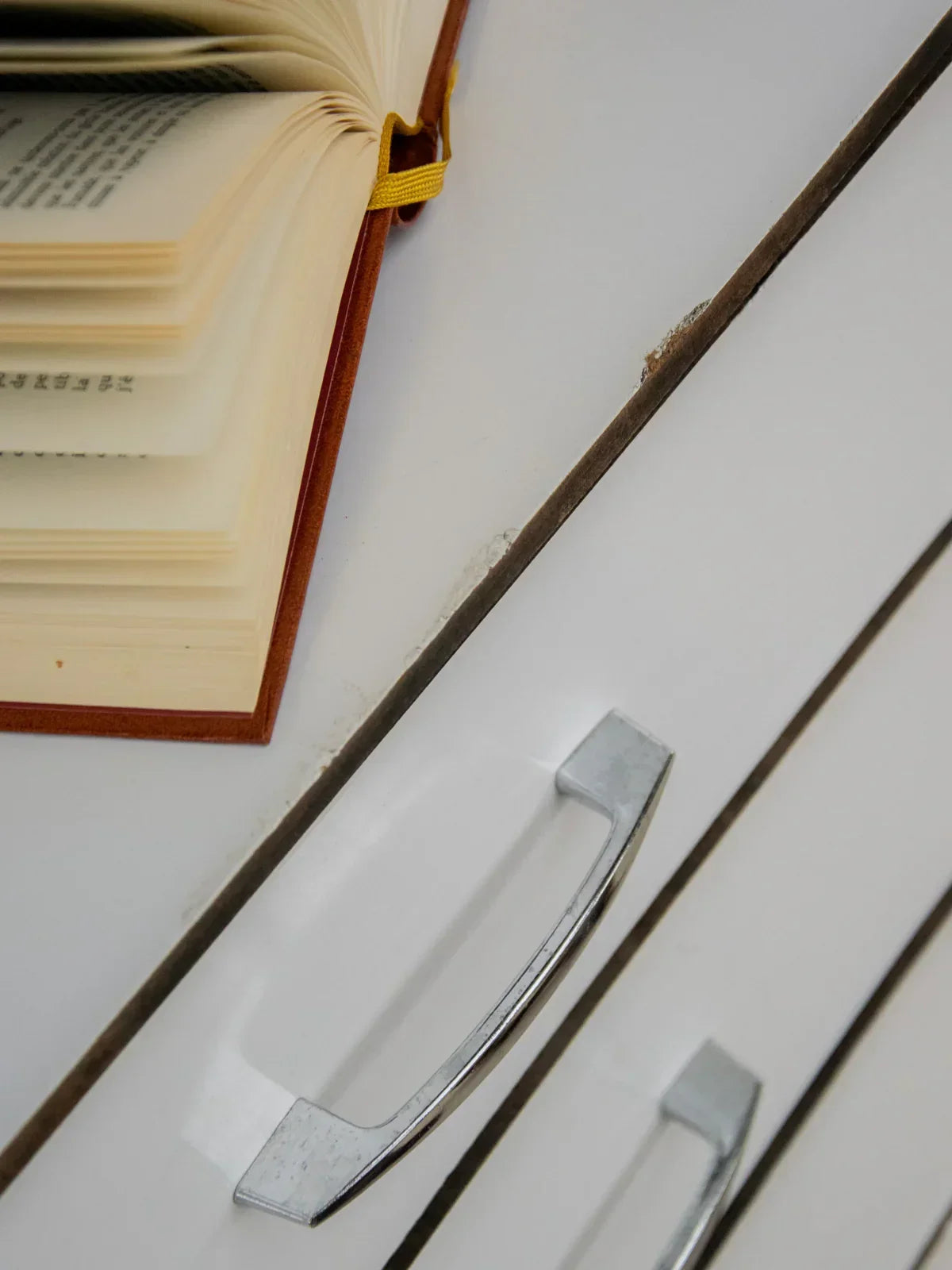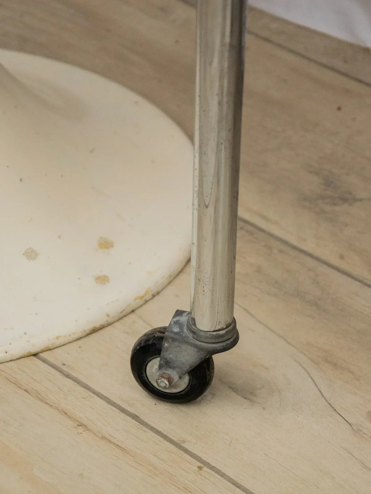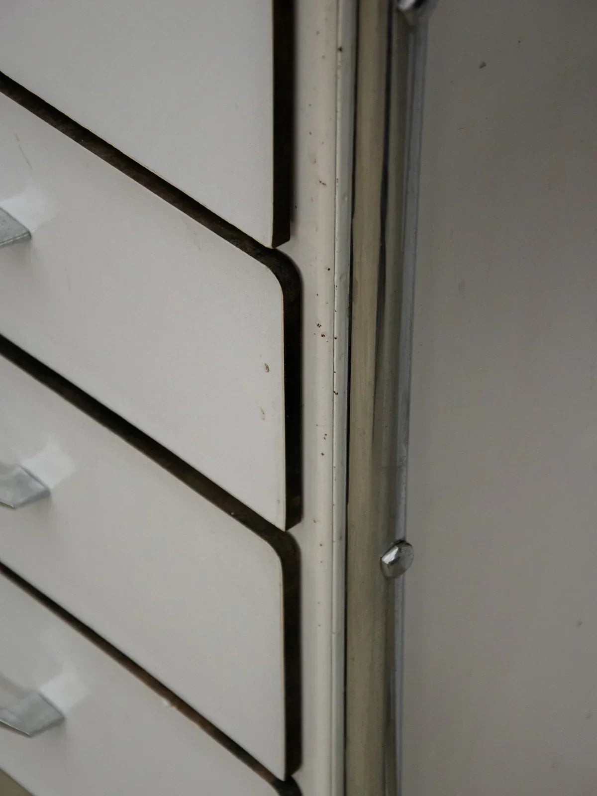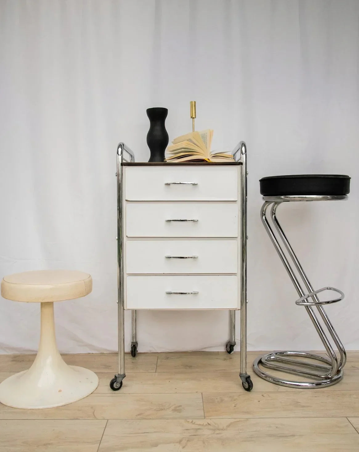 Offrez une commode blanche à quatre tiroirs, associant un esprit contemporain à des montants et poignées chromées qui apportent une élégante note métallique. Montée sur roulettes, elle propose un rangement modulable pour une entrée, un bureau ou une chambre, son plateau large accueillant objets du quotidien. De petits éclats sont visibles sur l'arête avant et arrière ainsi qu'un tiroir, et les roulettes glissent difficilement du fait de son poids. Quelques marques d'usage qui font son authenticité.