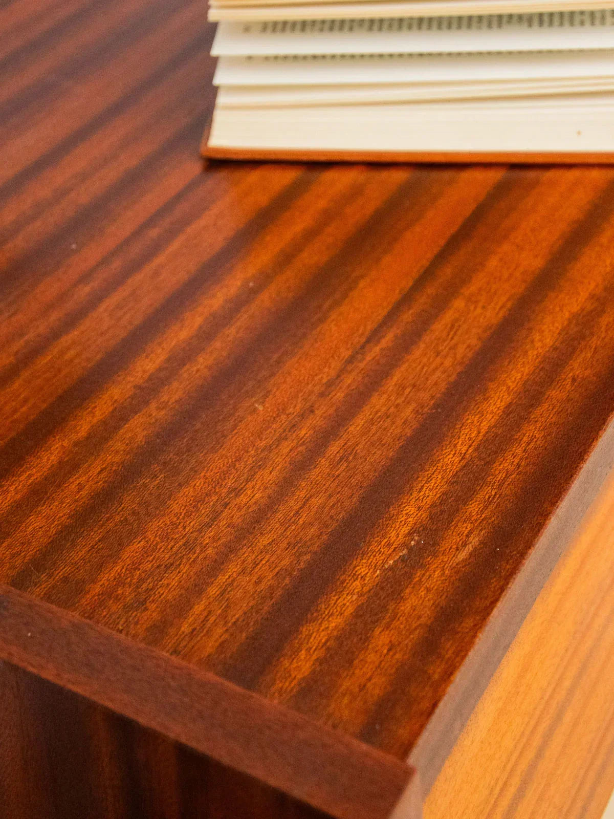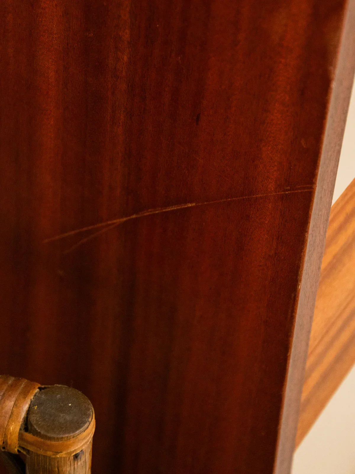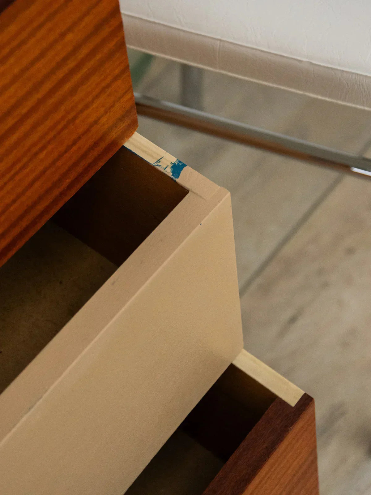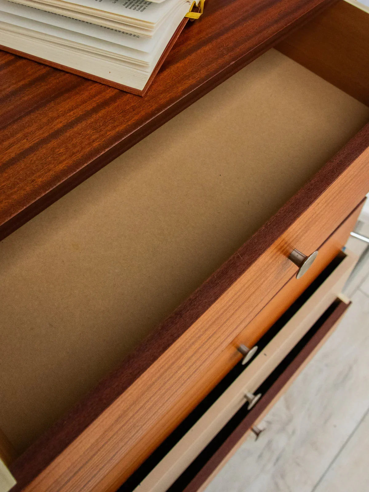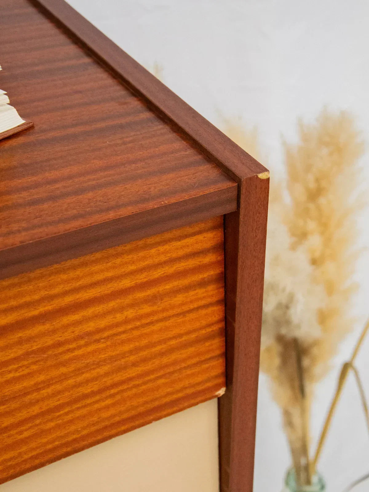 Découvrez cette commode bicolore à cinq tiroirs, sublimée par des boutons en zinc et des pieds compas qui lui confèrent un esprit rétro-chic et aérien. Ses proportions généreuses offrent un rangement fonctionnel pour linge et accessoires, tandis que le contraste des finitions apporte une élégance discrète à la chambre ou à l'entrée. On note quelques rayures sur un flanc et de petits éclats aux angles, signes d'une histoire assumée.