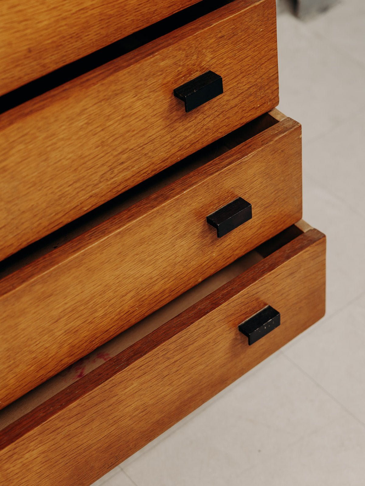 Découvrez cette commode aux bords arrondis en bois, dont les quatre tiroirs incurvés offrent un rangement ordonné et accessible, tandis que deux poignées en bois noir soulignent sa silhouette douce et contemporaine. Son format compact libère l'espace tout en proposant des compartiments peu profonds, parfaits pour la lingerie, les textiles délicats ou les accessoires, et sa patine chaleureuse instaure une atmosphère élégante et apaisante dans une chambre ou une entrée.