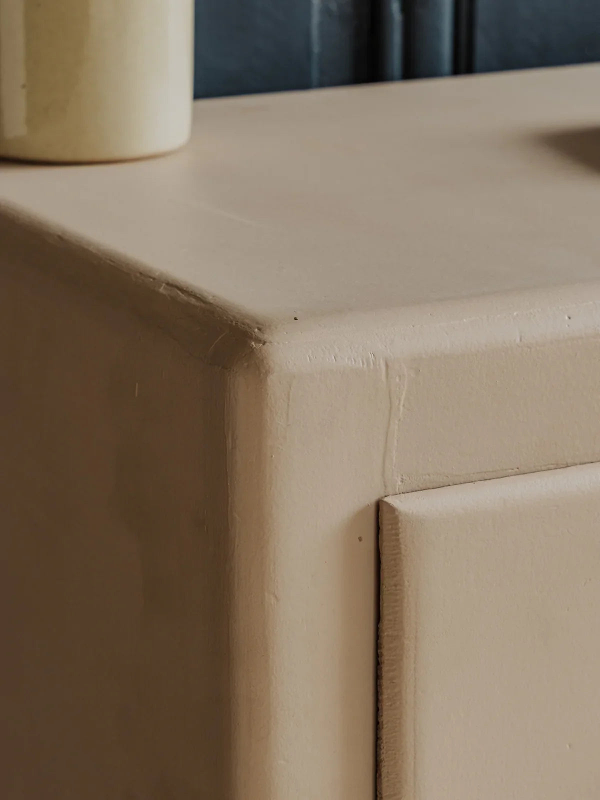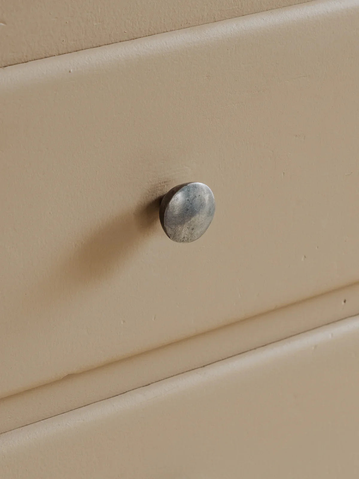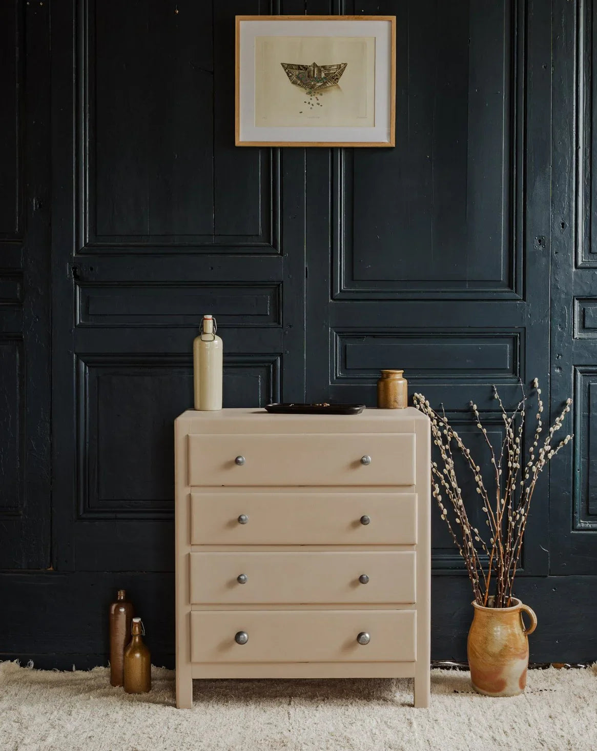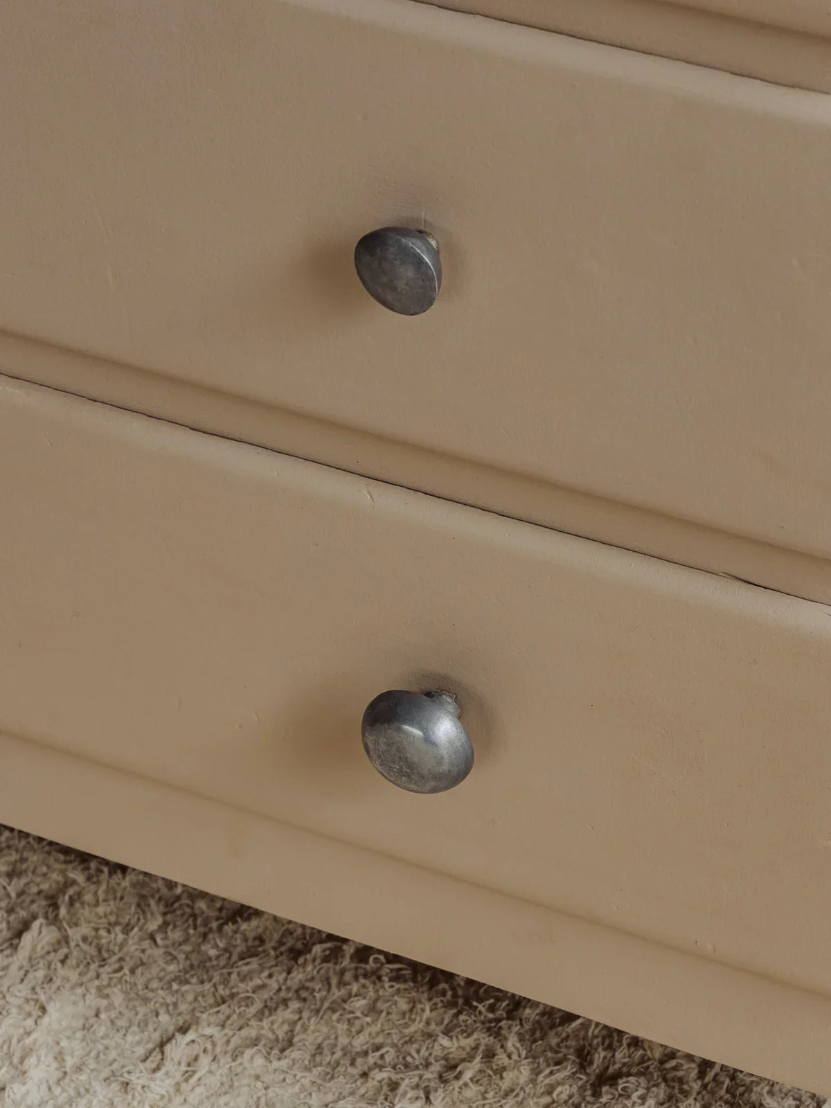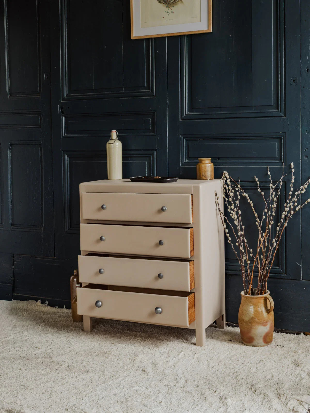 Adoptez cette commode style mado en bois peint en beige aux lignes douces et proportions pratiques. Quatre tiroirs offrent un rangement modulable tandis que les poignées rondes argentées, plus imposantes sur le tiroir inférieur, créent un contraste subtil et contemporain. Sa finition mate et sa teinte neutre s'intègrent facilement à des intérieurs scandinaves ou bohèmes, apportant chaleur et fonctionnalité. Quelques traces du temps présentes.