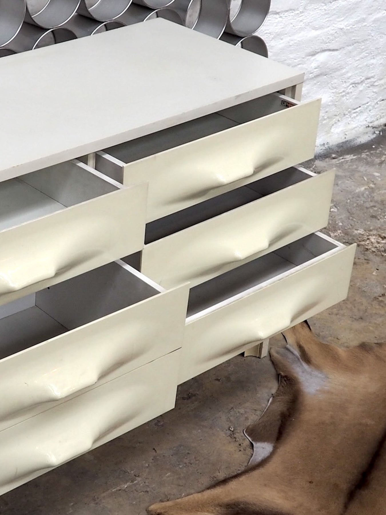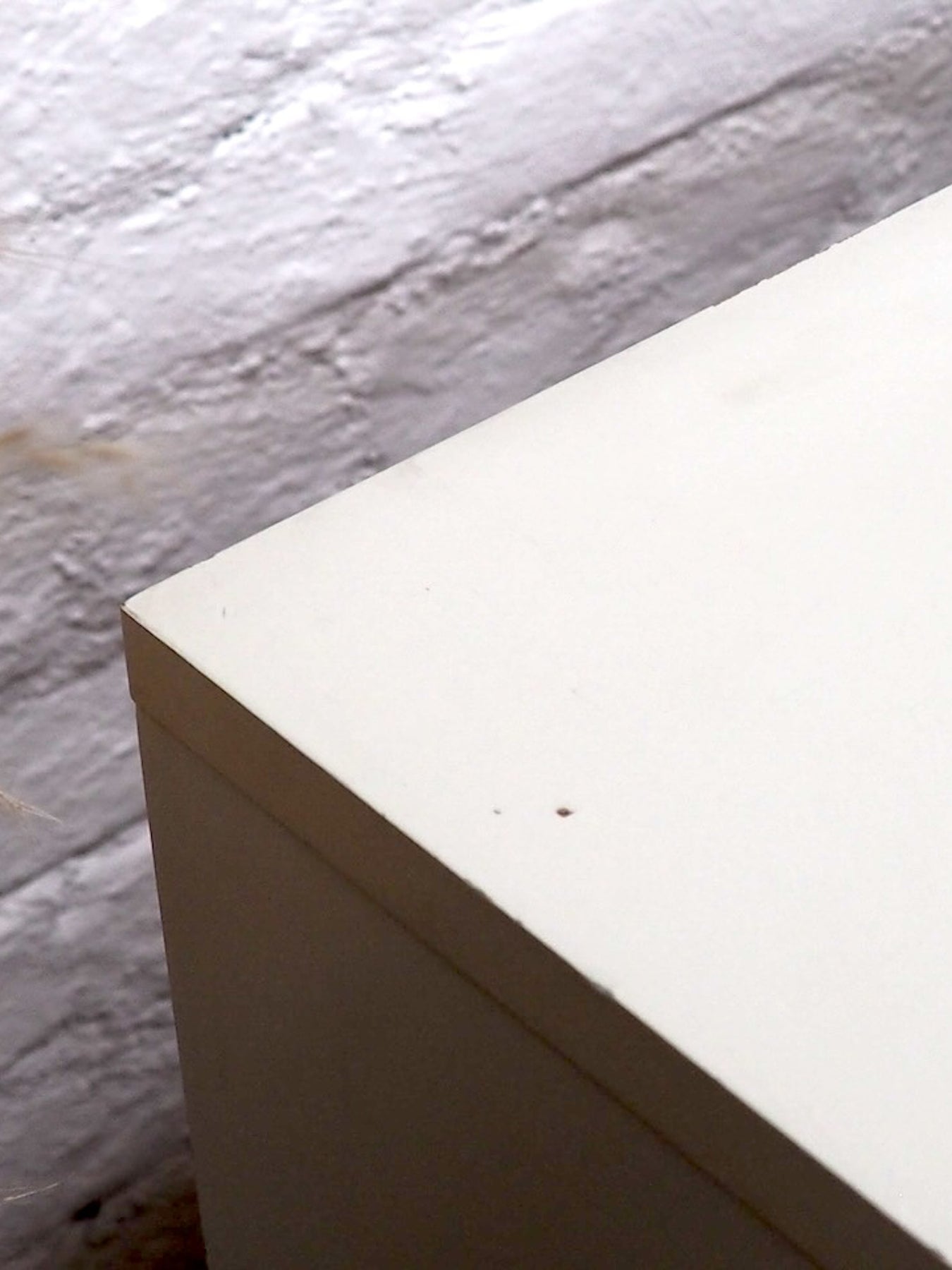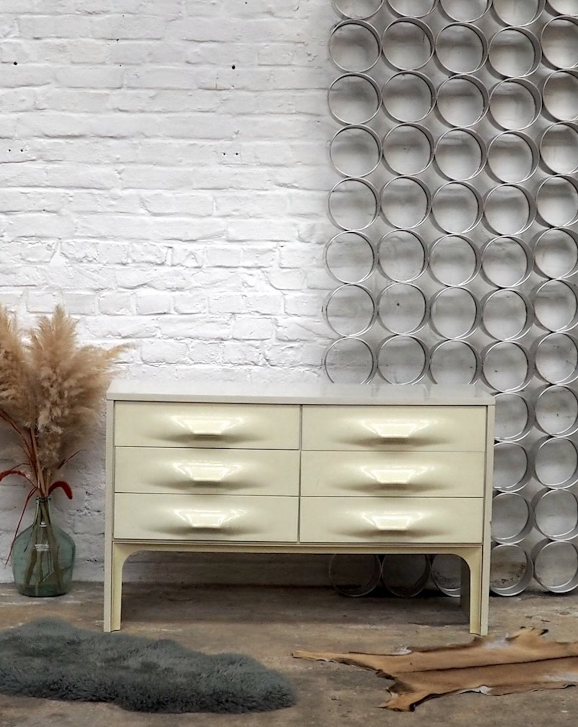Sublimez votre intérieur avec cette commode Raymond Loewy des années 1960, en mélaminé et plastique, qui marie modernité et élégance vintage. Sa structure solide et ses tiroirs agencés en simple et double offrent un rangement modulable, idéal pour organiser linge ou papiers tout en conservant une silhouette raffinée. Les proportions étudiées lui permettent d'être présente sans encombrer l'espace, apportant une ambiance sobre et chaleureuse. Quelques traces d'utilisation.