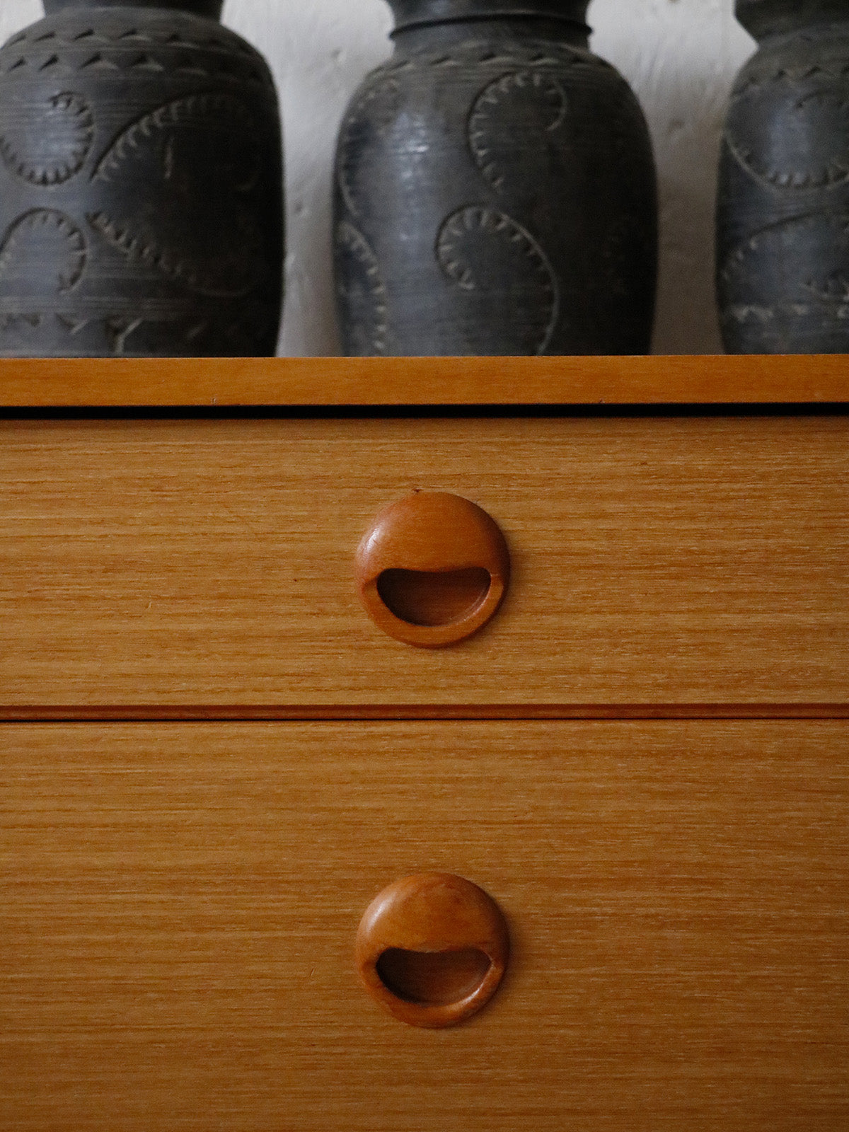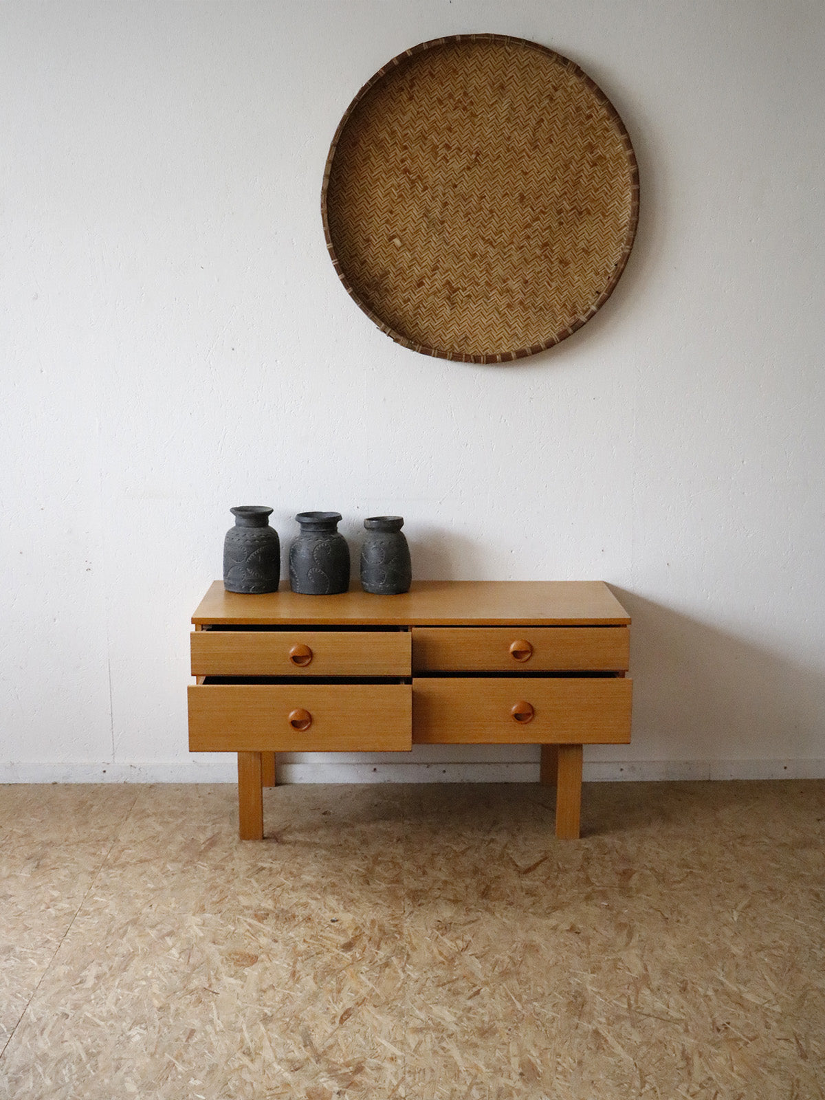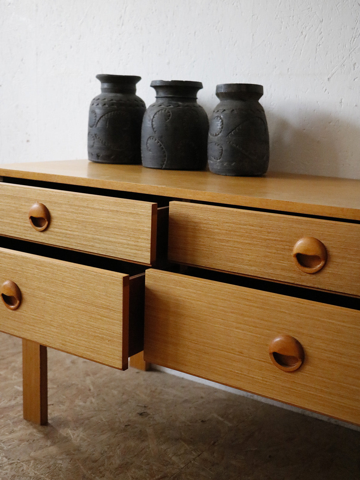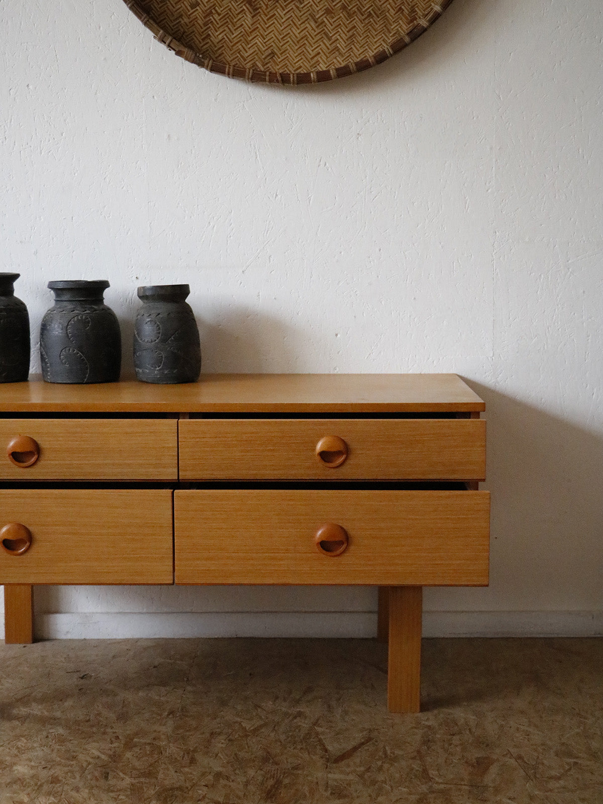 Apportez une touche rétro et raffinée avec cette petite enfilade signée Schreiber, made in England, habillée d'un placage teck blond qui révèle des veines chaleureuses et un design des années 60. Son format compact et ses quatre tiroirs aux hauteurs différenciées offrent un rangement modulable, du linge aux petits objets, tout en libérant un plateau accueillant pour lampe et décor. Les lignes épurées et la patine douce instaurent une ambiance élégante et apaisée, idéale pour salon, entrée ou chambre en tant que commode.