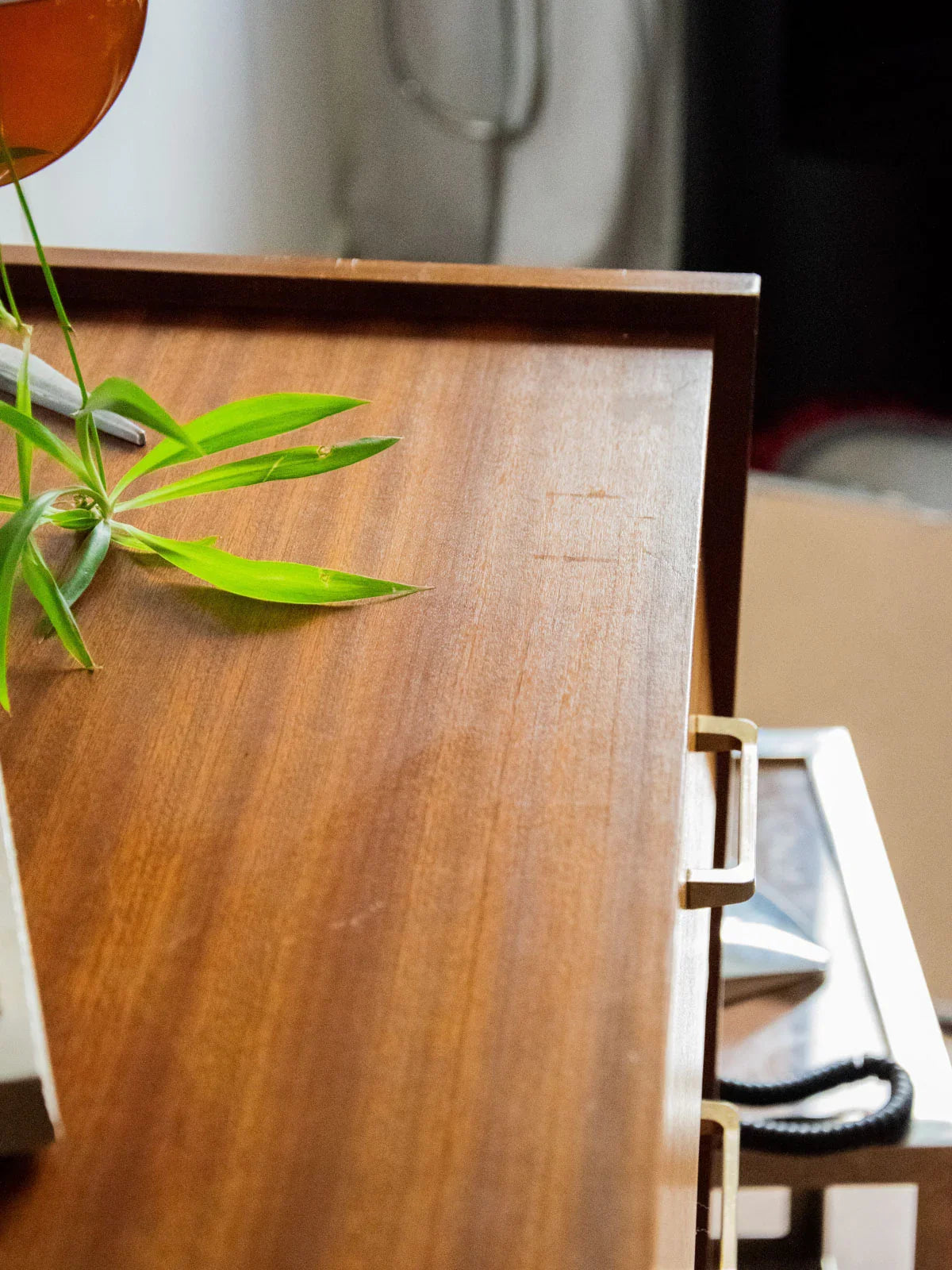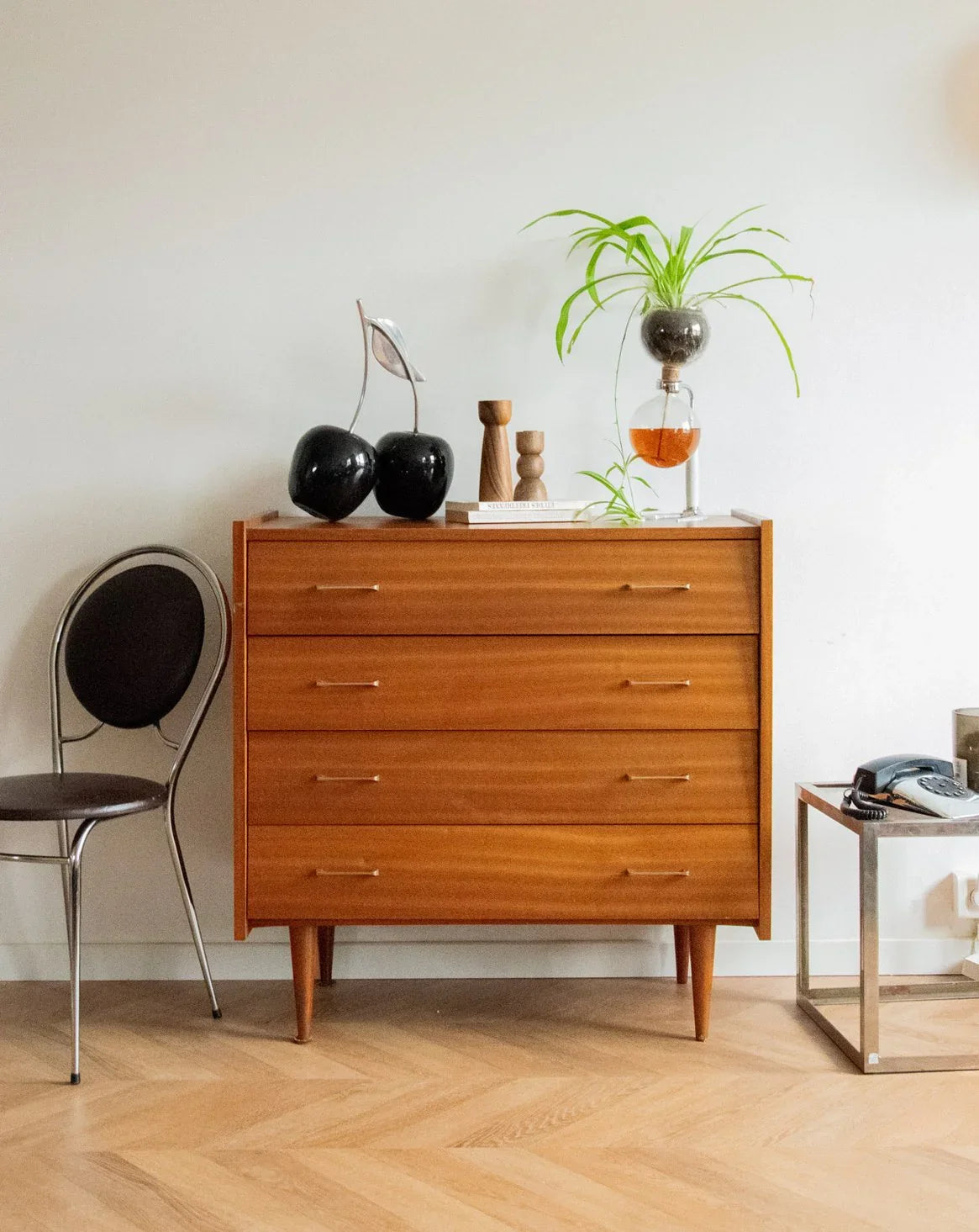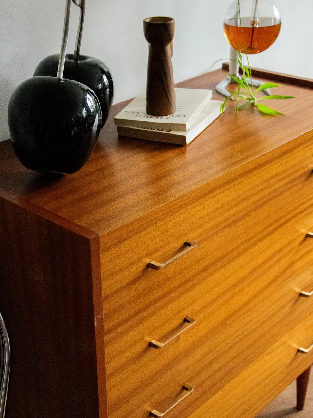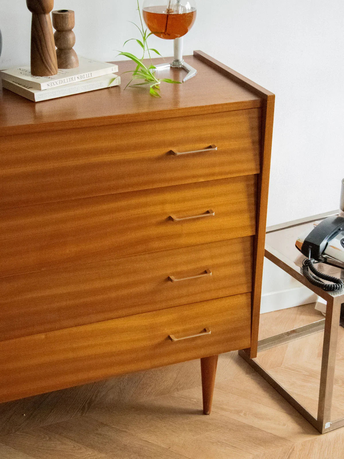 Adoptez cette commode scandinave en teck aux lignes épurées et pieds compas, où le bois chaud s'accorde à des touches métal acier pour un contraste contemporain. Quatre tiroirs offrent un rangement fonctionnel, idéal pour organiser chambre ou entrée sans encombrer les volumes, grâce à des proportions étudiées. Son grain naturel et sa silhouette légère diffusent une ambiance douce et raffinée, parfaite dans un intérieur nordique ou un décor plus urbain.