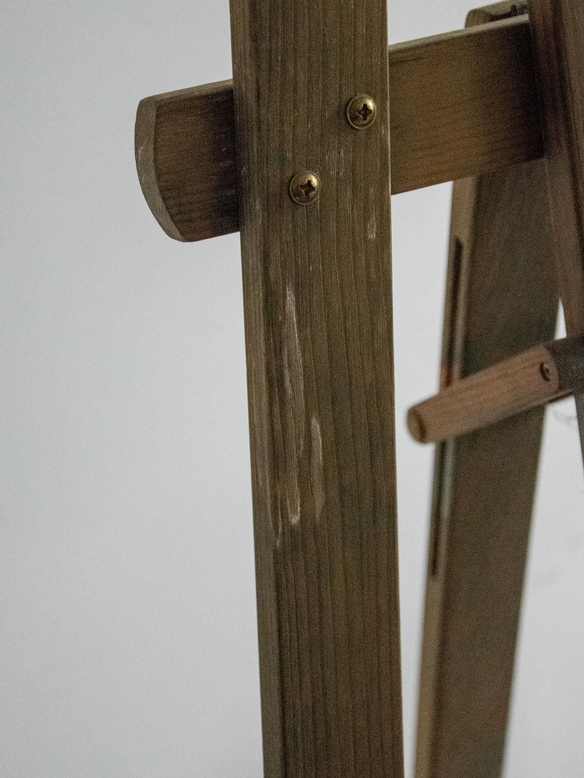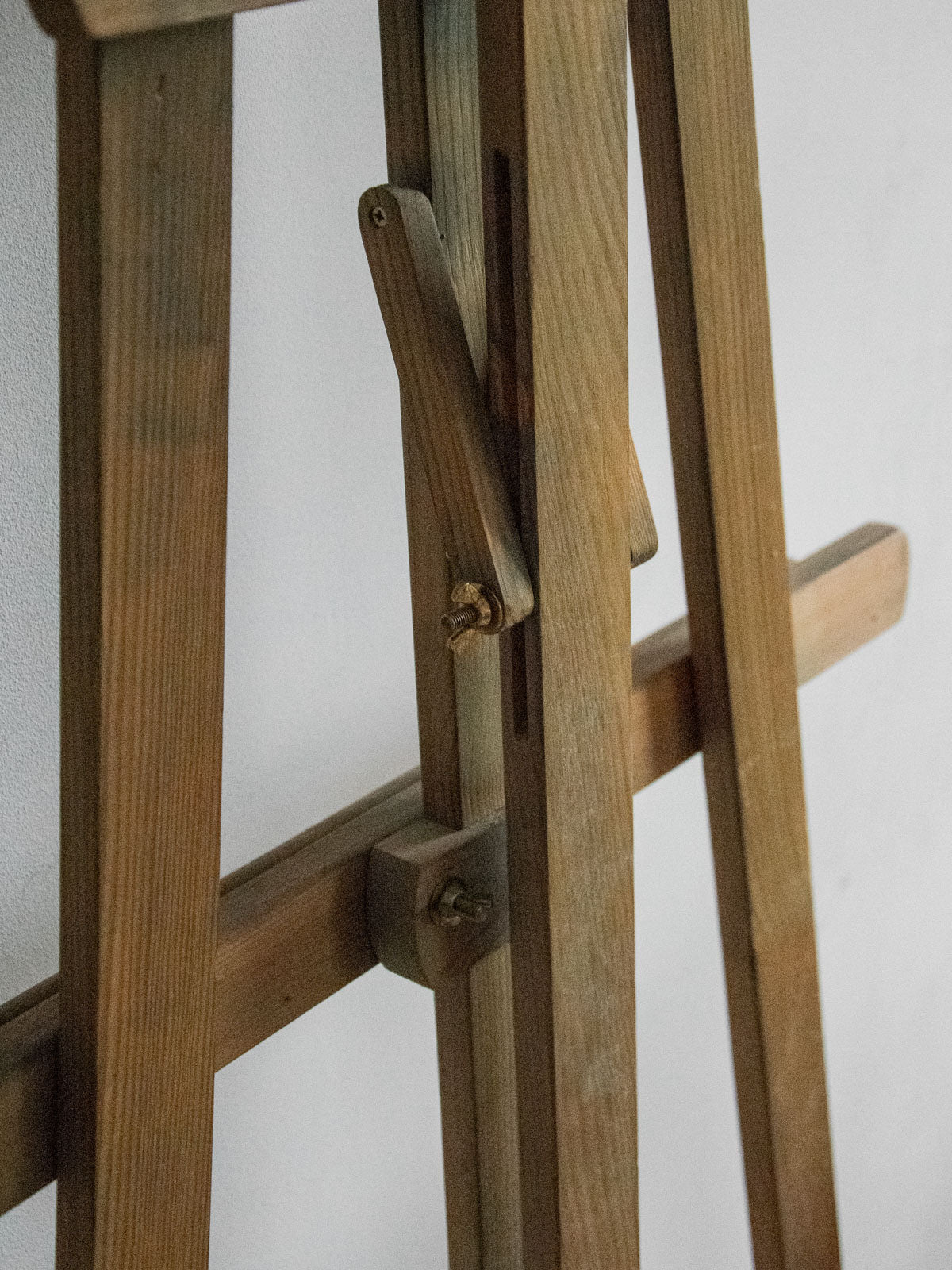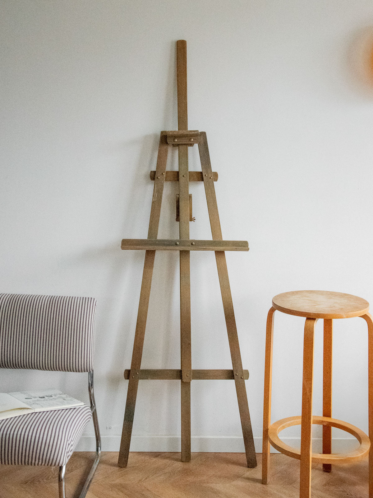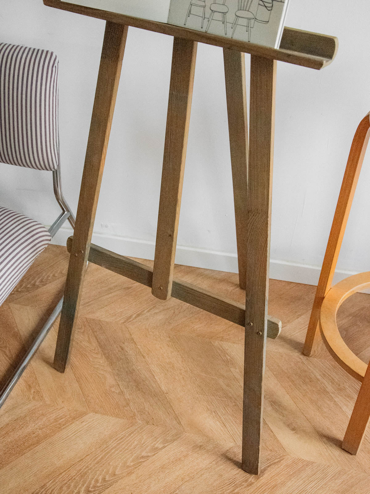 Adoptez ce chevalet à tableau réglable en bois grisé, aux lignes sobres et à la patine marquée, dont la structure modulable accueille des toiles de formats variés pour le travail comme pour la mise en scène. Le bois, travaillé simplement, apporte une présence chaleureuse et stable, idéale pour peindre debout ou présenter une œuvre dans un intérieur au style atelier. Quelques éclaboussures de peinture témoignent de son histoire.