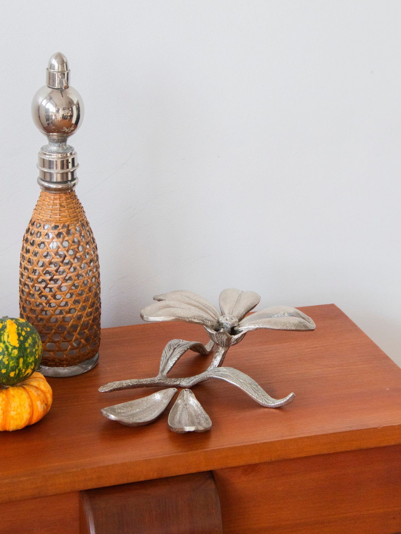 Découvrez ce cendrier fleur des années 1970 en laiton massif argenté, une pièce sculpturale au travail de ciselure délicat. Ses six pétales détachables se transforment en autant de cendriers individuels ou mini coupelles, offrant une modularité ludique pour la table ou le salon. Son éclat patiné et sa silhouette intrigante apportent une touche rétro-chic et décorative, idéale comme objet d'appoint ou pièce de collection. Petit défaut d'origine sur un pétale, peu visible.