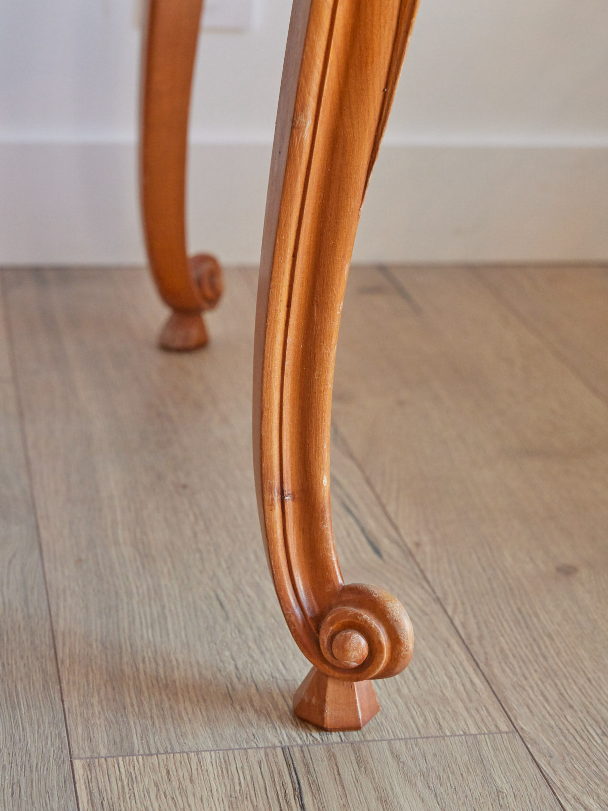 Apportez une touche raffinée avec cette table d'appoint en marbre rose et bois, où la douceur du veinage répond à la chaleur du piètement en bois massif. Son plateau généreux et son équilibre de proportions offrent un support idéal pour une lampe, des livres ou une plante, s'intégrant aussi bien dans un salon contemporain que dans un intérieur plus classique. Le plateau est lourd et simplement posé, non fixé mais stable une fois en place.