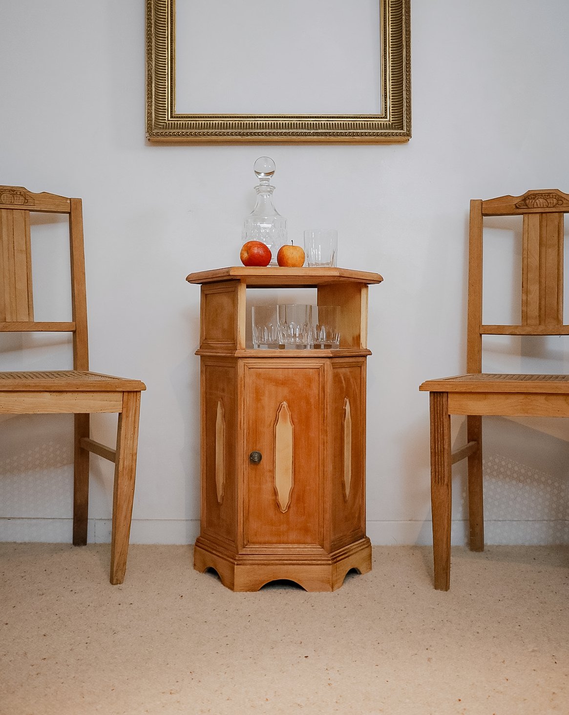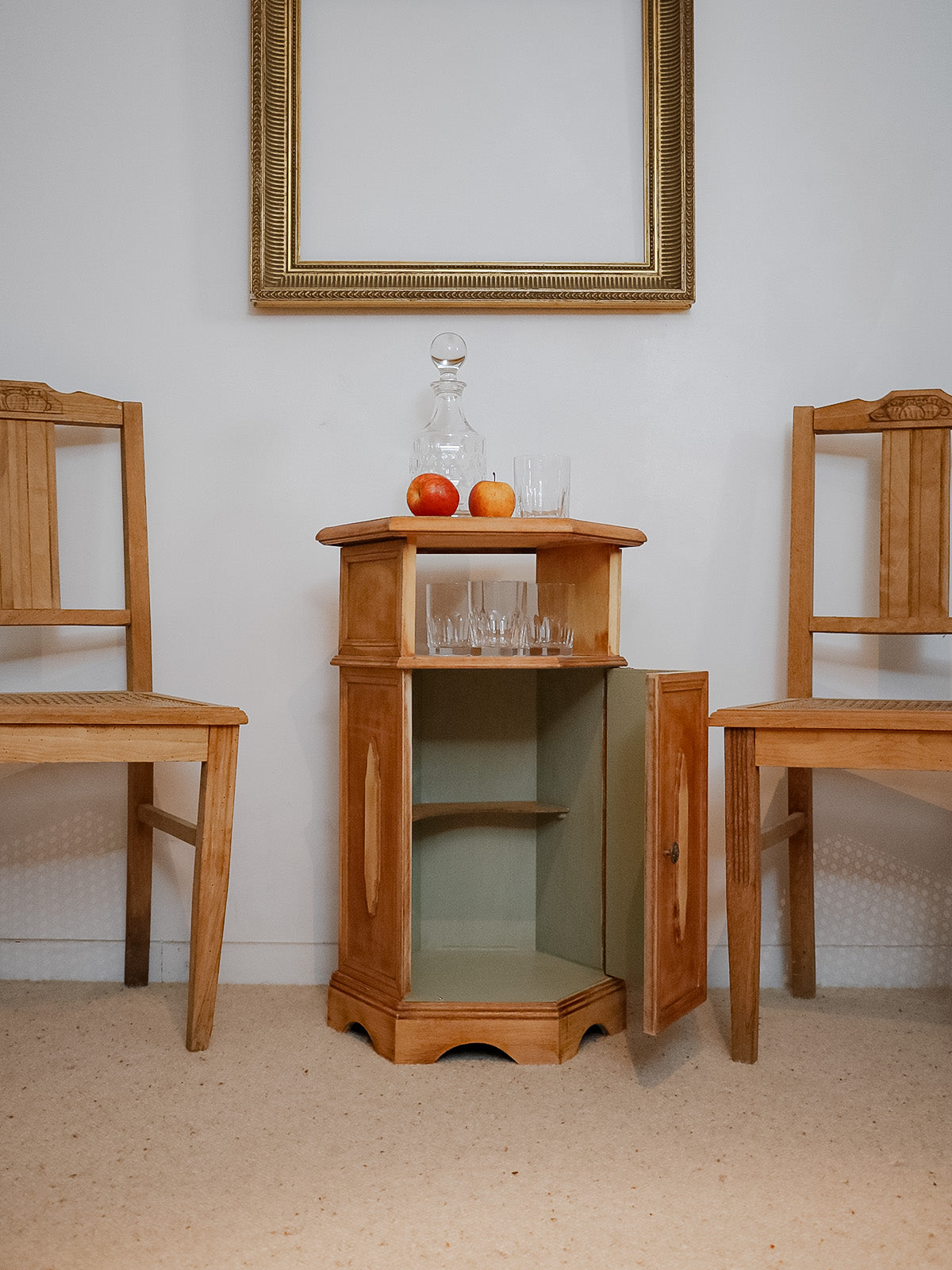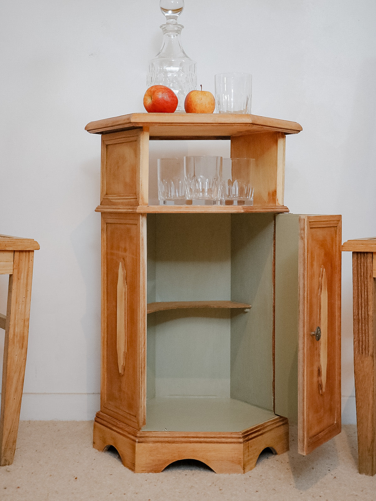 Sublimez votre intérieur avec ce bar hexagonal des années 30 en bois exotique et plaquage, rehaussé de moulures caractéristiques de l'Art déco. Sa niche et son étagère offrent un rangement pensé pour bouteilles et verrerie, tandis qu'une petite étagère intérieure optimise l'espace pour accessoires de service. Le bois clair et l'intérieur vert lichen créent un contraste doux, apportant une touche chaleureuse et graphique à votre salon ou salle à manger. Ses proportions compactes en font une pièce pratique à installer dans un coin.
