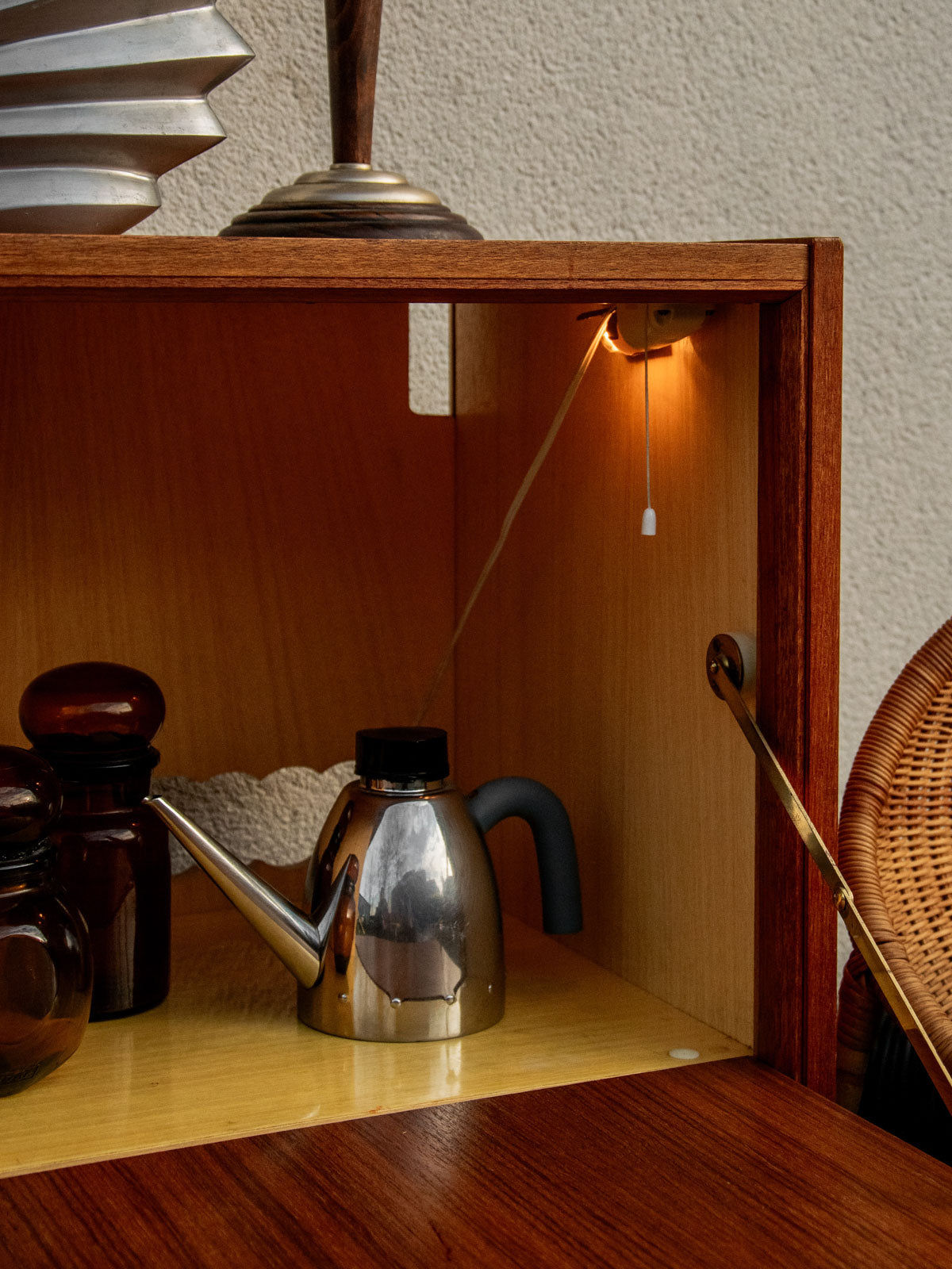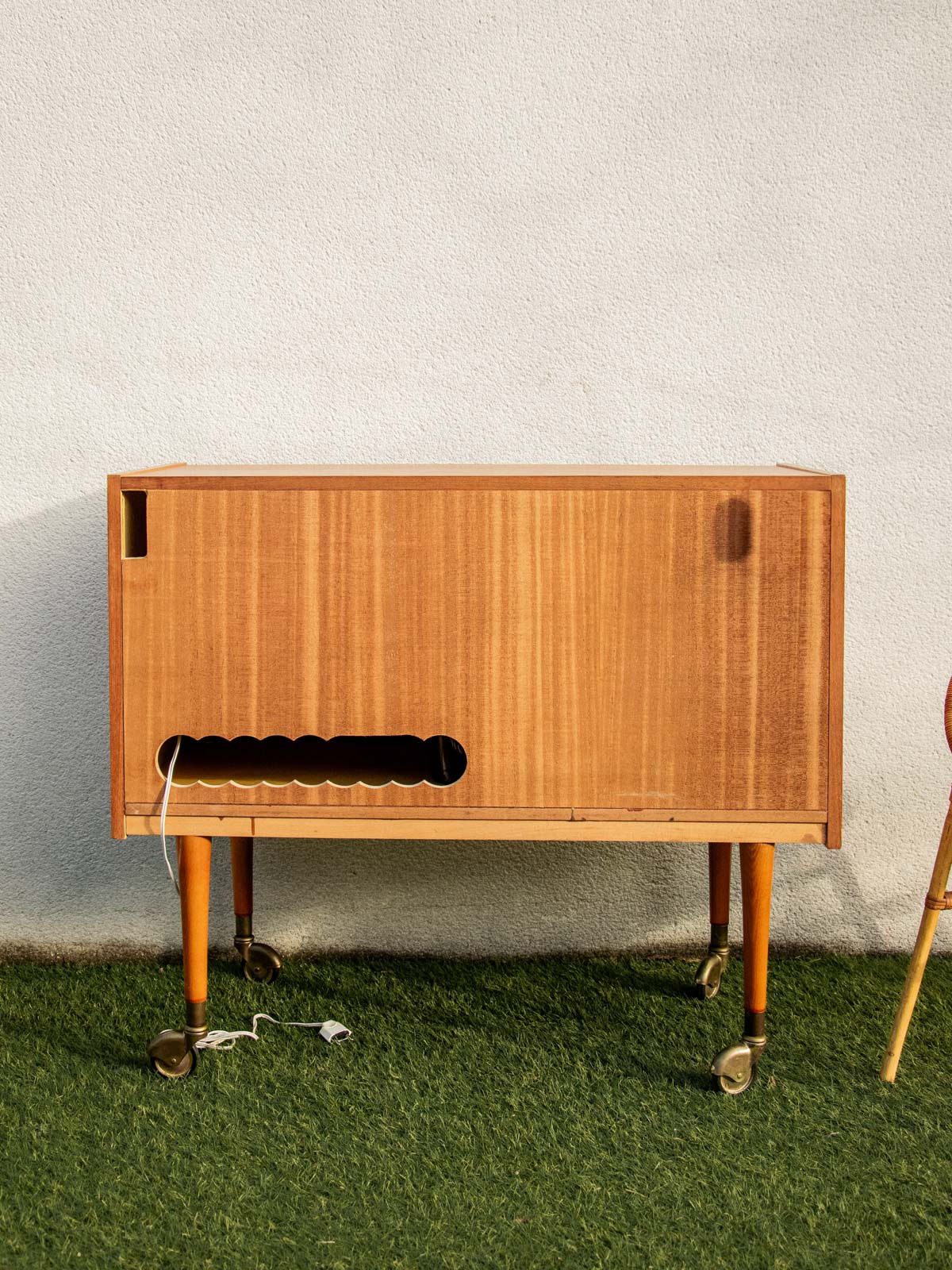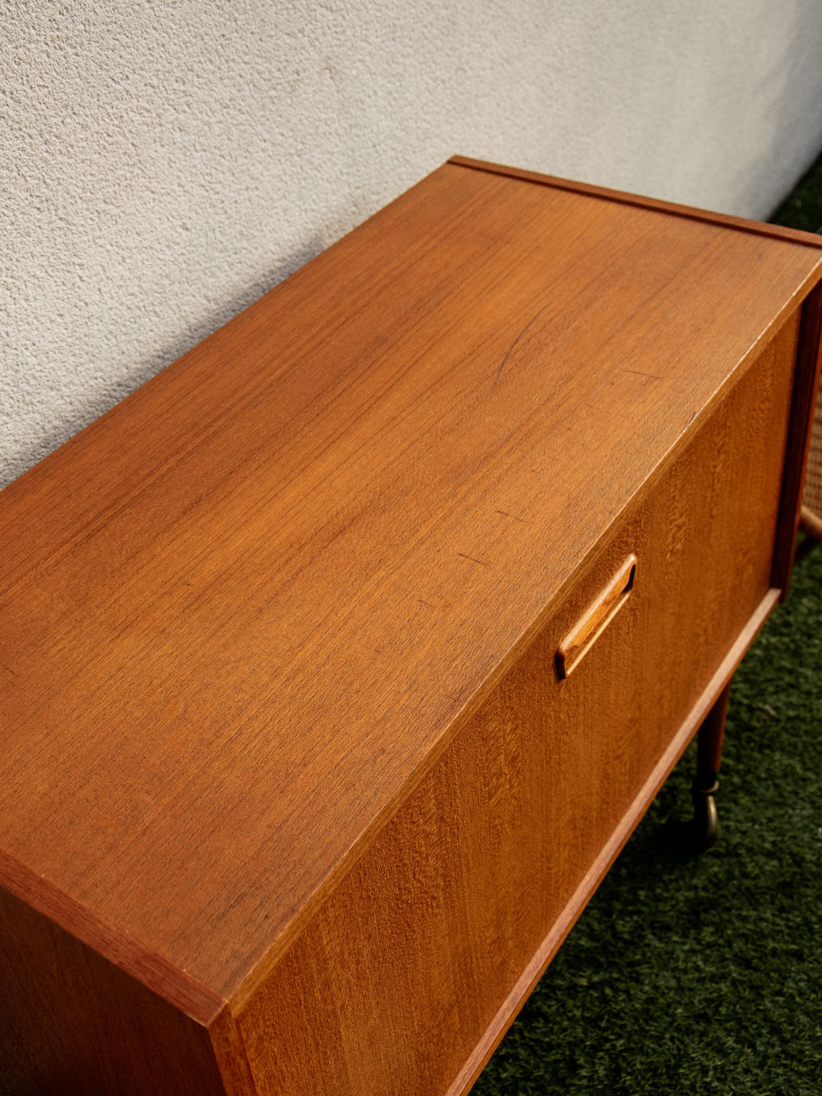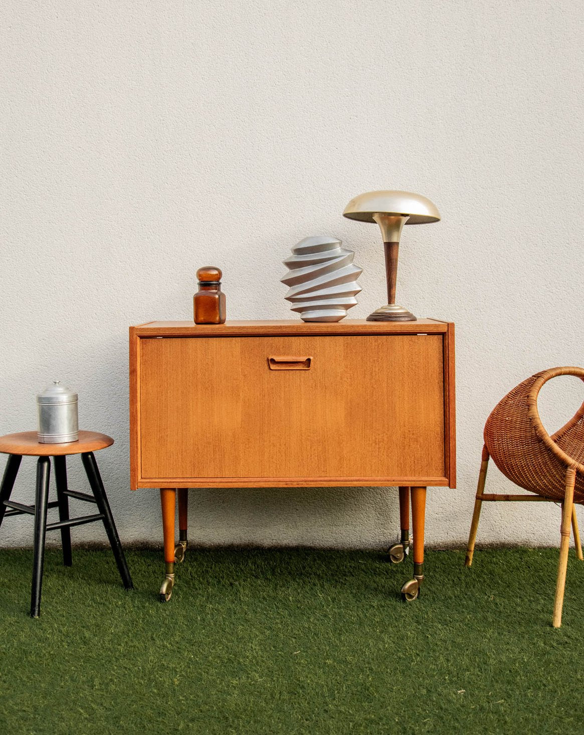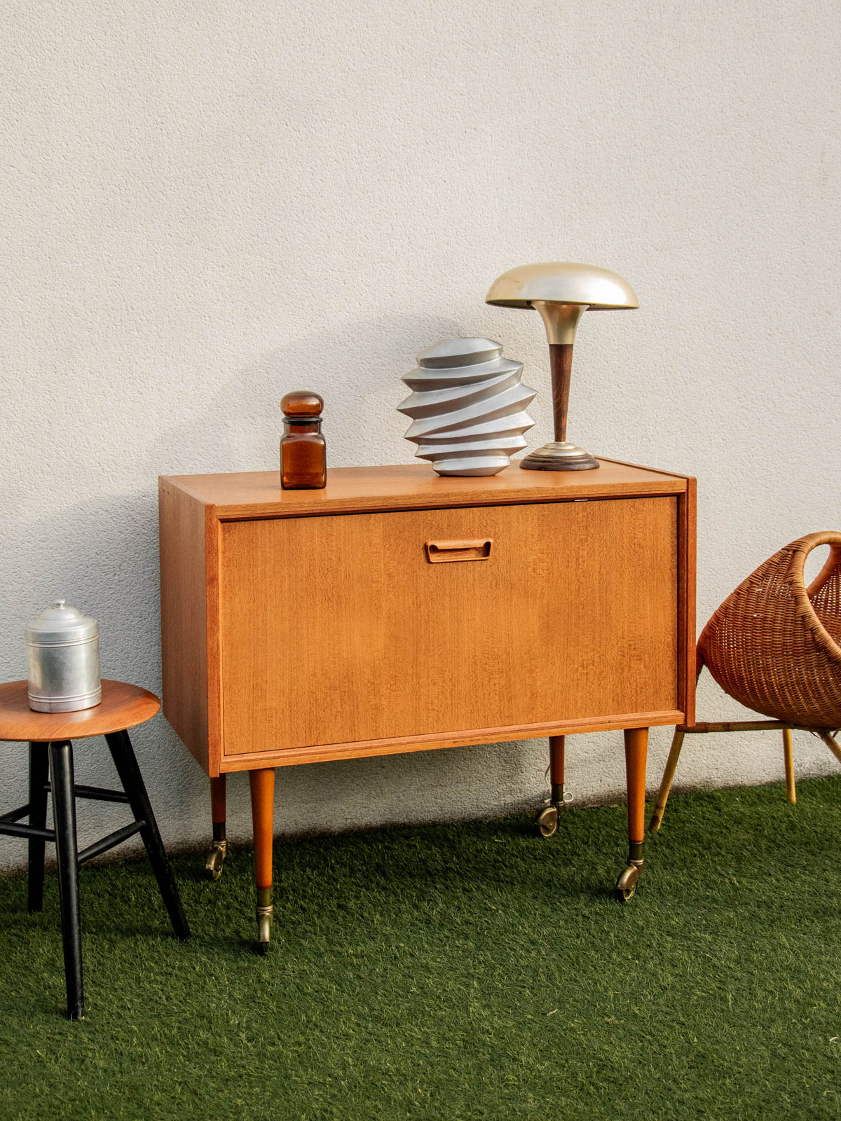 Découvrez ce meuble scandinave des années 60 en teck, posé sur ses roulettes d'origine et révélé par une belle patine chaleureuse. Il sert autant de meuble bar que de meuble TV ou de rangement, son abattant se transforme en plateau et l'aménagement intérieur modulable accueille vaisselle, bouteilles ou appareils, avec une ouverture arrière prévue pour le passage des câbles. Une lampe intégrée à tirette, typique du design nordique, fonctionne parfaitement. Lignes sobres et fabrication soignée pour une ambiance vintage élégante.