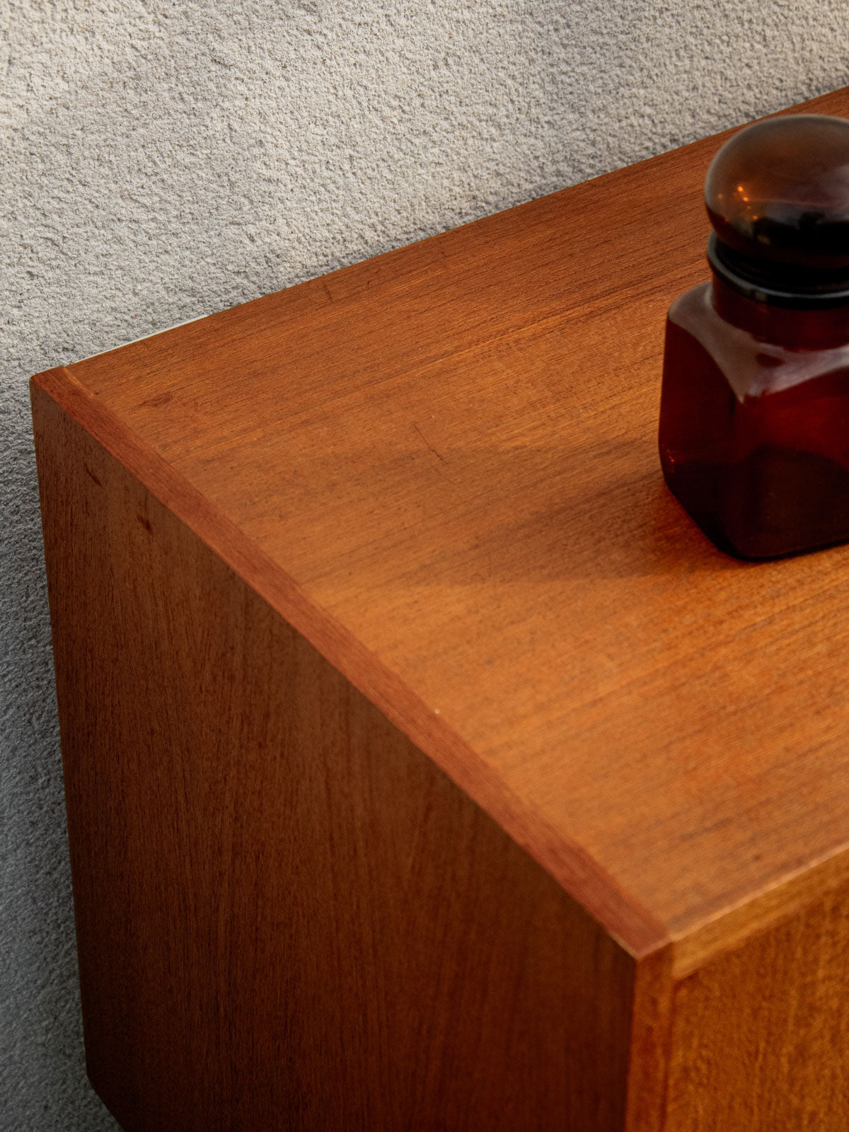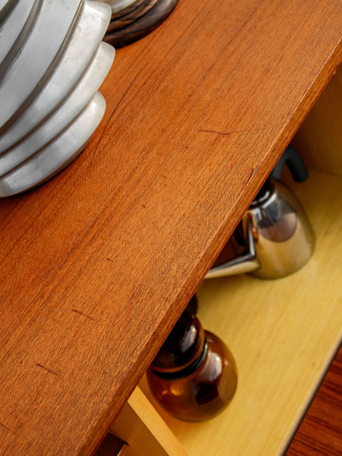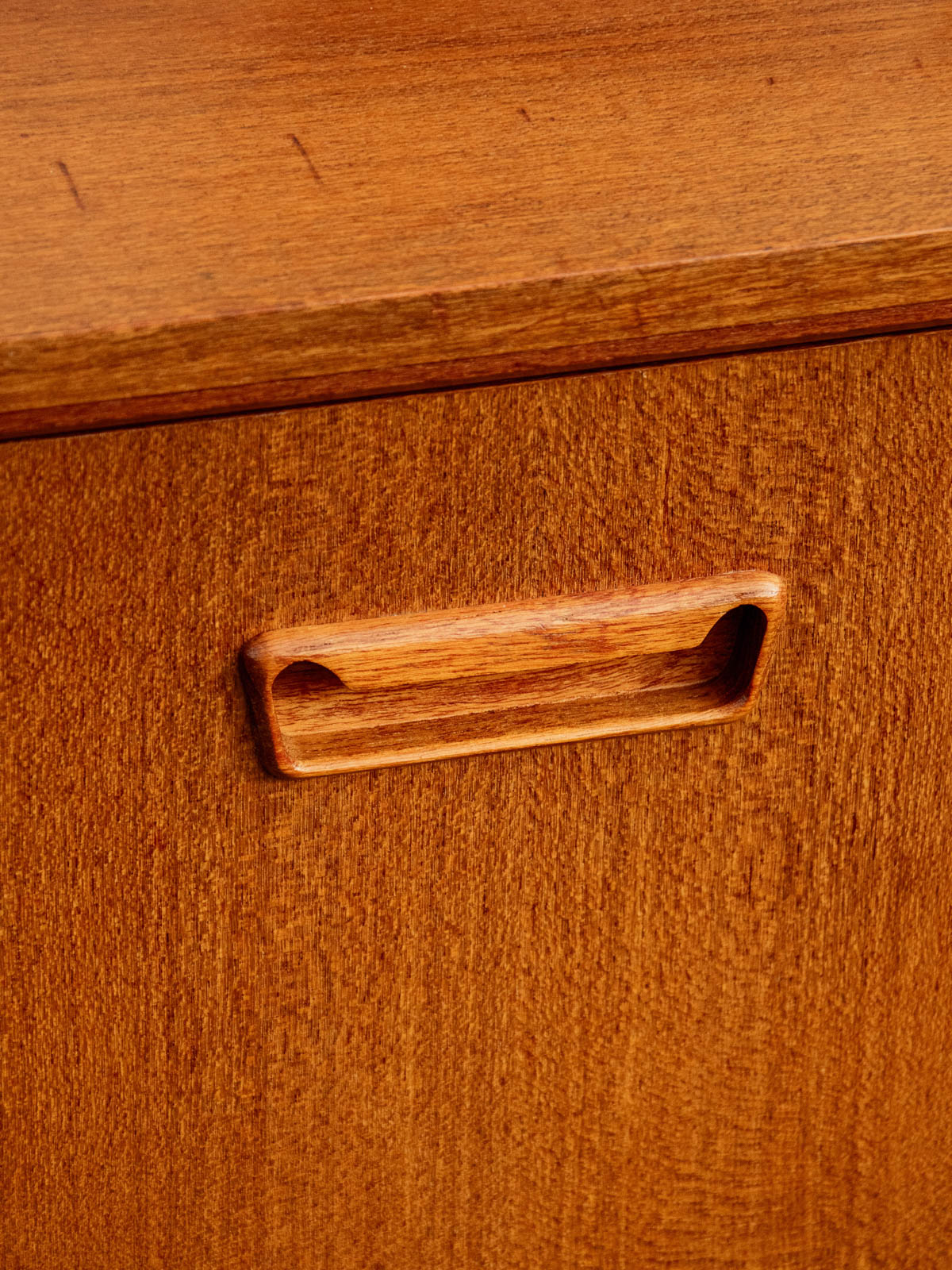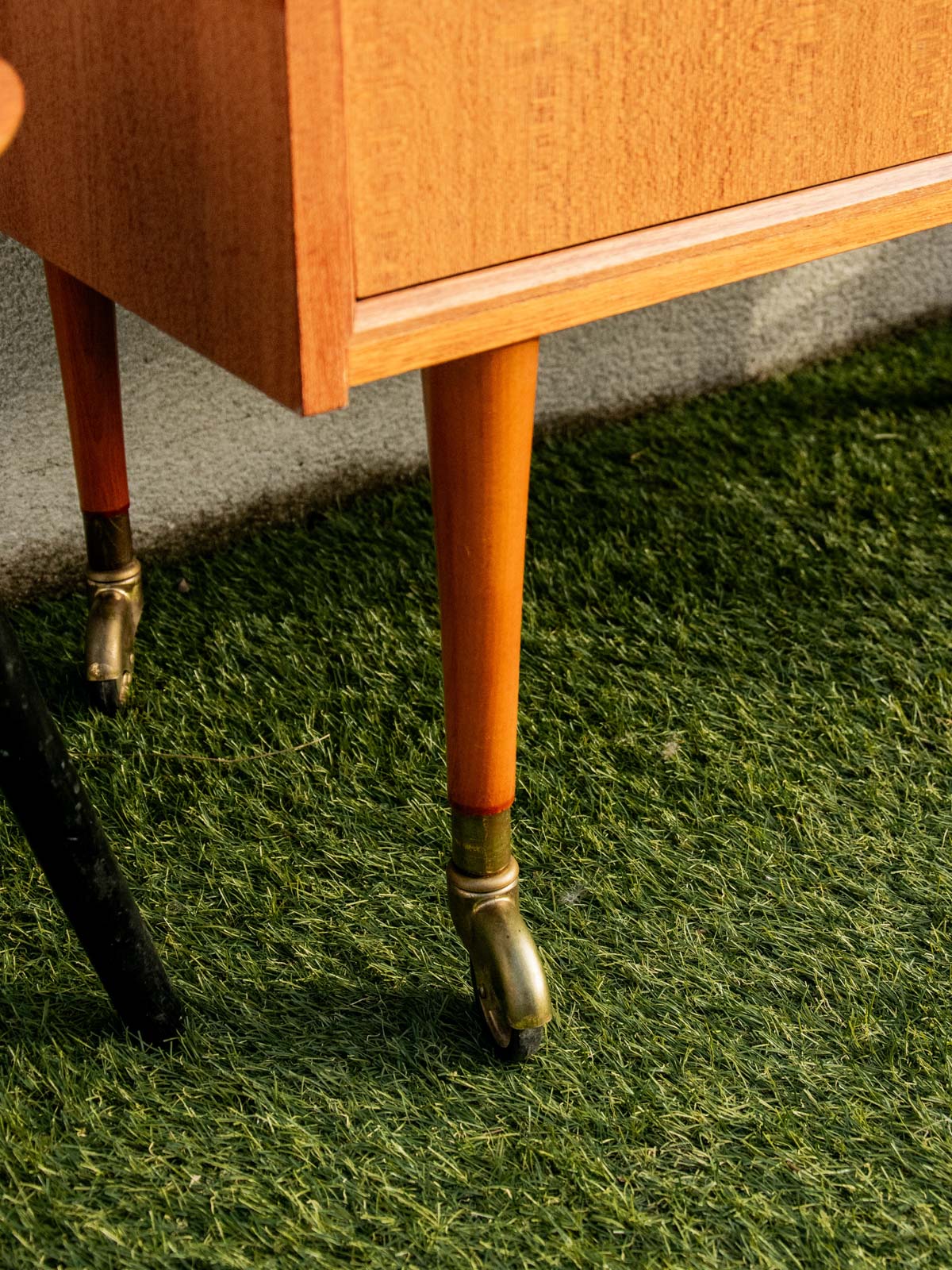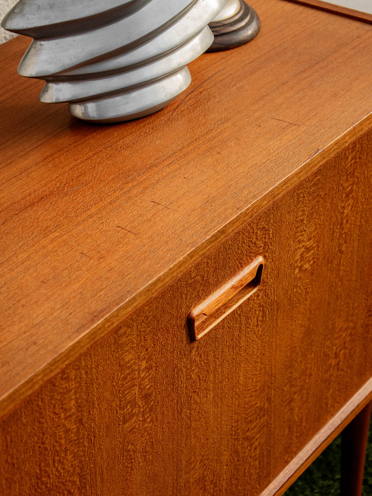 Découvrez ce meuble scandinave des années 60 en teck, posé sur ses roulettes d'origine et révélé par une belle patine chaleureuse. Il sert autant de meuble bar que de meuble TV ou de rangement, son abattant se transforme en plateau et l'aménagement intérieur modulable accueille vaisselle, bouteilles ou appareils, avec une ouverture arrière prévue pour le passage des câbles. Une lampe intégrée à tirette, typique du design nordique, fonctionne parfaitement. Lignes sobres et fabrication soignée pour une ambiance vintage élégante.