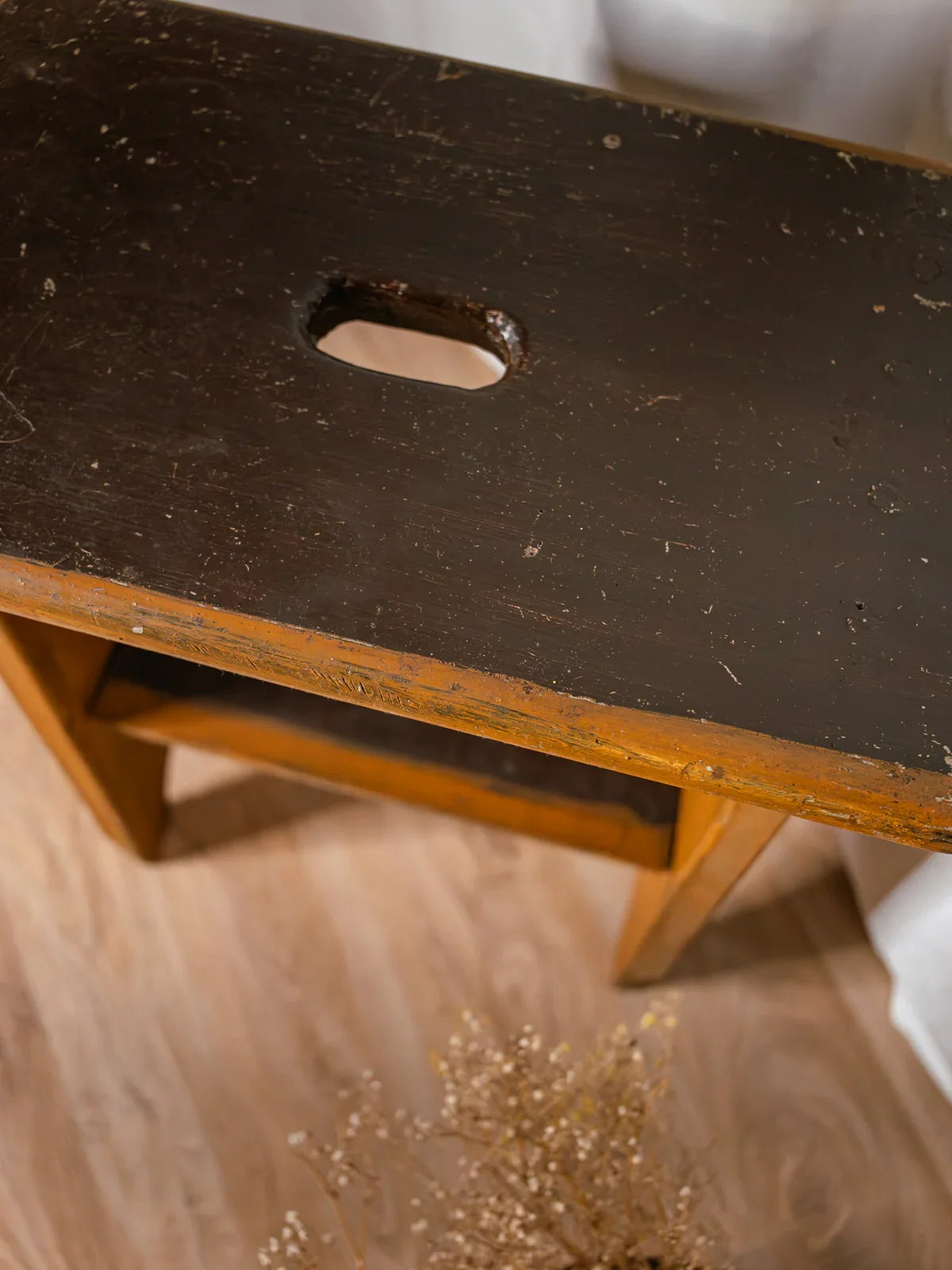 Adoptez ce tabouret d'atelier aux tons marron foncé et camel, doté d'une assise en bois patiné et d'une structure solide, animé d'un charme brut. Son assise compacte et sa construction stable en font une assise d'appoint idéale pour un coin de travail, une entrée ou un intérieur au style industriel et chaleureux. Il apporte une présence simple et authentique, mêlant fonctionnalité et esthétique usée par le temps. Rayures et traces diverses du temps et de son service en atelier.