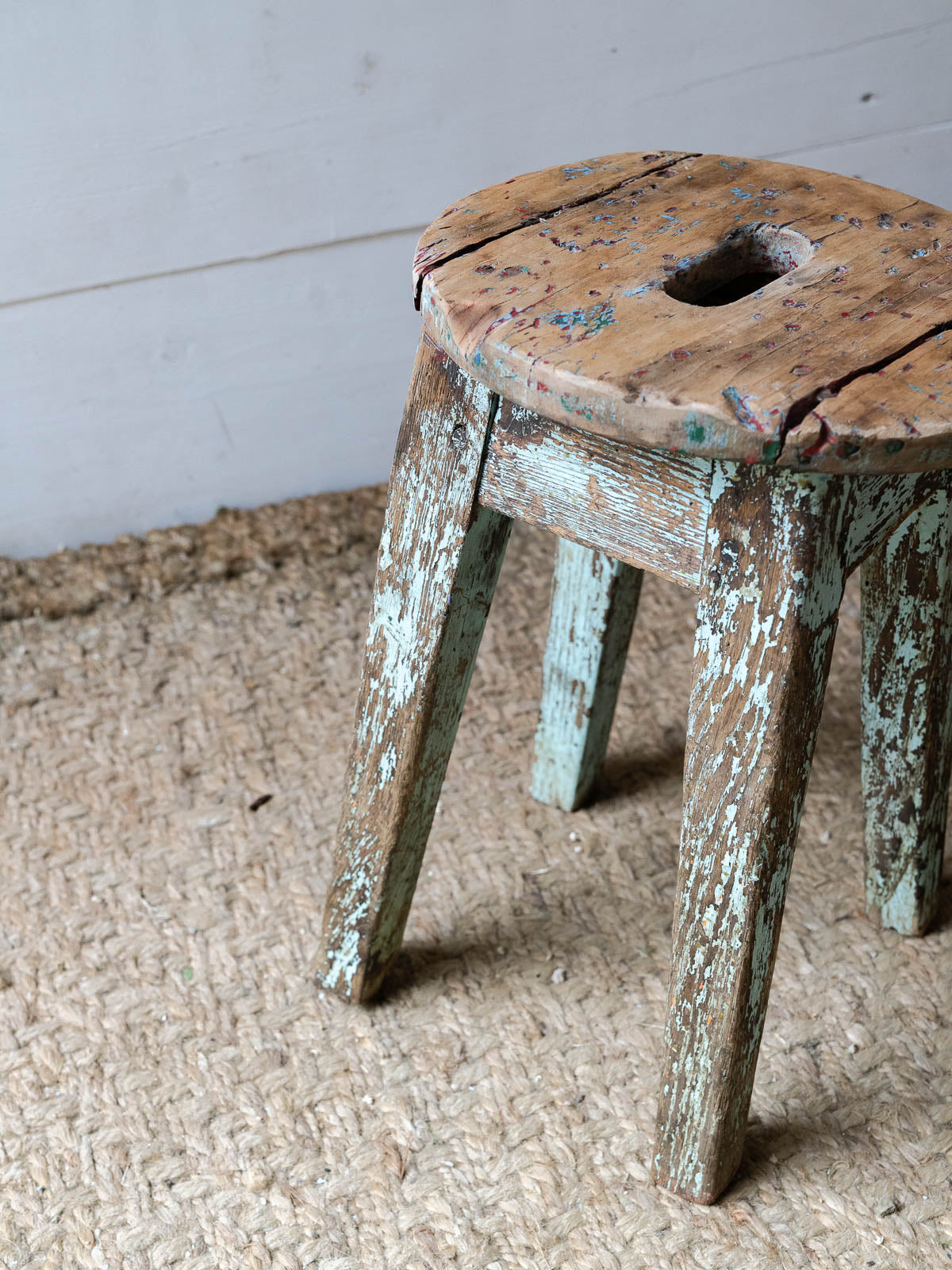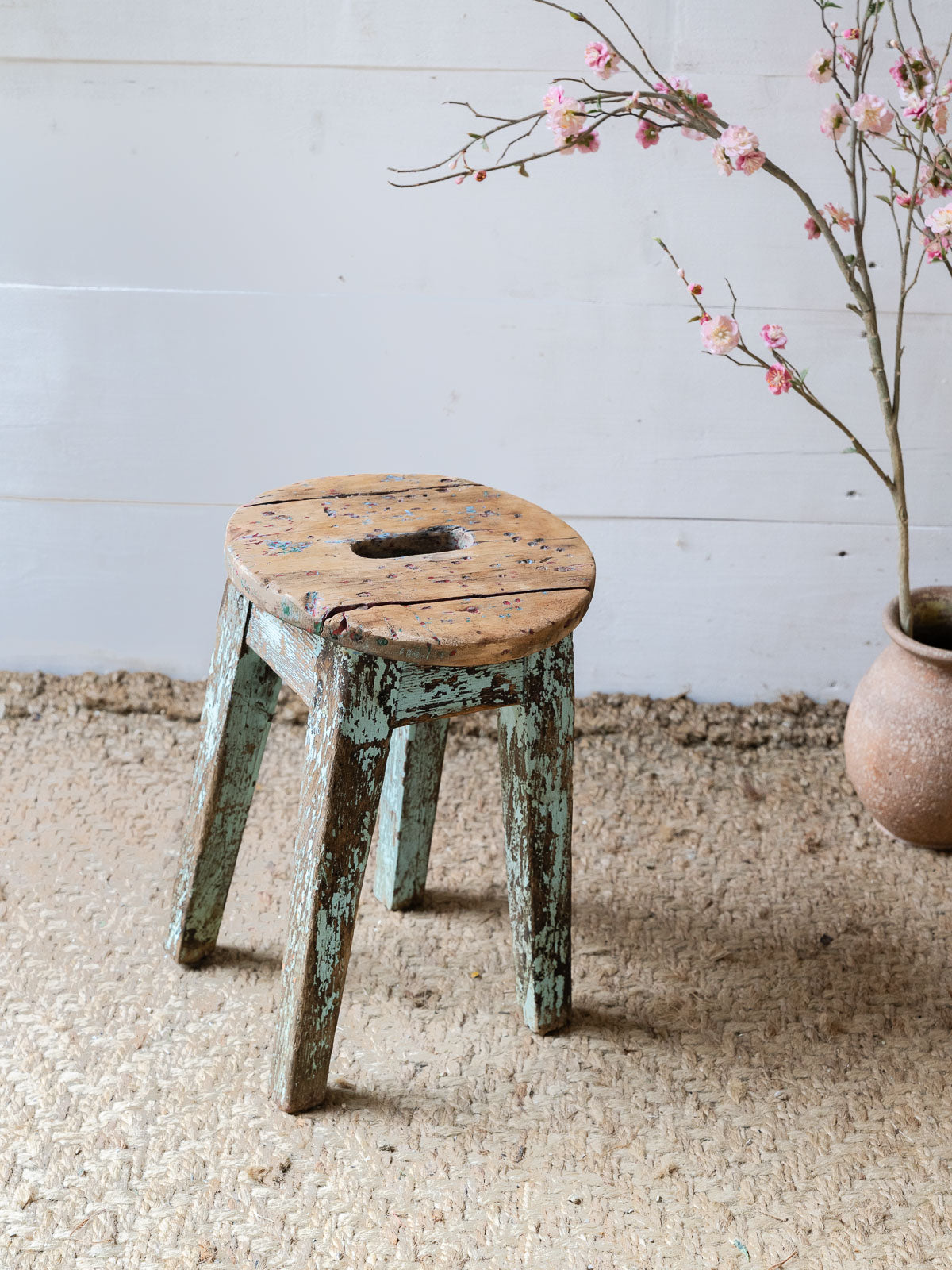 Adoptez ce tabouret ancien de couture au plateau rond en bois et aux pieds patinés d'un vert menthe délicat, qui apporte une note vintage et élégante à votre intérieur. Conçu en bois massif, il offre une assise polyvalente — siège d'appoint, support pour une plante ou tablette basse pour une lampe — tandis que sa légère inclinaison raconte son passé artisanal. Quelques traces du temps présentes.