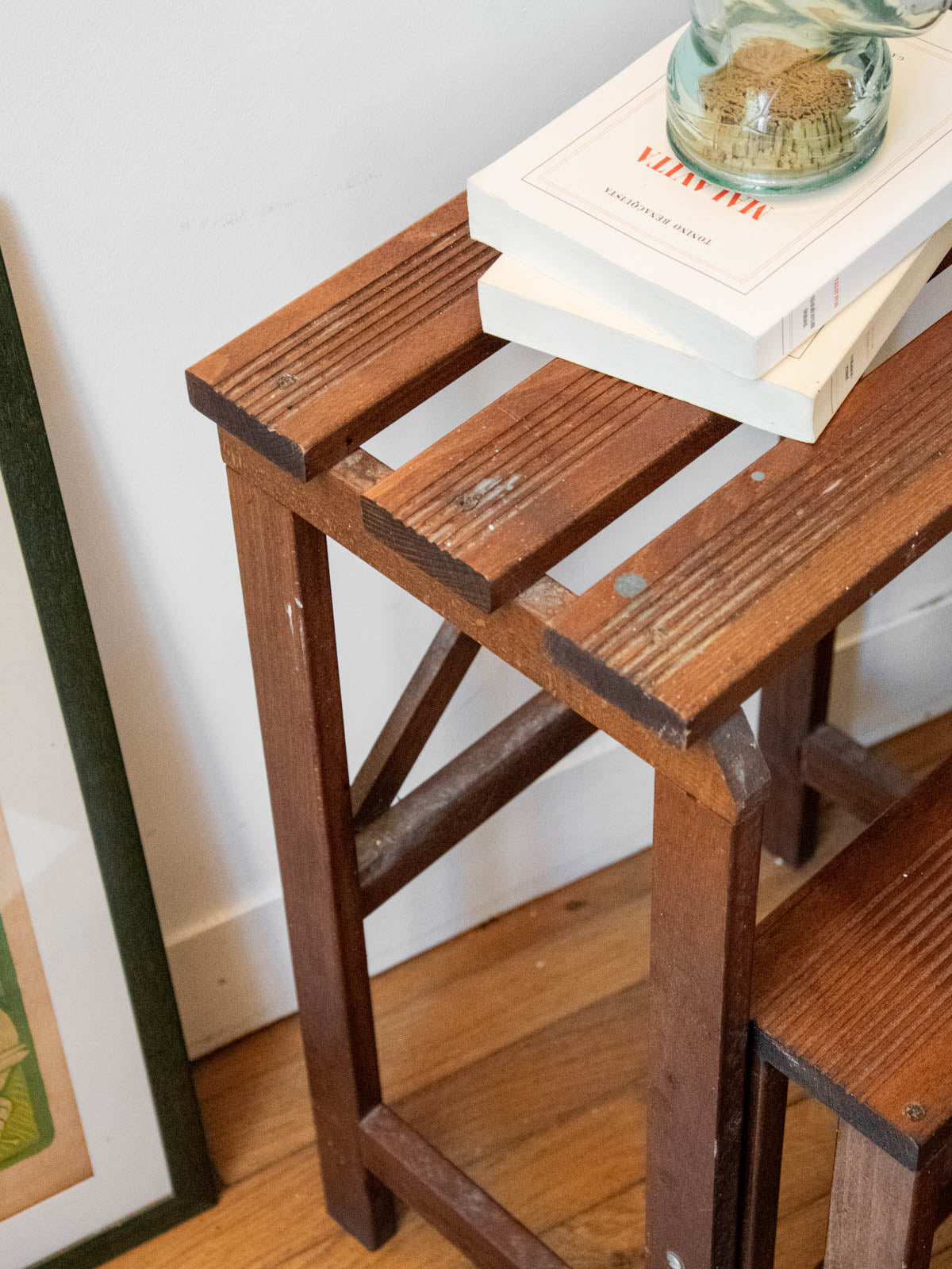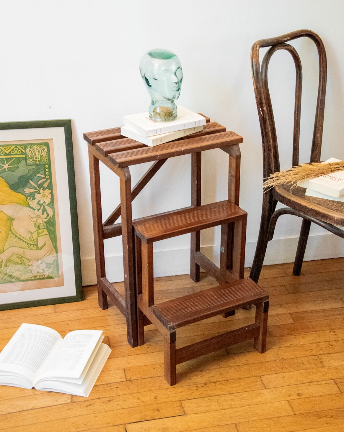Adoptez cet escabeau en bois ancien, idéal comme meuble de bibliothèque, marche-pied ou support pour plantes. Sa structure en bois patiné révèle une teinte chaleureuse et des lignes sobres qui s'intègrent aussi bien à un intérieur contemporain qu'à une atmosphère plus rustique. Son format compact offre une assise stable et des marches suffisantes pour atteindre des étagères basses ou exposer un petit assortiment de pots et livres, apportant une touche conviviale et verticale à votre pièce. Quelques traces d'usure visibles sur les photos.
