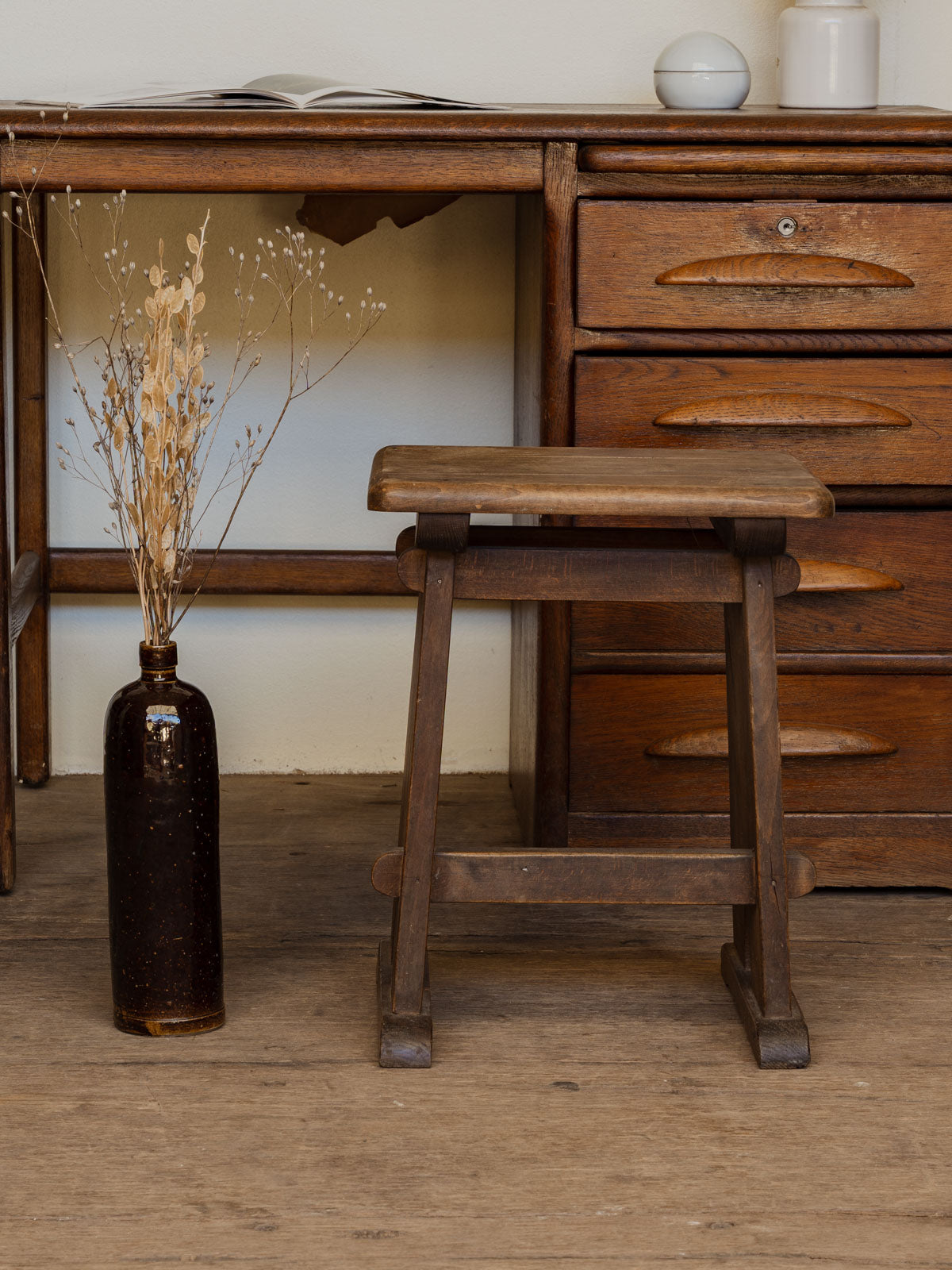 Adoptez ce tabouret ancien en chêne au travail raffiné. Ses lignes sobres et sa structure robuste racontent un savoir-faire artisanal, offrant une assise stable qui s'intègre naturellement dans une cuisine, un atelier ou un salon. La chaleur du bois et la patine légère apportent une présence chaleureuse et élégante, parfaite pour compléter une décoration vintage ou contemporaine, tandis que les détails de tournage soulignent son authenticité.