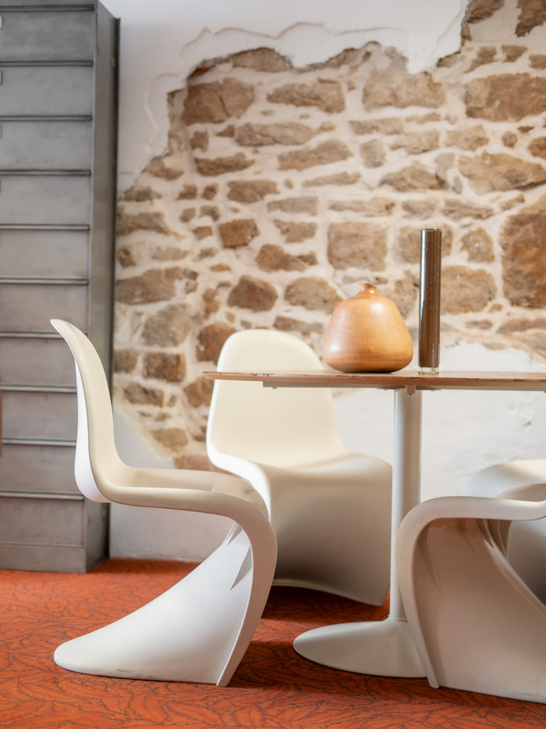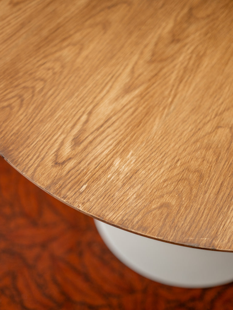Découvrez cette charmante ancienne table à manger au design rétro, dotée d'un élégant pied central tulipe en métal et d'un chaleureux plateau en bois. Sa forme ronde en font un espace convivial jusqu'à 5 personnes pour partager des repas en famille ou entre amis. Bien que le plateau présente quelques traces d’usure, celles-ci ajoutent au caractère authentique de la pièce. Idéale pour les amateurs de décoration vintage, elle allie esthétique et fonctionnalité avec brio.