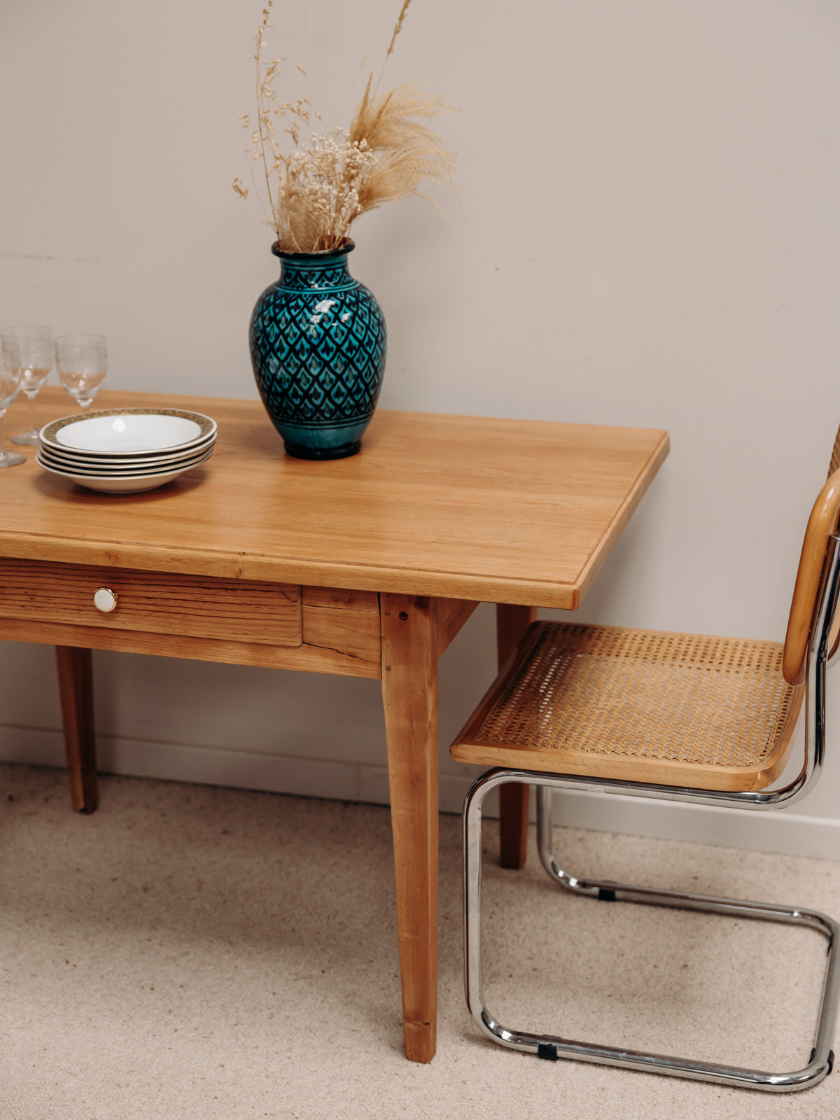 Optez pour cette table de ferme en bois clair au charme naturel, pensée pour apporter chaleur et simplicité à la salle à manger. Un tiroir discret, orné d'une poignée blanche, offre un rangement malin pour les ustensiles du quotidien. Vendue avec des dessous de pieds en verre qui rehaussent légèrement la table, ils libèrent l'espace pour les jambes tout en apportant une touche de légèreté contemporaine. Sa généreuse surface accueille confortablement 4 personnes, idéale pour les repas conviviaux et le quotidien. Les lignes sobres et la belle patine du bois créent une ambiance authentique et lumineuse.