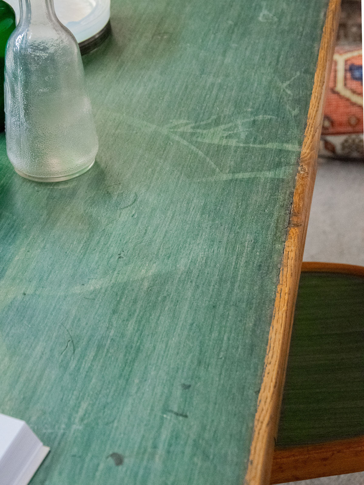 Sublimez votre salle à manger avec cette table en bois à placage vert qui marie élégance et chaleur. Pensée pour accueillir 6 à 8 convives, elle se déploie grâce à deux rallonges coulissantes et conserve un tiroir discret orné d'un bouton en zinc, pratique pour les petits rangements. Sa patine naturelle et son plateau légèrement marqué lui confèrent une allure authentique et intemporelle, idéale pour des repas conviviaux et une décoration raffinée. Légères traces du temps présentes, notamment sur le plateau.