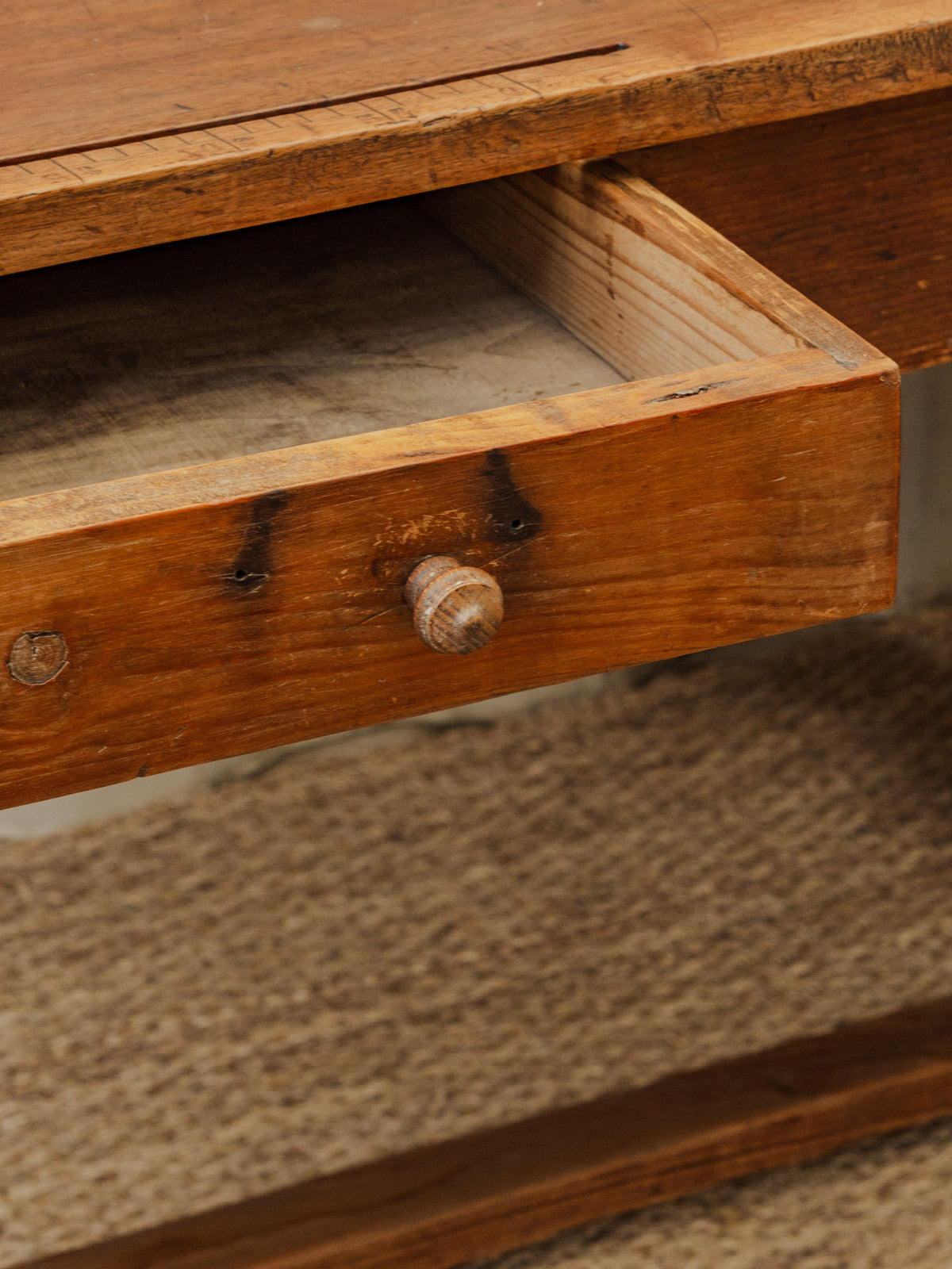 Découvrez cette table en chêne, héritage d'un atelier de tailleur au charme sobre et travaillé. Ses proportions permettent d'accueillir confortablement six à huit convives et son unique tiroir pratique offre un rangement discret pour outils ou ustensiles. Le bois et les marques de mesure gravées sur le plateau racontent une histoire artisanale, apportant caractère et chaleur à une salle à manger ou à un espace de création. Quelques traces du temps présentes qui font son authenticité.