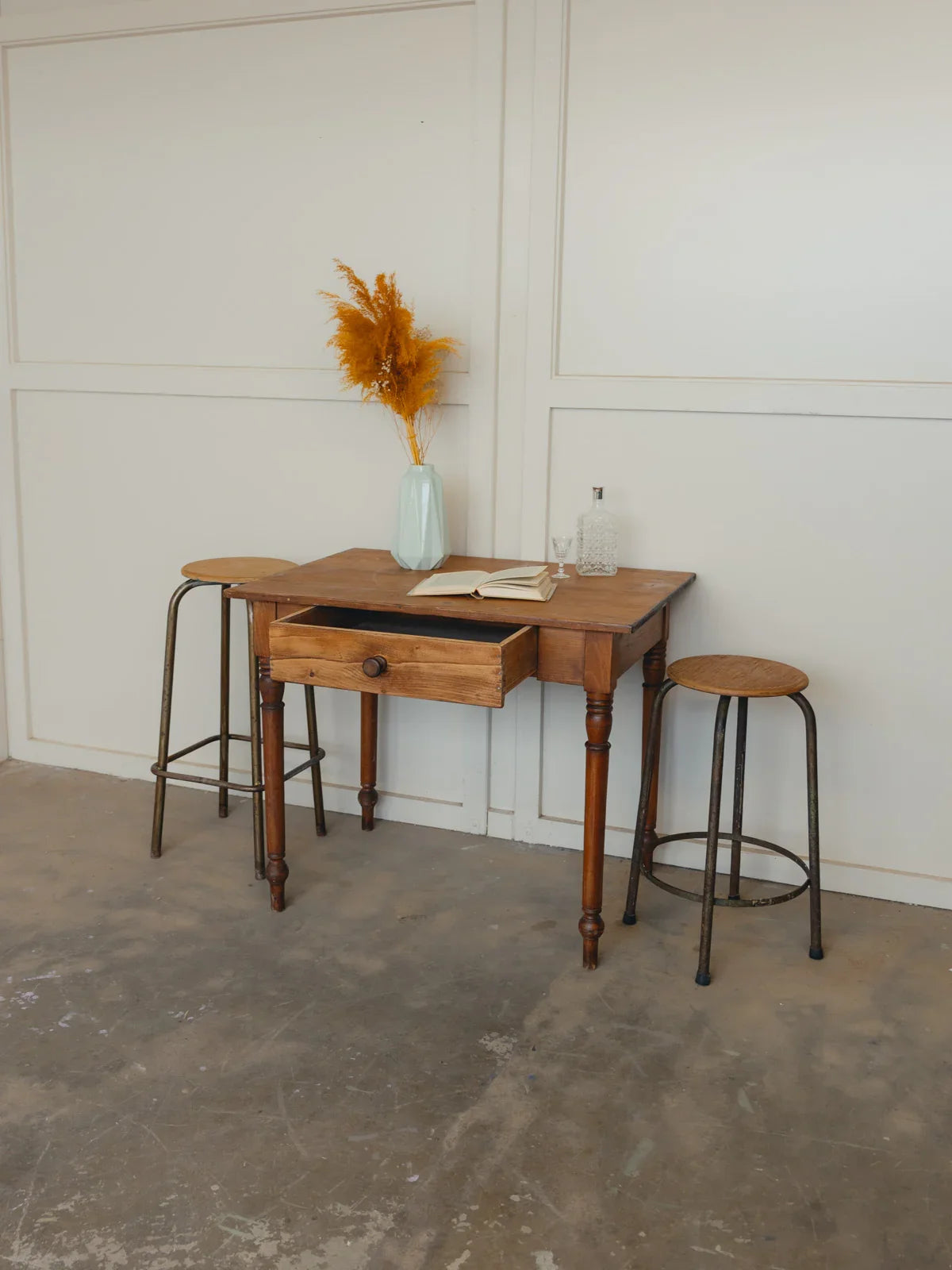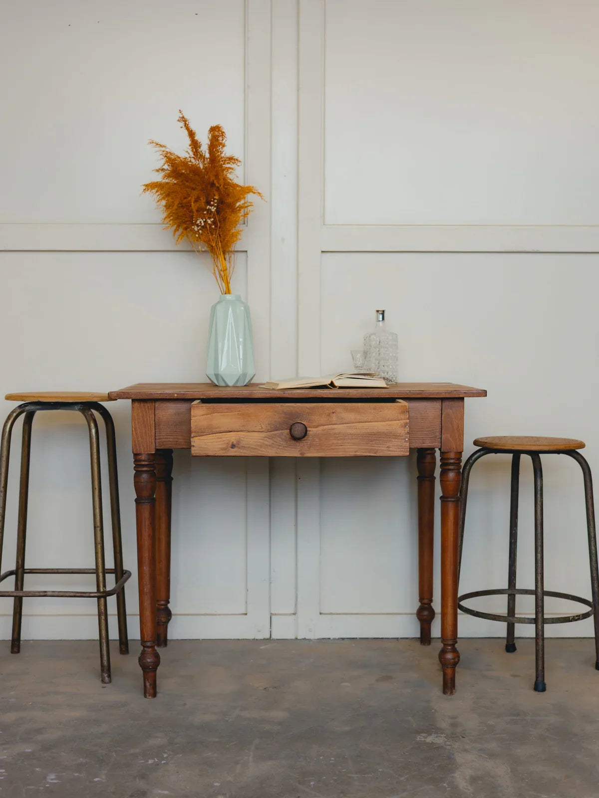 Adoptez cette table de ferme en bois massif au charme rustique et aux lignes sobres, pour 2 à 4 convives, idéale pour instaurer une ambiance chaleureuse et conviviale dans une cuisine ou une salle à manger. Sa largeur généreuse et son tiroir haut offrent un plan de travail fonctionnel et un rangement discret pour vos ustensiles ou linges de table, tandis que le plateau patiné révèle une belle matière et une présence authentique. Petites traces du temps présentes et tiroir légèrement raide à l'ouverture.